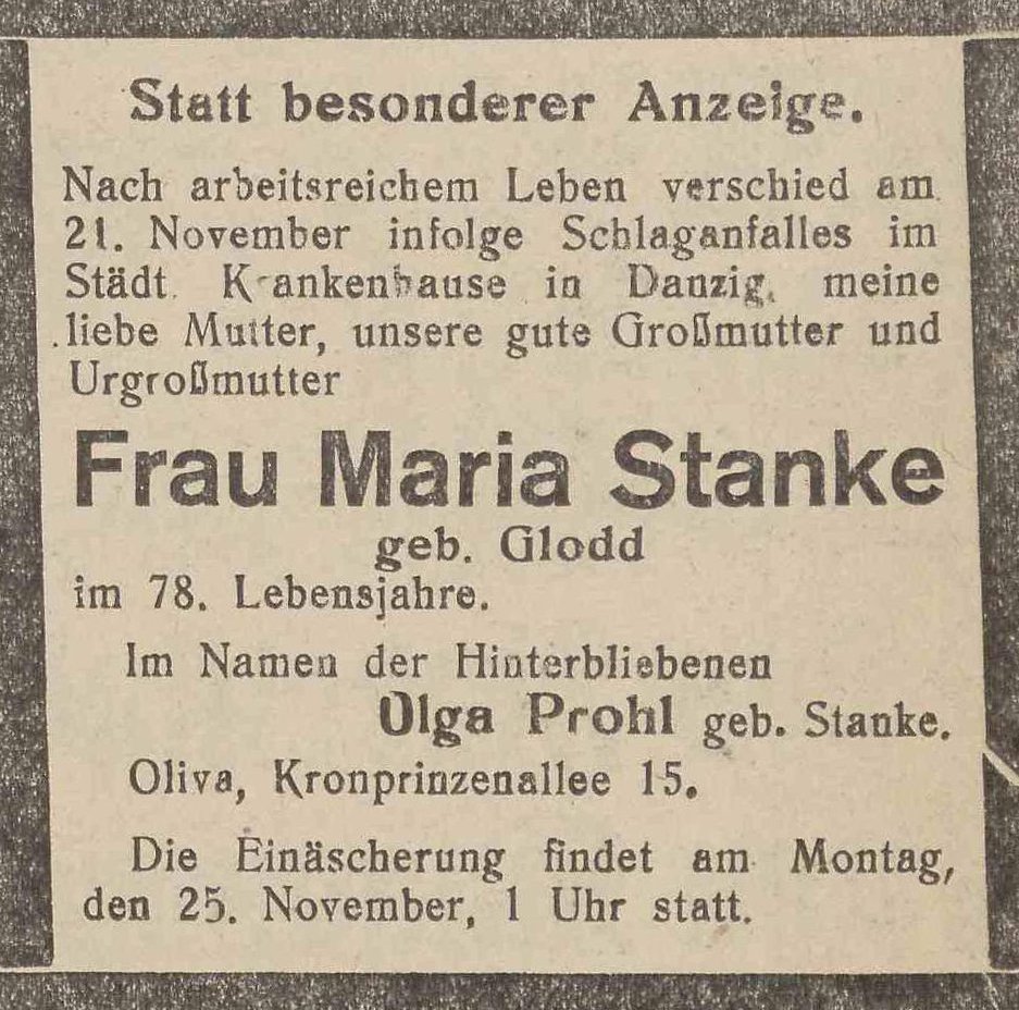 Maria Stanke zd. Glodd. Olga Prohl zd. Stanke. Olivaer Zeintung nr 274 z 22. 11. 1929 r.