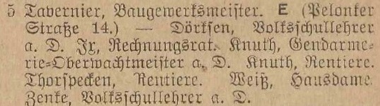 Gustav Tavernier. Przez wiele lat właściciel budynków nr 12-14 przy ulicy Pelonker Straße (Polanki), willi "Louise", "Viktoria" i "Elisabeth" przy ul. Kronprinzenallee (Wita Stwosza) oraz domów nr 7 do 9 przy ul. Georgstraße (Obrońcow Westerplatte). Był też właścicielem domów nr 3-8 przy ul. Paulastraße (Witkiewicza).