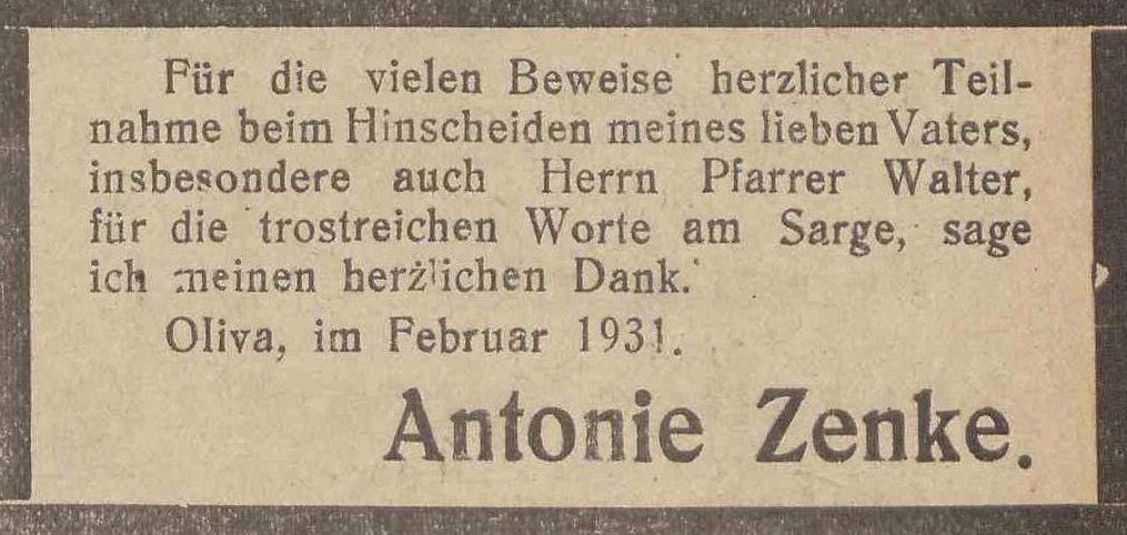 Antonie Zenke. Danzig-Olivaer Zeintung nr 29 z 04. 02. 1931 r.