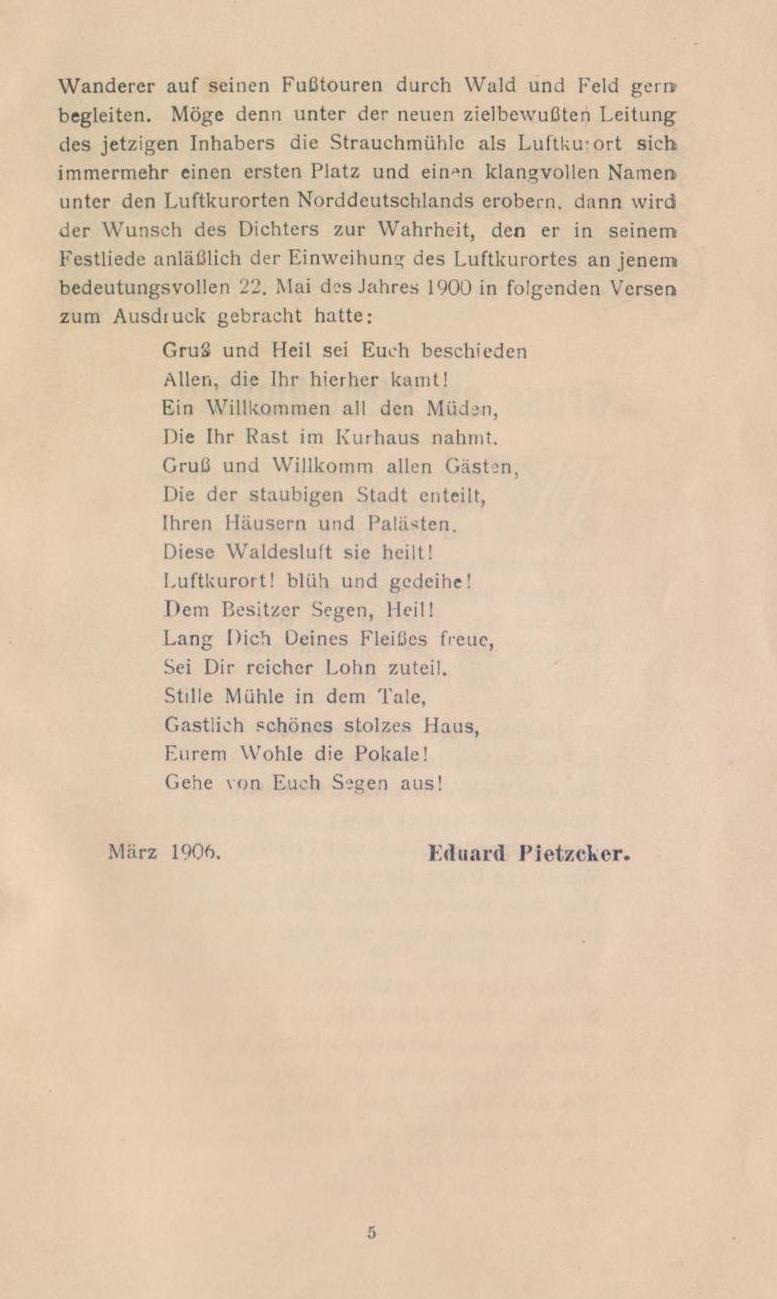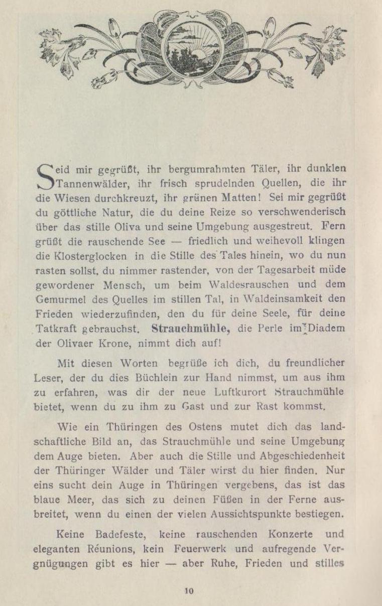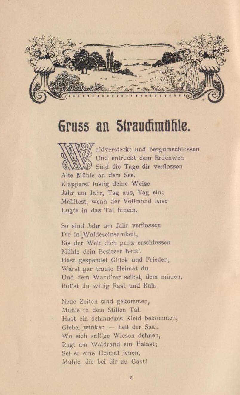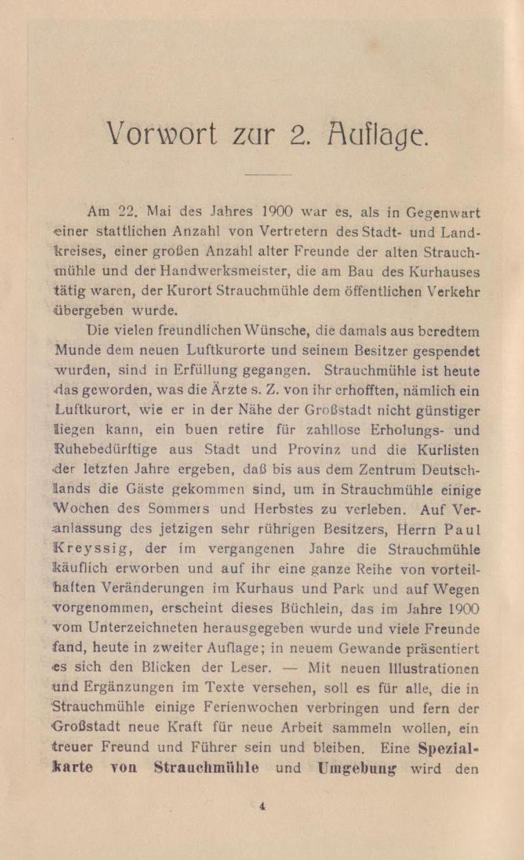 Mit diesen Worten begrüße ich dich, du freundlicher Leser, der du dies Büchlein zur Hand nimmst, um aus ihm zu erfahren, was dir der neue Luftkurort Strauchmühle bietet, wenn du zu ihm zu Gast und zur Rast kommst.