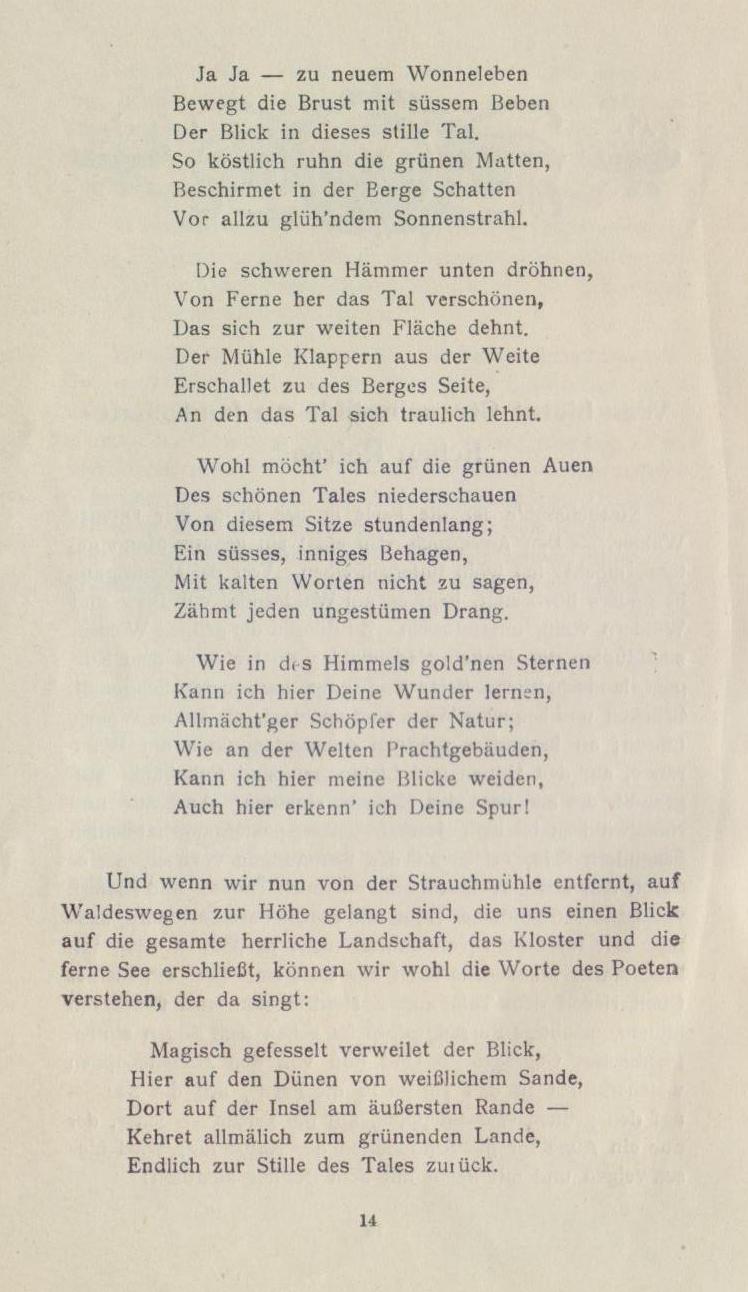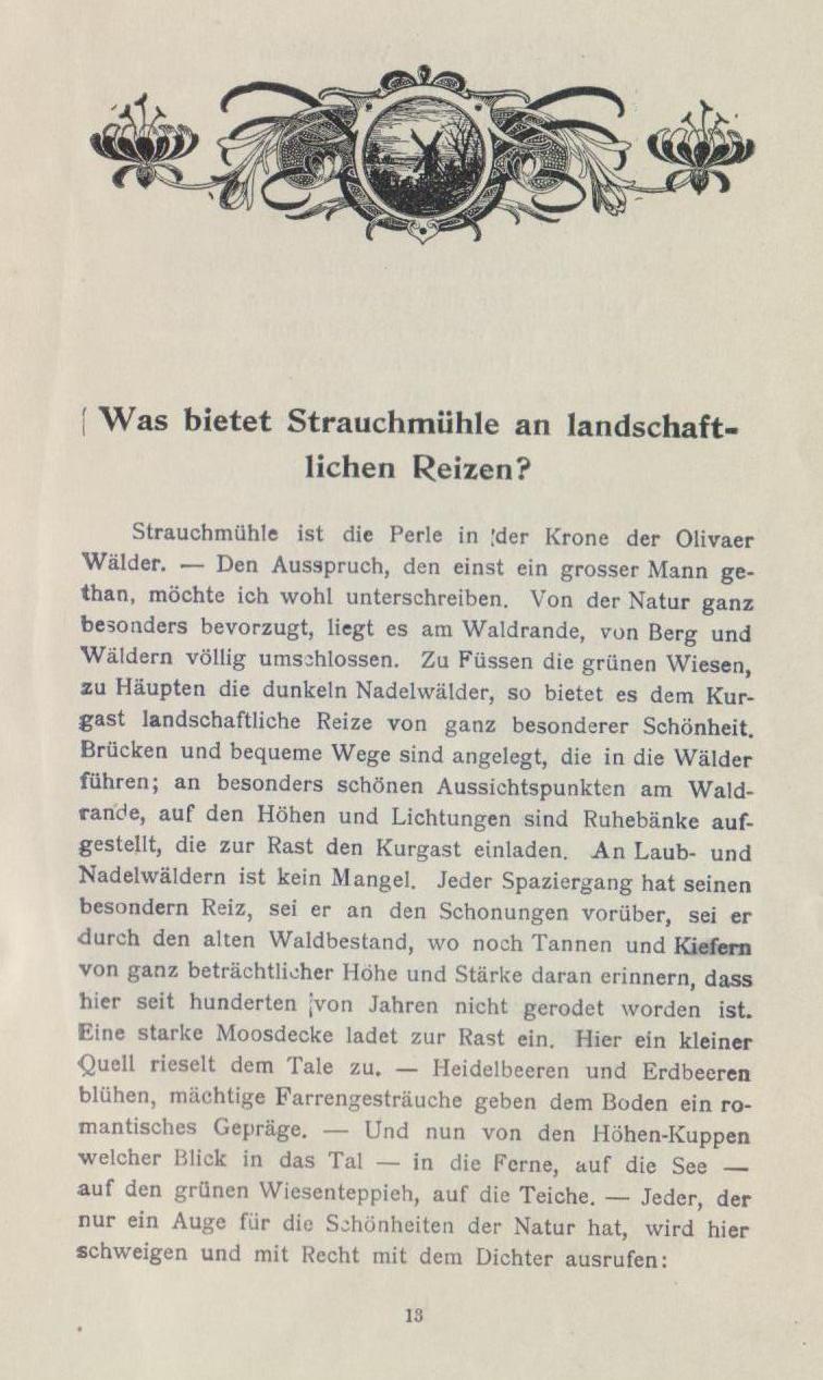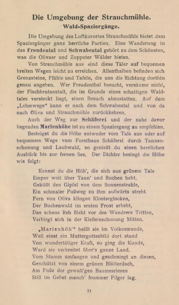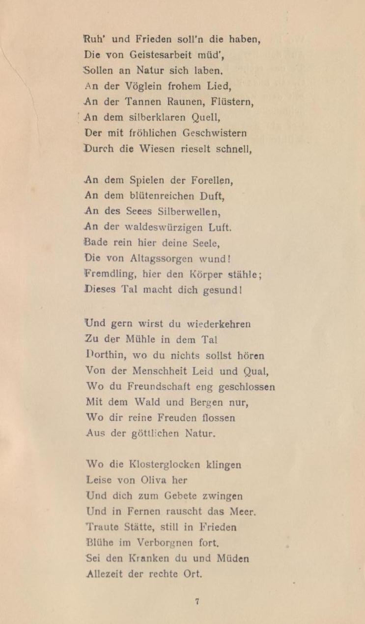 Seid mir gegrüßt, ihr bergumrahmten Täler, ihr dunklen Tannenwälder, ihr frisch sprudelnden Quellen, die ihr die Wiesen durchkreuzt, ihr grünen Matten! Sei mir gegrüßt du göttliche Natur, die du deine Reize so verschwenderisch über das stille Oliva und seine Umgebung ausgestreut. Fern grüßt die rauschende See — friedlich und weihevoll klingen die Klosterglocken in die Stille des Tales hinein, wo du nun rasten sollst, du nimmer rastender, von der Tagesarbeit müde gewordener Mensch, um beim Waldesrauschen und dem Gemurmel des Quelles im stillen Tal, in Waldeinsamkeit den Frieden wiederzufinden, den du für deine Seele, für deine Tatkraft gebrauchst. Strauchnüihle, die Perle im Diadem der Olivaer Krone, nimmt dich auf!