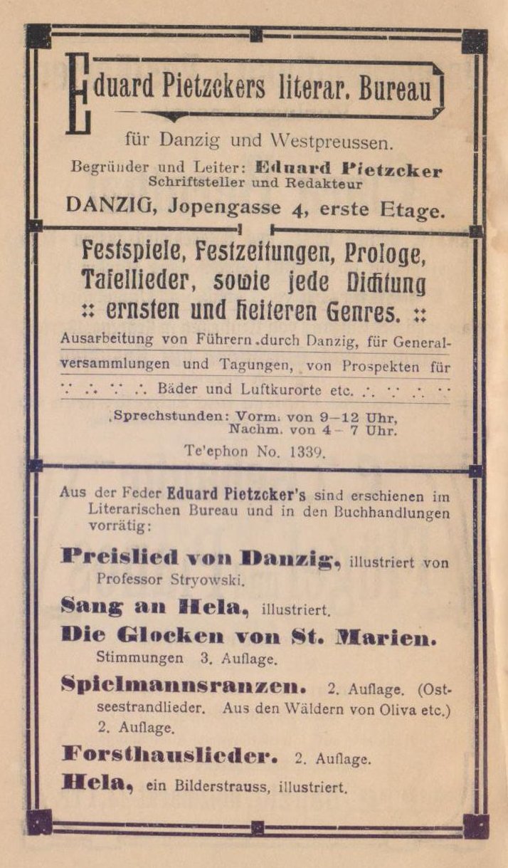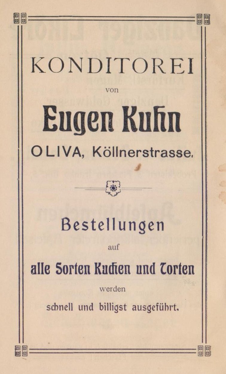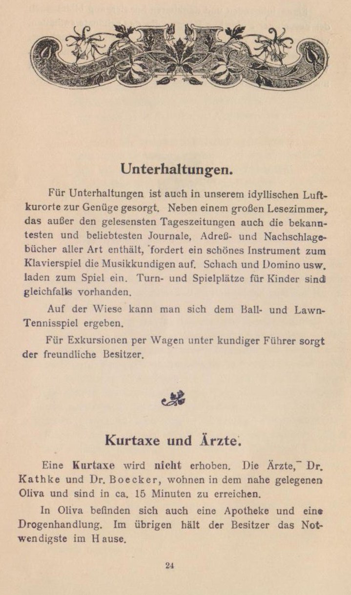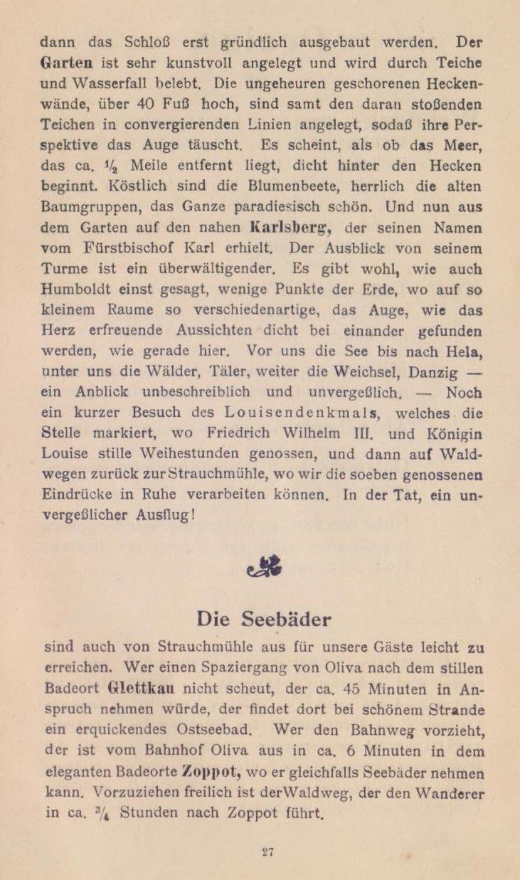 Seid mir gegrüßt, ihr bergumrahmten Täler, ihr dunklen Tannenwälder, ihr frisch sprudelnden Quellen, die ihr die Wiesen durchkreuzt, ihr grünen Matten! Sei mir gegrüßt du göttliche Natur, die du deine Reize so verschwenderisch über das stille Oliva und seine Umgebung ausgestreut. Fern grüßt die rauschende See — friedlich und weihevoll klingen die Klosterglocken in die Stille des Tales hinein, wo du nun rasten sollst, du nimmer rastender, von der Tagesarbeit müde gewordener Mensch, um beim Waldesrauschen und dem Gemurmel des Quelles im stillen Tal, in Waldeinsamkeit den Frieden wiederzufinden, den du für deine Seele, für deine Tatkraft gebrauchst. Strauchnüihle, die Perle im Diadem der Olivaer Krone, nimmt dich auf!