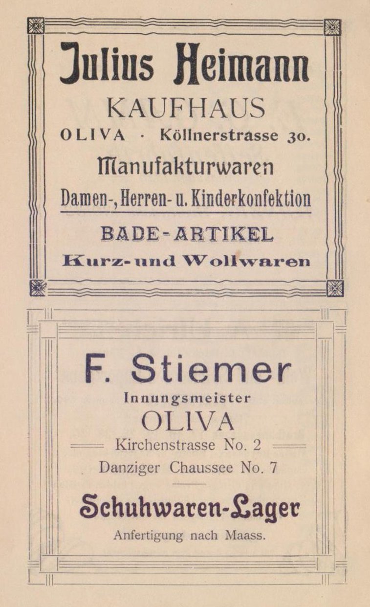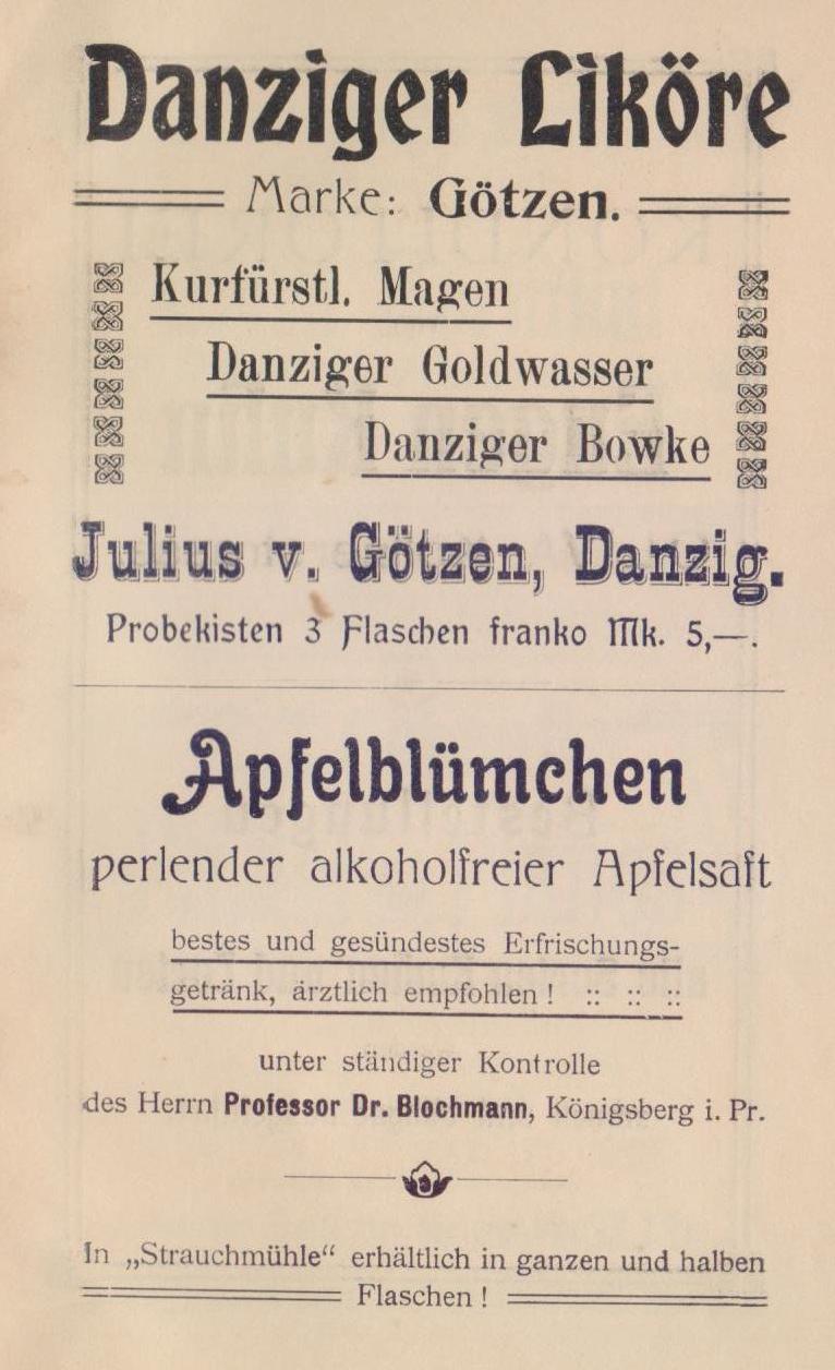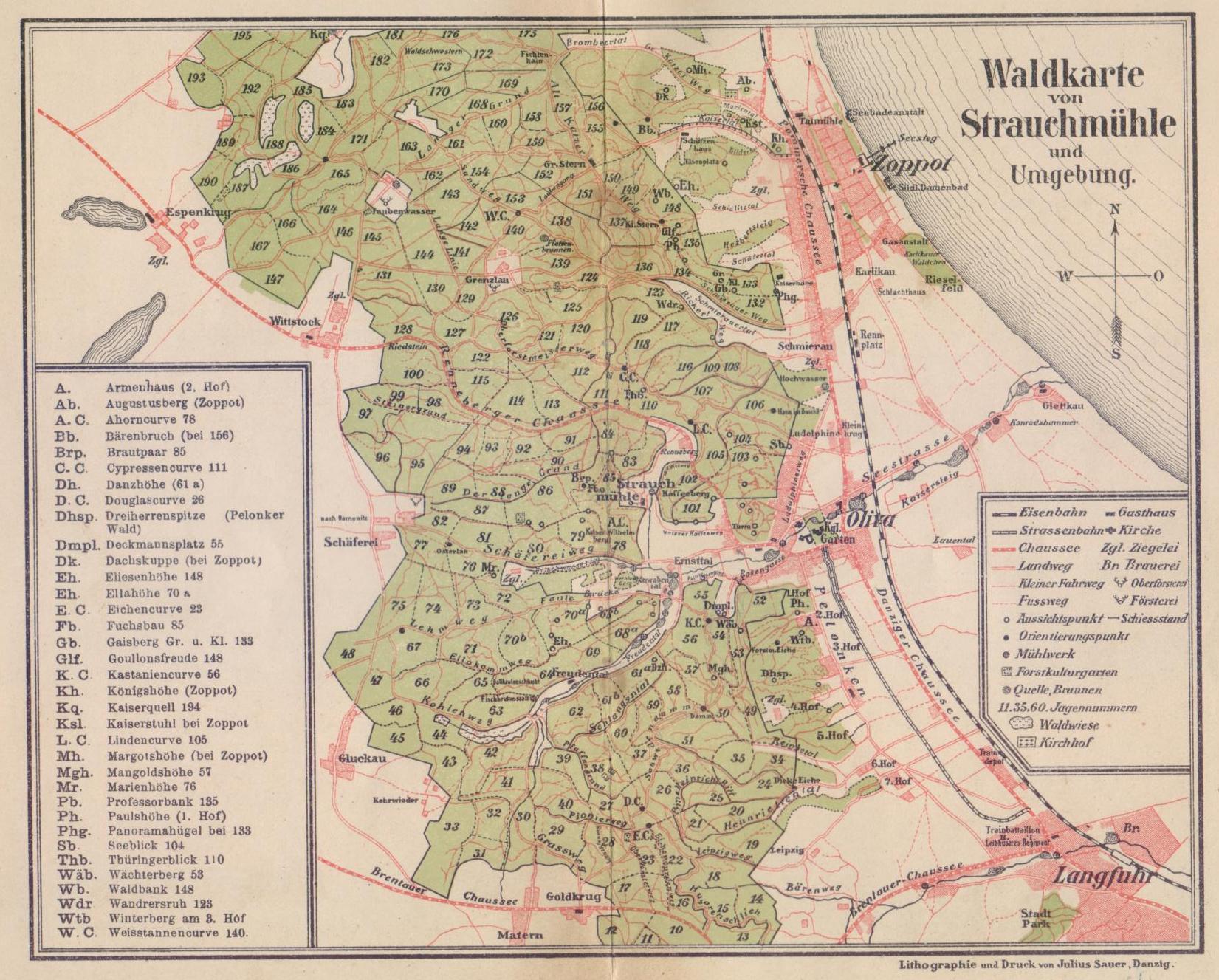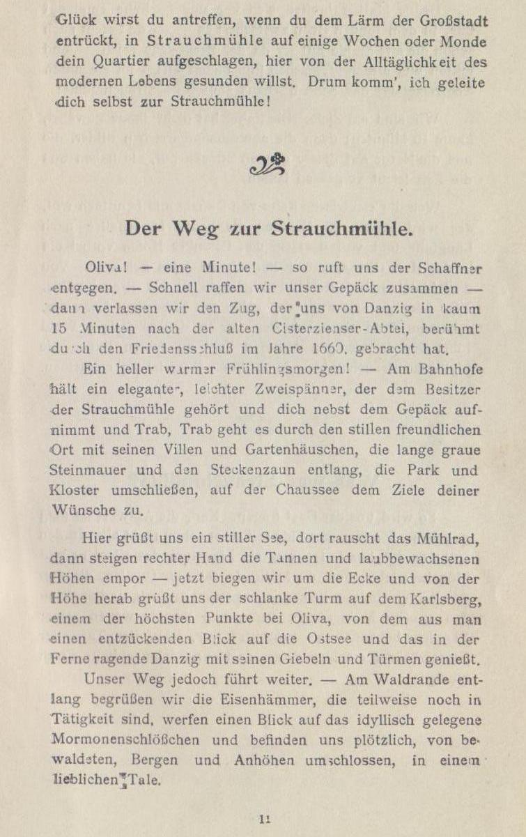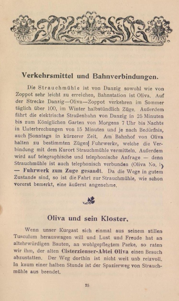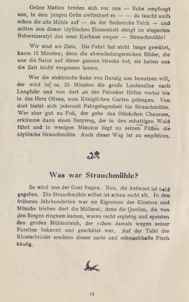 Wer die elektrische Bahn von Danzig aus benutzen will, der wird inj ca. 25 Minuten die große Lindenallee nach Langfuhr und von dort an den Pelonker Höfen vorbei bis in das Herz Olivas, zum Königlichen Garten gelangen. Von dort bietet sich jederzeit Fahrgelegenheit bis Strauchmühle. Wer aber gut zu Fuß, der gehe das Stückchen Chaussee, erklimme dann einen Bergweg, der in den schattigen Wald führt und in wenigen Minuten liegt zu seinen Füßen die idyllische Strauchmühle. Auch dieser Weg ist zu empfehlen.