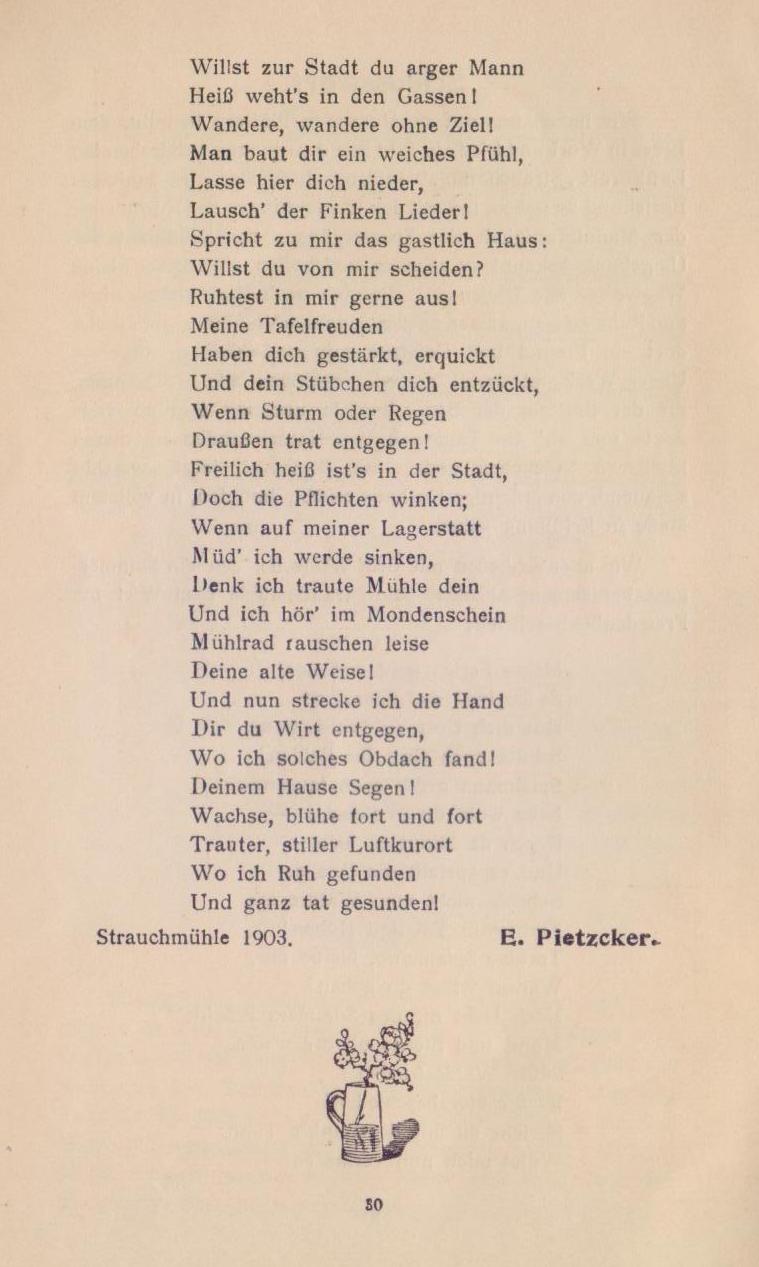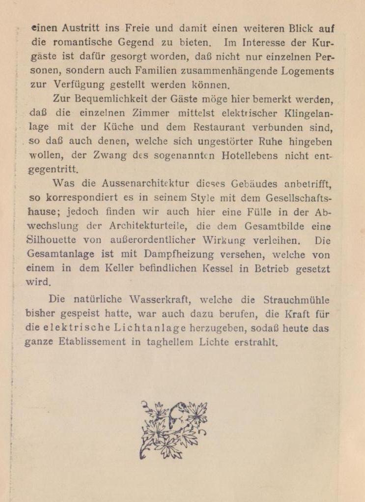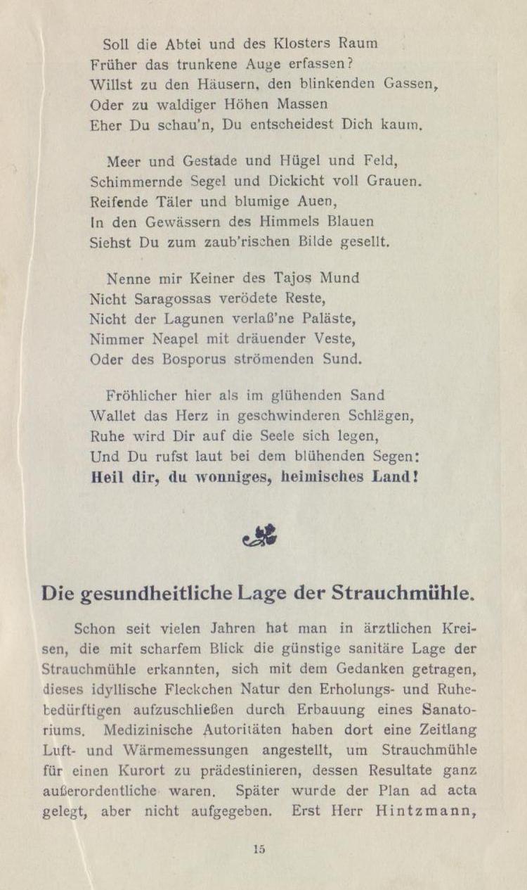 Keine Badefeste, keine rauschenden Konzerte und eleganten Reunions, kein Feuerwerk und aufregende Vergnügungen gibt es hier — aber Ruhe, Frieden und stilles Glück wirst du antreffen, wenn du dem Lärm der Großstadt entrückt, in Strauchmühle auf einige Wochen oder Monde dein Quartier aufgeschlagen, hier von der Alltäglichkeit des modernen Lebens gesunden willst. Drum komm’, ich geleite dich selbst zur Strauchmühle!