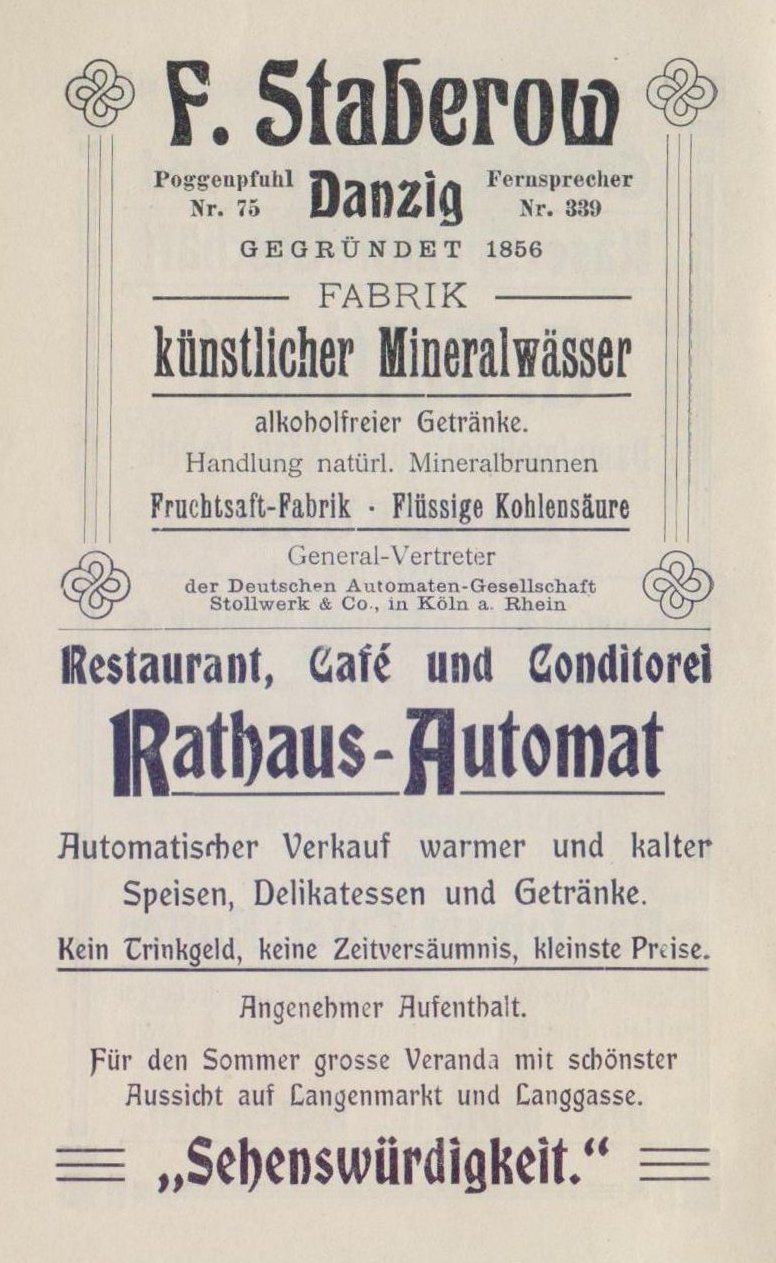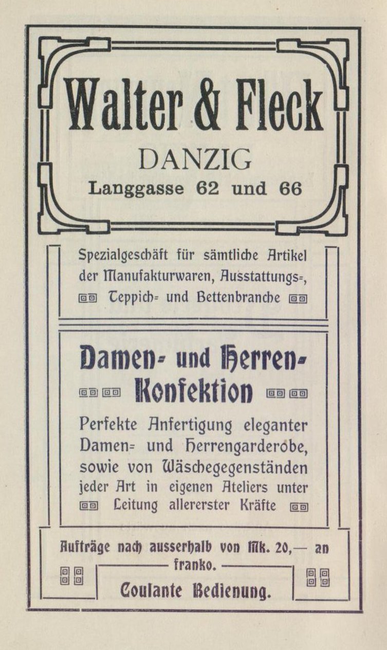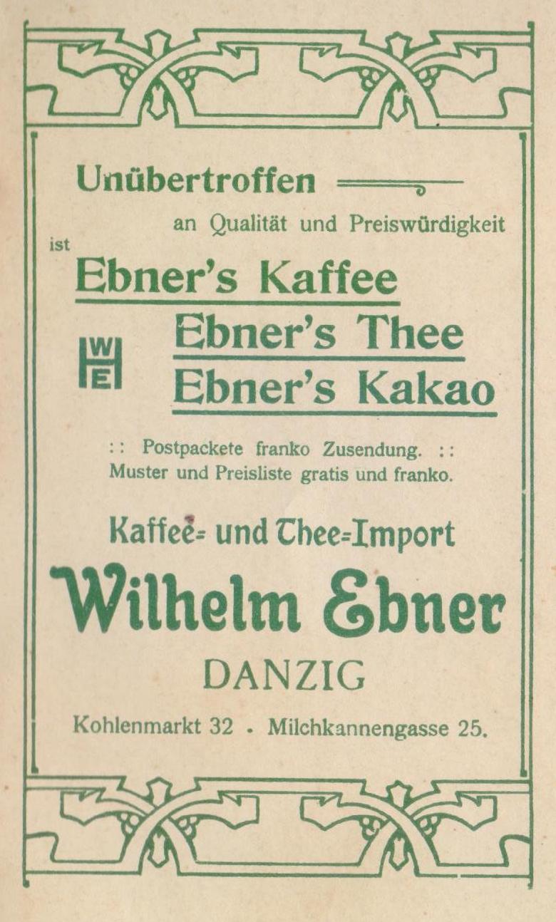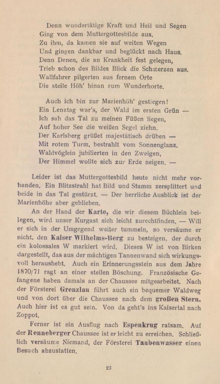 Tutaj wita nas spokojne jezioro, tam koła młyńskie trzciny, potem jodły i wysokości liściaste wznoszą się po prawej stronie - teraz wyginamy się za rogiem i z wysokości w dół smukła wieża na Karlsbergu, jeden z najwyższych punktów w pobliżu Oliwy, wita nas, z której roztacza się piękny widok na Bałtyk i Gdańsk z górującymi w oddali szczytami i wieżami.