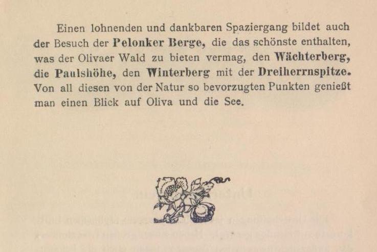 Witajcie mnie, wy górskie doliny, wy ciemne lasy jodłowe, wy świeżo tryskające źródła, które przecinają łąki, wy zielone maty! Przywitajcie mnie wy, boska natura, którą tak obficie rozrzucacie swoje uroki nad cichą Oliwą i jej otoczeniem. Pędzące morze wita cię daleko - dzwony klasztorne brzmią spokojnie i poświęca się je w ciszę doliny, w której teraz odpoczywasz, nigdy nie odpoczywający człowiek, zmęczony codzienną pracą, by odnaleźć ponownie w szumie leśnym i szmerze wiosny w cichej dolinie, w leśnej samotności spokój, którego używasz dla swojej duszy, dla swojej energii. Strauchnüihle, perła w diademie Korony Oliwskiej, wita cię!