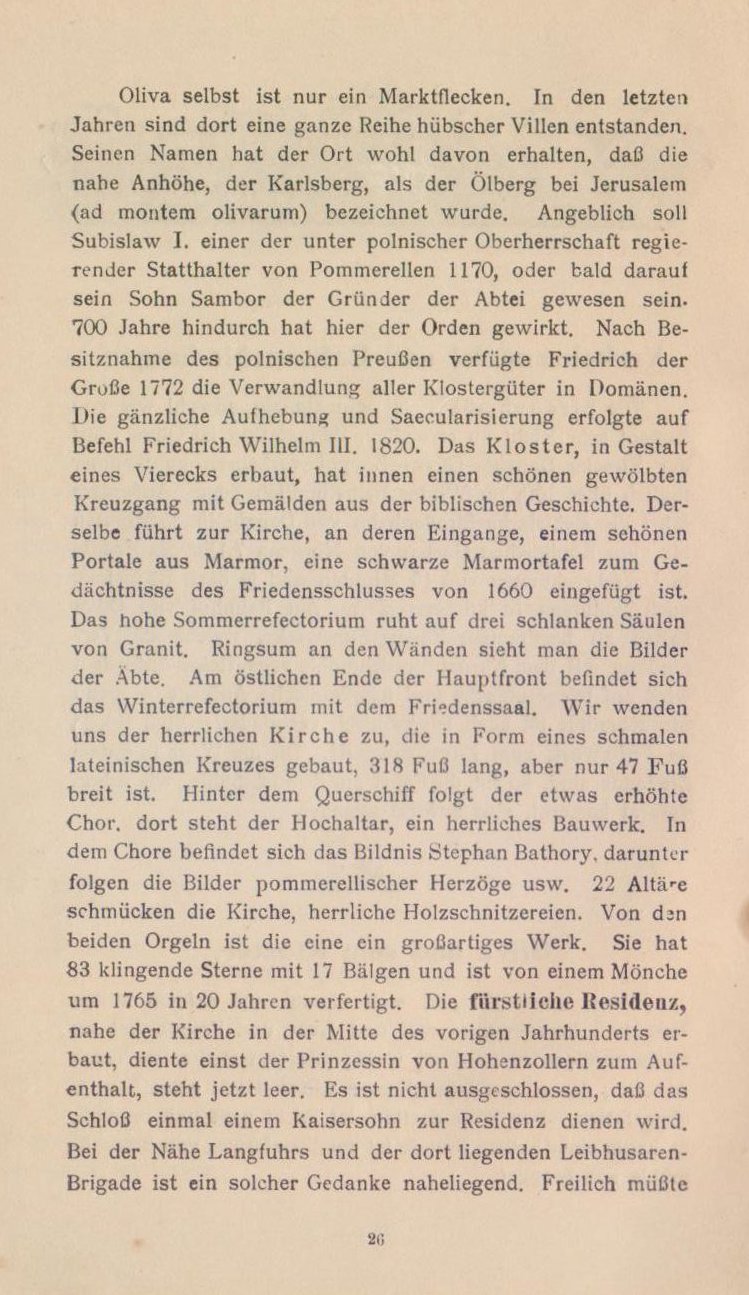 Oliva! — eine Minute! — so ruft uns der Schaffner entgegen. — Schnell raffen wir unser Gepäck zusammen — dam verlassen wir den Zug, der‘uns von Danzig in kaum 15 Minuten nach der alten Cisterzienser-Abtei, berühmt durch den Frieienssehluß im Jahre 1660. gebracht hat.