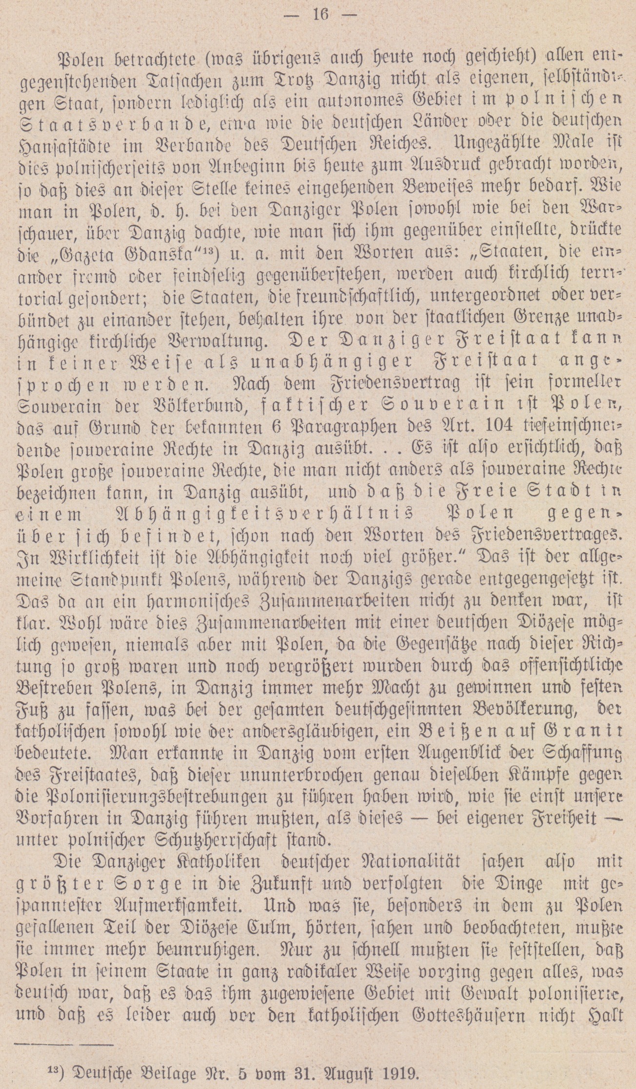 Polen betrachtete (was übrigens auch heute noch geschieht) allen enigegenstehenden Tatsachen zum Trok Danzig nicht als eigenen, selbständigen Staat, sondern lediglich als ein autonomes Gebiet im polnischen Staatsverbande, eina wie die deutschen Länder oder die deutschen Hanjastädte im Verbande des Deutschen Reiches. Ungezählte Male isi dies polnischerseits von Anbeginn bis heute zum Ausdruck gebracht worden, jo daß dies an dieser Stelle feines eingehenden Beweises mehr bedarf. Wie man in Polen, d. h. bei den Danziger Polen sowohl wie bei den Wars schauer, über Danzig dachte, wie man sich ihm gegenüber einstellte, drückte die „Gazeta Gdañska" 13) u. a. mit den Worten aus: „Staaten, die eira ander fremd oder feindselig gegenüberstehen, werden auch firchlich territorial gesondert; die Staaten, die freundschaftlich, untergeordnet oder verbündet zu einander stehen, behalten ihre von der staatlichen Grenze unahängige kirchliche Verwaltung. Der Da nziger Freist a at fann in feiner Weise als unabhängiger Freist a at anges ip r och en werden. Nach dem Friedensvertrag ist sein formeller Souverain der Völkerbund, faktischer Souverain ist poler, das auf Grund der bekannten 6 Paragraphen des Art. 104 tiefeinschneidende souveraine Rechte in Danzig ausübt... Es ist also ersichtlich, daß Polen große souveraine Rechte, die man nicht anders als souveraine Rechie bezeichnen kann, in Danzig ausübt, und daß die Freie Stadt in einem Abhängigkeitsverhältnis Polen gegen, über sich befindet, schon nach den Worten des Friedensvertrages. In Wirklichkeit ist die Abhängigkeit noch viel größer.“ Das ist der allges meine Standpunkt Polens, während der Danzigs gerade entgegengeseßt ist. Das da an ein harmonisches Zusammenarbeiten nicht zu denken war, ist klar. Wohl wäre dies Zusammenarbeiten mit einer deutschen Diözese möglich gewesen, niemals aber mit Polen, da die Gegensäße nach dieser Richtung so groß waren und noch vergrößert wurden durch das offensichtliche Bestreben Polens, in Danzig immer mehr Macht zu gewinnen und festen Fuß zu fassen, was bei der gesamten deutschgesinnten Bevölkerung, der katholischen sowohl wie der andersgläubigen, ein Beißen auf Granit bedeutete. Man erkannte in Danzig vom ersten Augenblick der Schaffung des Freistaates, daß dieser ununterbrochen genau dieselben Kämpfe gegen die Polonisierungsbestrebungen zu führen haben wird, wie sie einst unsere Vorfahren in Danzig führen mußten, als dieses — bei eigener Freiheit – unter polnischer Schußherrschaft stand. ›››