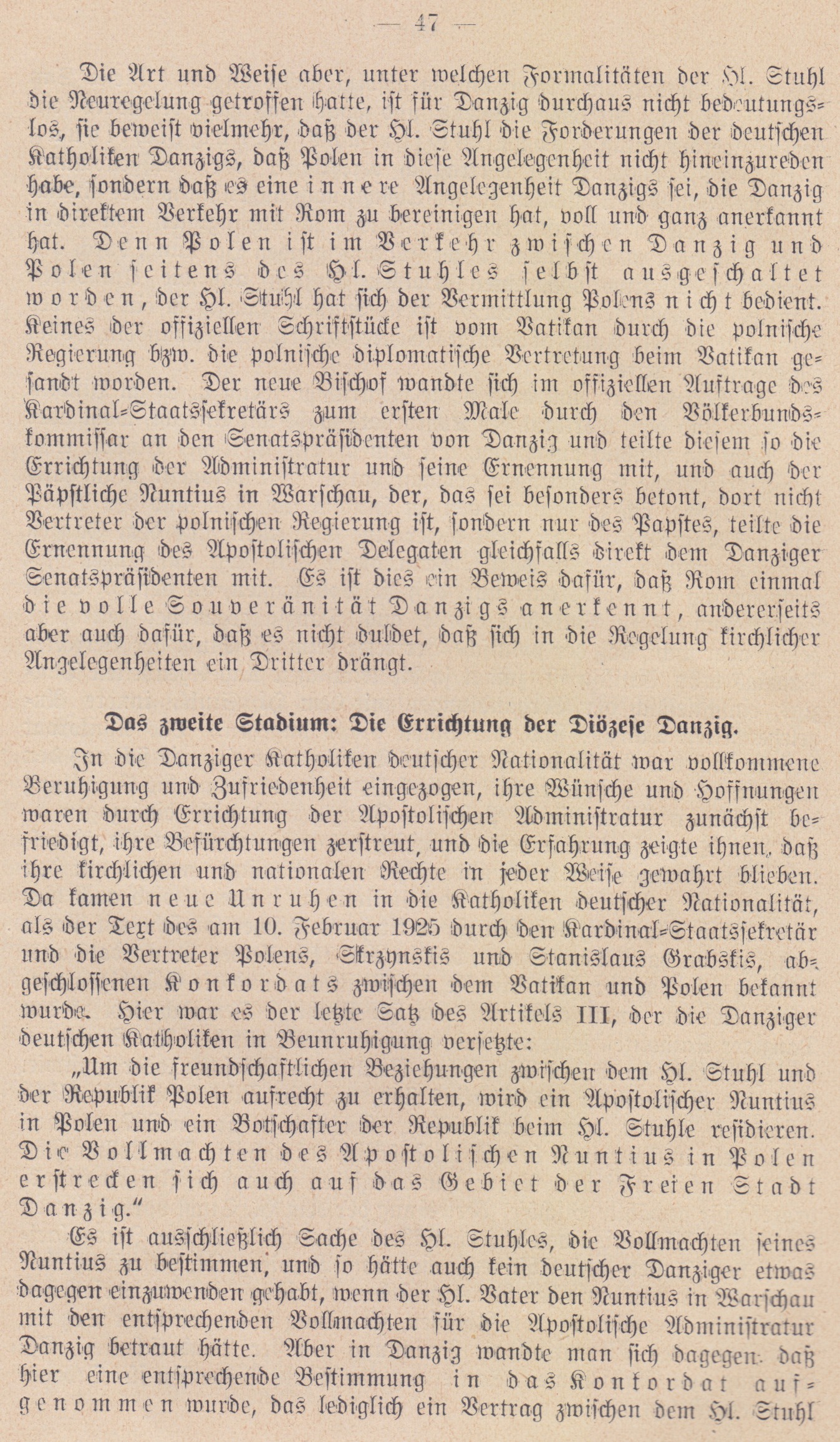 Die Art und Weise aber, unter welchen Formalitäten der VI. Stuhl die Neuregelung getroffen hatte, ist für Danzig durchaus nicht bedcutungslos, fie beweist vielmehr, daß der Hl. Stuhl die Forderungen der deutschen Katholiken Danzigs, daß Polen in diese Angelegenheit nicht hineinzureden habe, sondern daß es eine i nne re Angelegenheit Danzigs sei, die Danzig in direftem Verkehr mit Rom zu bereinigen hat, voll und ganz anerkannt hat. Denn ?olen ist im Verkehr zwischen Danzig und Polen seitens des HI. Stuhles selbst ausgeschaltet worden, der Hl. Stuhl hat sich der Vermittlung Polens nicht bedient. Keines der offiziellen Schriftstücke ist vom Vatikan durch die polnische Regierung bzw. die polnische diplomatische Vertretung beim Vatikan gefandt worden. Der neue Bischof wandte sich im offiziellen Auftrage des Kardinal-Staatssekretärs zum ersten Male durch den Völkerbundsfommissar an den Senatspräsidenten von Danzig und teilte diejem jo die Errichtung der Administratur und seine Ernennung mit, und auch der Päpstliche Nuntius in Warschau, der, das sei besonders betont, dort nicht Vertreter der polnischen Regierung ist, sondern nur des Papstes, teilte die Ernennung des Apostolischen Delegaten gleichfalls direft dem Danziger Senatspräsidenten mit. Es ist dies ein Beweis dafür, daß kom einmal die volle Souveränität Dan zi gs anerkennt, andererseits aber auch dafür, daß es nicht duldet, daß sich in die Kegelung kirchlicher Angelegenheiten ein Dritter drängt.. ›››