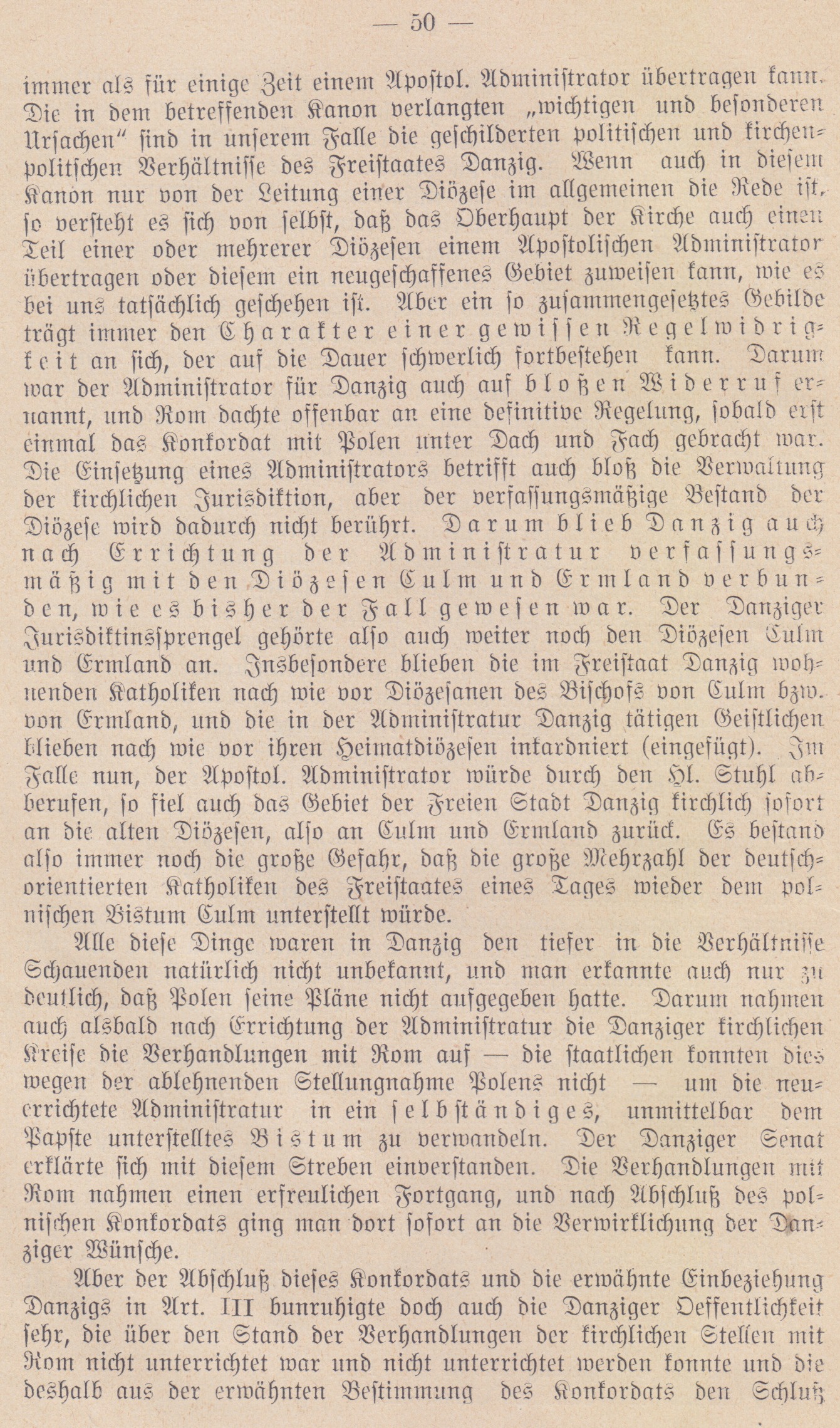 immer als für einige Zeit einem Apostol. Administrator übertragen fanir. Die in dem betreffenden Kanon verlangten „wichtigen und besonderen Ursachen“ sind in unserem Falle die geschilderten politischen und kirchenpolitschen Verhältnisse des Freistaates Danzig. Wenn auch in diesem stanon nur von der Leitung einer Diözese im allgemeinen die Rede ist, so versteht es sich von selbst, daß das Oberhaupt der Kirche auch einen Teil einer oder mehrerer Diözesen einem Apostolischen Administrator übertragen oder diesem ein neugeschaffenes Gebiet zuweisen kann, wie es bei uns tatsächlich geschehen ist. Aber ein so zujammengesektes Gebilde trägt immer den Charakter einer gewissen Regelwidrigfeit an sich, der auf die Dauer schwerlich fortbestehen kann. Darum war der Administrator für Danzig auch auf bloßen Widerruf errannt, und kom dachte offenbar an eine definitive Regelung, sobald erst einmal das Konkordat mit Polen unter Dach und Fach gebracht war. Die Einsebung eines Administrators betrifft auch bloß die Verwaltung der firchlichen Jurisdiftion, aber der verfassungsmäßige Bestand der Diözese wird dadurch nicht berührt. Darum blieb Danzig a ud; nach Errichtung der Administratur verfassungsmäßig mit den Diözesen Culm und Ermland verbunden, wie es bisher der Fall gewesen war. Der Danziger Jurisdiftinssprengel gehörte also auch weiter noch den Diözesen Sulin und Ermland an. Insbesondere blieben die im Freistaat Danzig wohnenden Katholiken nach wie vor Diözesanen des Bischofs von Culm bzw. von Ermland, und die in der Administratur Danzig tätigen Geistlichen Hieben nach wie vor ihren Heimatdiözesen inkardniert (eingefügt). Im Falle nun, der Apostol. Administrator würde durch den Hl. Stuhl ahberufen, so fiel auch das Gebiet der Freien Stadt Danzig firchlich sofort an die alten Diözesen, also an Culm und Ermland zurück. Es bestand also immer noch die große Gefahr, daß die große Mehrzahl der deutschorientierten fatholifen des Freistaates eines Tages wieder dem polnischen Bistum Culm unterstellt würde. ›››