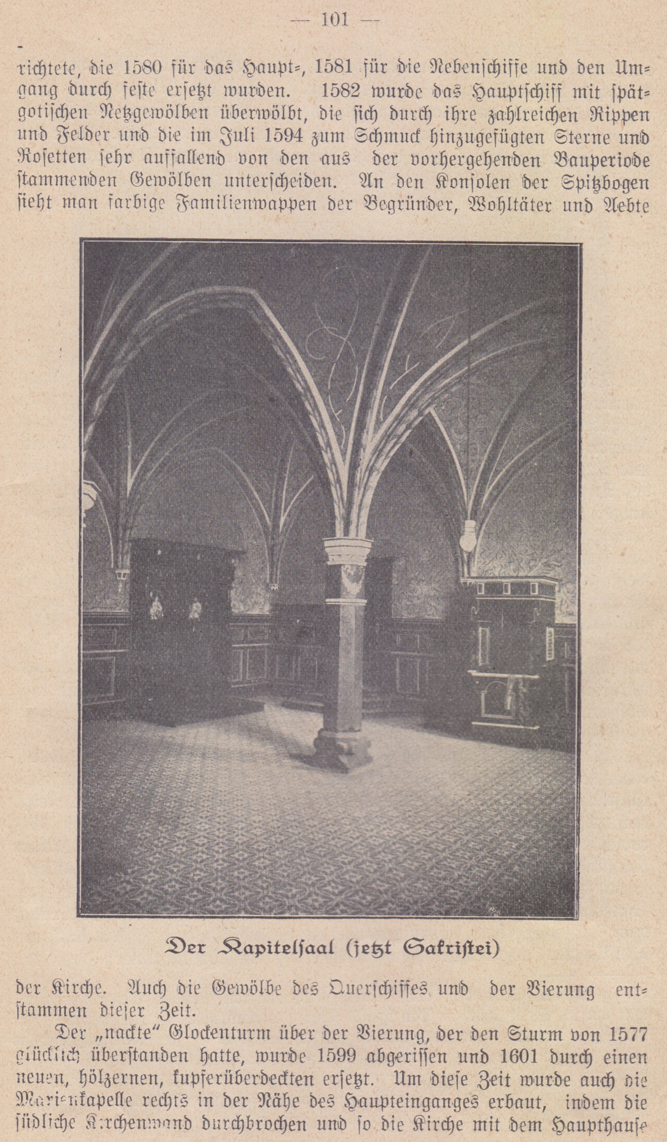 richtete, die 1580 für das Haupt-, 1581 für die Nebenschiffe und den Umgang durch feste ersekt wurden. 1582 wurde das Hauptschiff mit spätgotischen Nebgewölben überwölbt, die sich durch ihre zahlreichen Rippen und Felder und die im Juli 1594 zum Schmuc hinzugefügten Sterne und Rosetten sehr auffallend von den aus der vorhergehenden Bauperiode stammenden Gewölben unterscheiden. An den Konjolen der Spißbogen sieht man farbige Familienwappen der Begründer, Wohltäter und Aebte der Kirche. Auch die Gewölbe des Querschiffes und der Vierung entstammen dieser Zeit. ›››