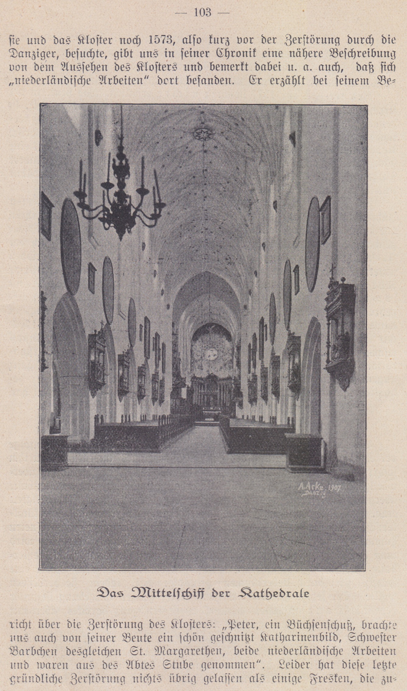 sie und das Kloster noch 1573, also kurz vor der Zerstörung durch die Danziger, besuchte, gibt uns in seiner Chronik eine nähere Beschreibung von dem Aussehen des flosters und bemerkt dabei u. a. auch, daß fich „niederländische Arbeiten" dert befanden. Er erzählt bei seinem Bericht über die Zerstörung des Klosters: „Peter, ein Büchsenschuß, brachte is auch von seiner Beute ein schön geschnißt Katharinenbild, Schwester Barbchen desgleichen St. Margarethen, beide niederländische Arbeiten und waren aus des Abtes Stube genommen“. Leider hat diese lebte gründliche Zerstörung nichts übrig gelassen als einige Fresken, die zu ›››