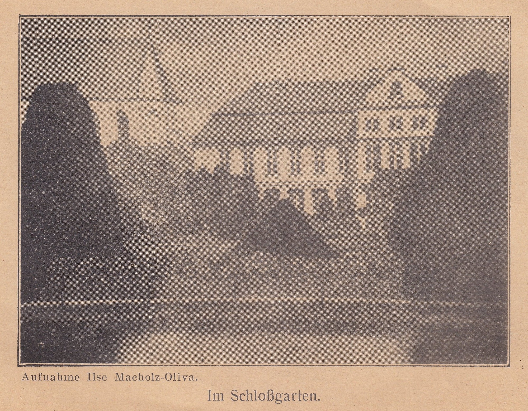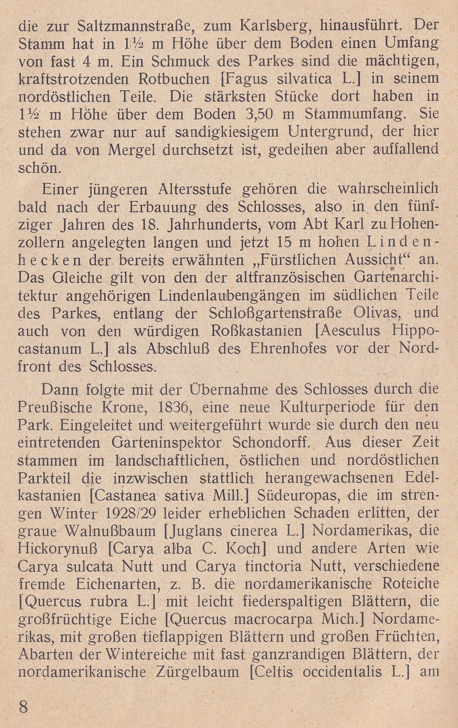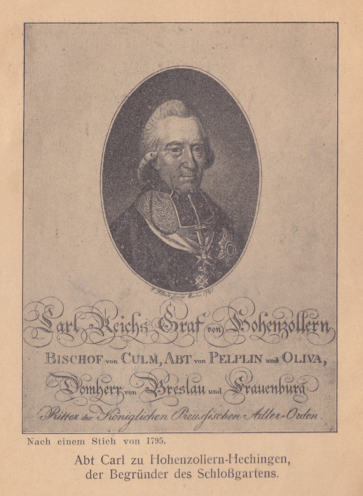 Einer jüngeren Altersstufe gehören die wahrscheinlich bald nach der Erbauung des Schlosses, also in den fünfziger Jahren des 18. Jahrhunderts, vom Abt Karl zu Hohenzollern angelegten langen und jetzt 15 m hohen Lindenhecken der bereits erwähnten"Fürstlichen Aussicht" an. Das Gleiche gilt von den der altfranzösischen Gartenarchitektur angehörigen Lindenlaubengängen im südlichen Teile des Parkes, entlang der Schloßgartenstraße Olivas, und auch von den würdigen Roßkastanien [Aesculus Hippocastanum L.] als Abschluß des Ehrenhofes vor der Nordfront des Schlosses.