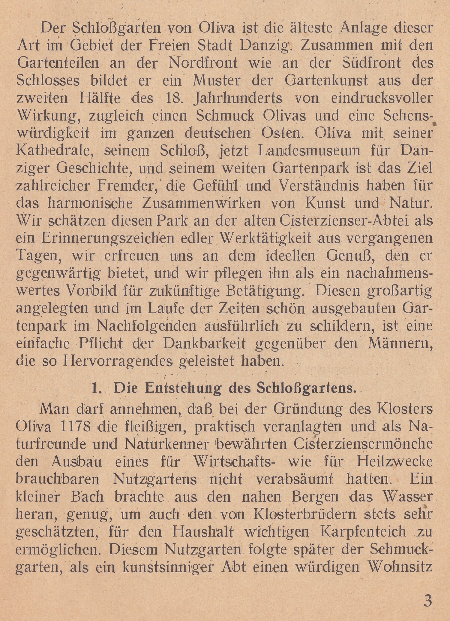 Der Schloßgarten von Oliva ist die älteste Anlage dieser Art im Gebiet der Freien Stadt Danzig. Zusammen mit den Gartenteilen an der Nordfront wie an der Südfront des Schlosses bildet er ein Muster der Gartenkunst aus der zweiten Hälfte des 18. Jahrhunderts von eindrucksvoller Wirkung, zugleich einen Schmuck Olivas und eine Sehenswürdigkeit im ganzen deutschen Osten. Oliva mit seiner Kathedrale, seinem Schloß, jetzt Landesmuseum für Dan- ziger Geschichte, und seinem weiten Gartenpark ist das Ziel zahlreicher Fremder, die Gefühl und Verständnis haben für das harmonische Zusammenwirken von Kunst und Natur. Wir schätzen diesen Park an der alten Cisterzienser-Abtei als ein Erinnerungszeichen edler Werktätigkeit aus vergangenen Tagen, wir erfreuen uns an dem ideellen Genuß, den er gegenwärtig bietet, und wir pflegen ihn als ein nachahmens- wertes Vorbild für zukünftige Betätigung. Diesen großartig angelegten und im Laufe der Zeiten schön ausgebauten Gar- tenpark im Nachfolgenden ausführlich zu schildern, ist eine einfache Pflicht der Dankbarkeit gegenüber den Männern, die so Hervorragendes geleistet haben.