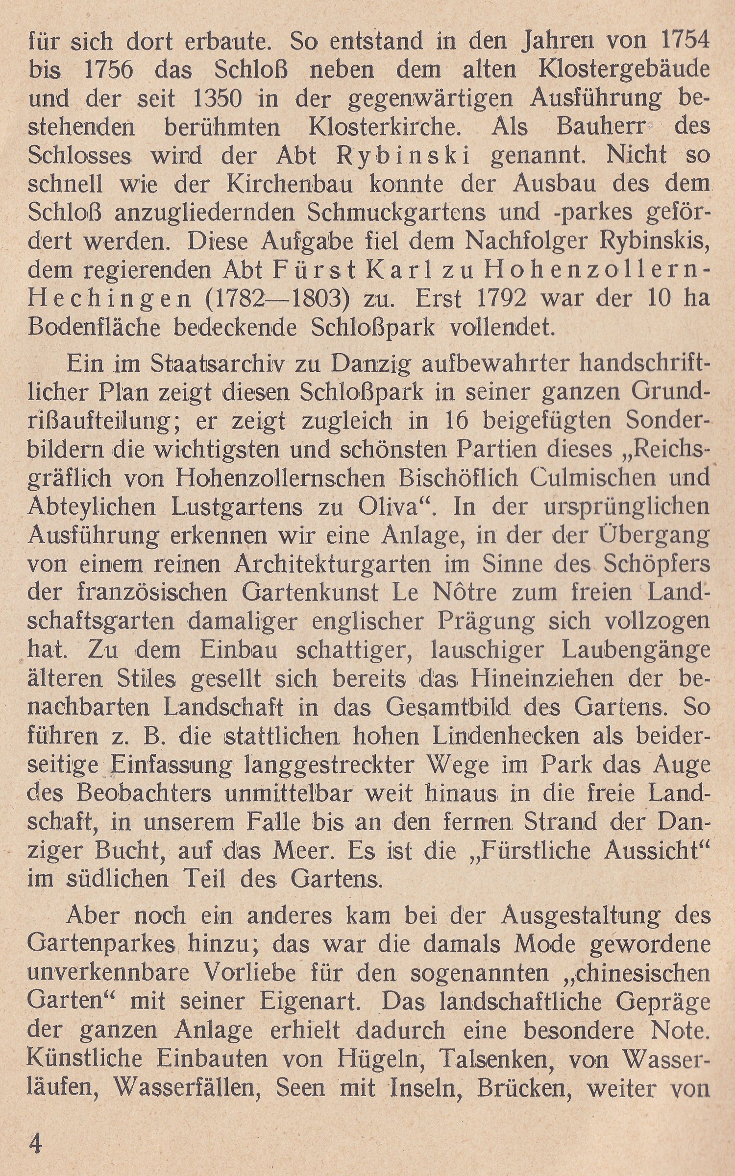 Man darf annehmen, daß bei der Gründung des Klosters Oliva 1178 die fleißigen, praktisch veranlagten und als Na- turfreunde und Naturkenner bewährten Cisterziensermönche den Ausbau eines für Wirtschafts- wie für Heilzwecke brauchbaren Nutzgartens nicht verabsäumt hatten. Ein kleiner Bach brachte aus den nahen Bergen das Wasser heran, genug, um auch den von Klosterbrüdern stets sehr geschätzten, für den Haushalt wichtigen Karpfenteich zu ermöglichen. Diesem Nutzgarten folgte später der Schmuck- garten, als ein kunstsinniger Abt einen würdigen Wohnsitz für sich dort erbaute. So entstand in den Jahren von 1754 bis 1756 das Schloß neben dem alten Klostergebäude und der seit 1350 in der gegenwärtigen Ausführung be- stehenden berühmten Klosterkirche. Als Bauherr des Schlosses wird der Abt Rybinski genannt. Nicht so schnell wie der Kirchenbau konnte der Ausbau des dem. Schloß anzugliedernden Schmuckgartens und -parkes geför- dert werden. Diese Aufgabe fiel dem Nachfolger Rybinskis, dem regierenden Abt Fürst Karl zu Hohenzollern- Hechingen (1782-1803) zu. Erst 1792 war der 10 ha Bodenfläche bedeckende Schloßpark vollendet.