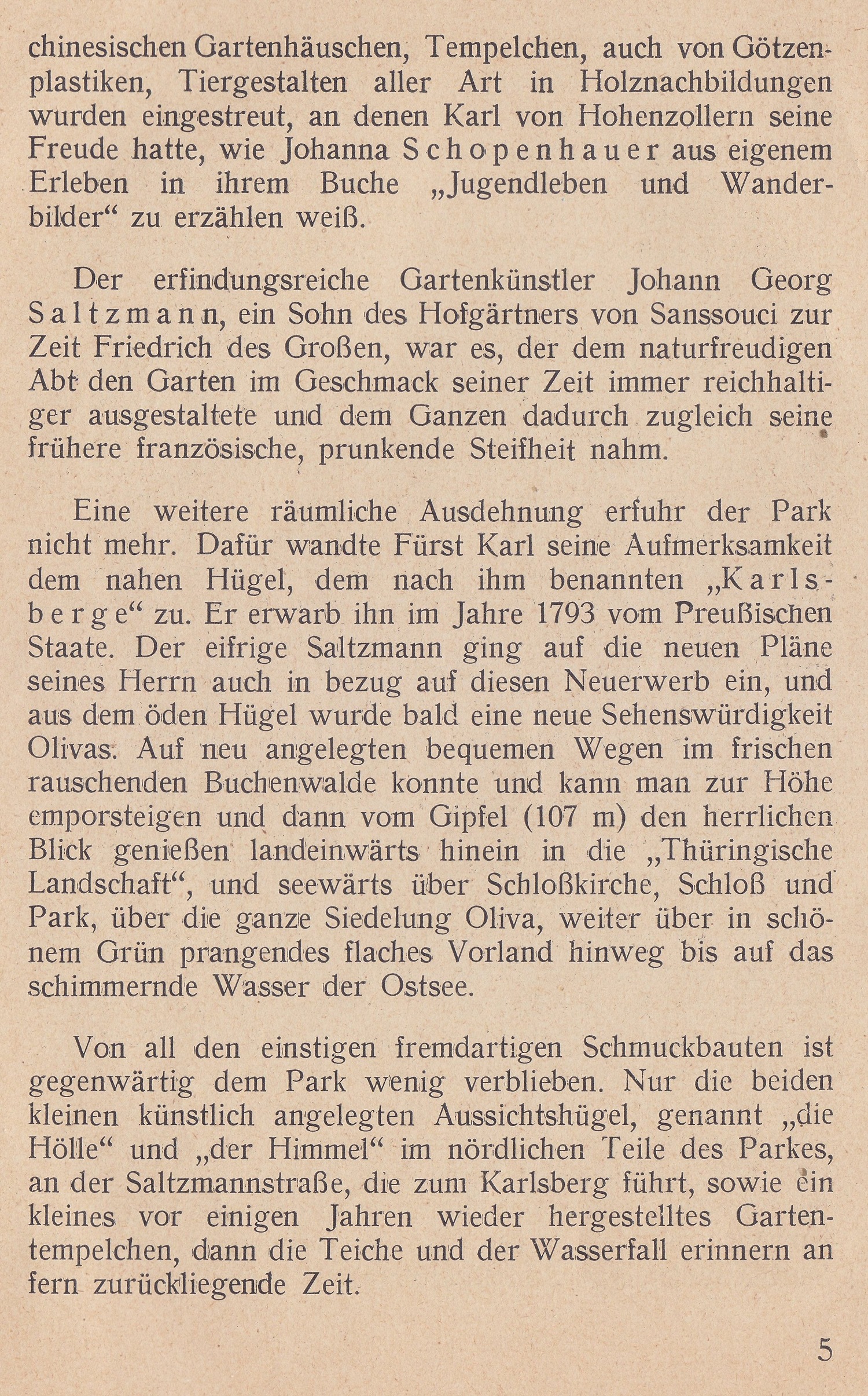 Eine weitere räumliche Ausdehnung erfuhr der Park nicht mehr. Dafür wandte Fürst Karl seine Aufmerksamkeit dem nahen Hügel, dem nach ihm benannten "Karlsberge" zu. Er erwarb ihn im Jahre 1793 vom Preußischen Staate. Der eifrige Saltzmann ging auf die neuen Pläne seines Herrn auch in bezug auf diesen Neuerwerb ein, und aus dem öden Hügel wurde bald eine neue Sehenswürdigkeit Olivas. Auf neu angelegten bequemen Wegen im frischen rauschenden Buchenwalde konnte und kann man zur Höhe emporsteigen und dann vom Gipfel (107 m) den herrlichen Blick genießen landeinwärts hinein in die "Thüringische Landschaft", und seewärts über Schloßkirche, Schloß und Park, über die ganze Siedelung Oliva, weiter über in schönem Grün prangendes flaches Vorland hinweg bis auf das schimmernde Wasser der Ostsee.