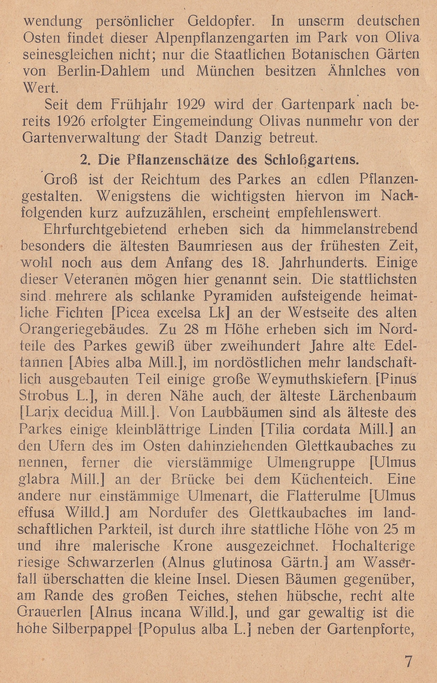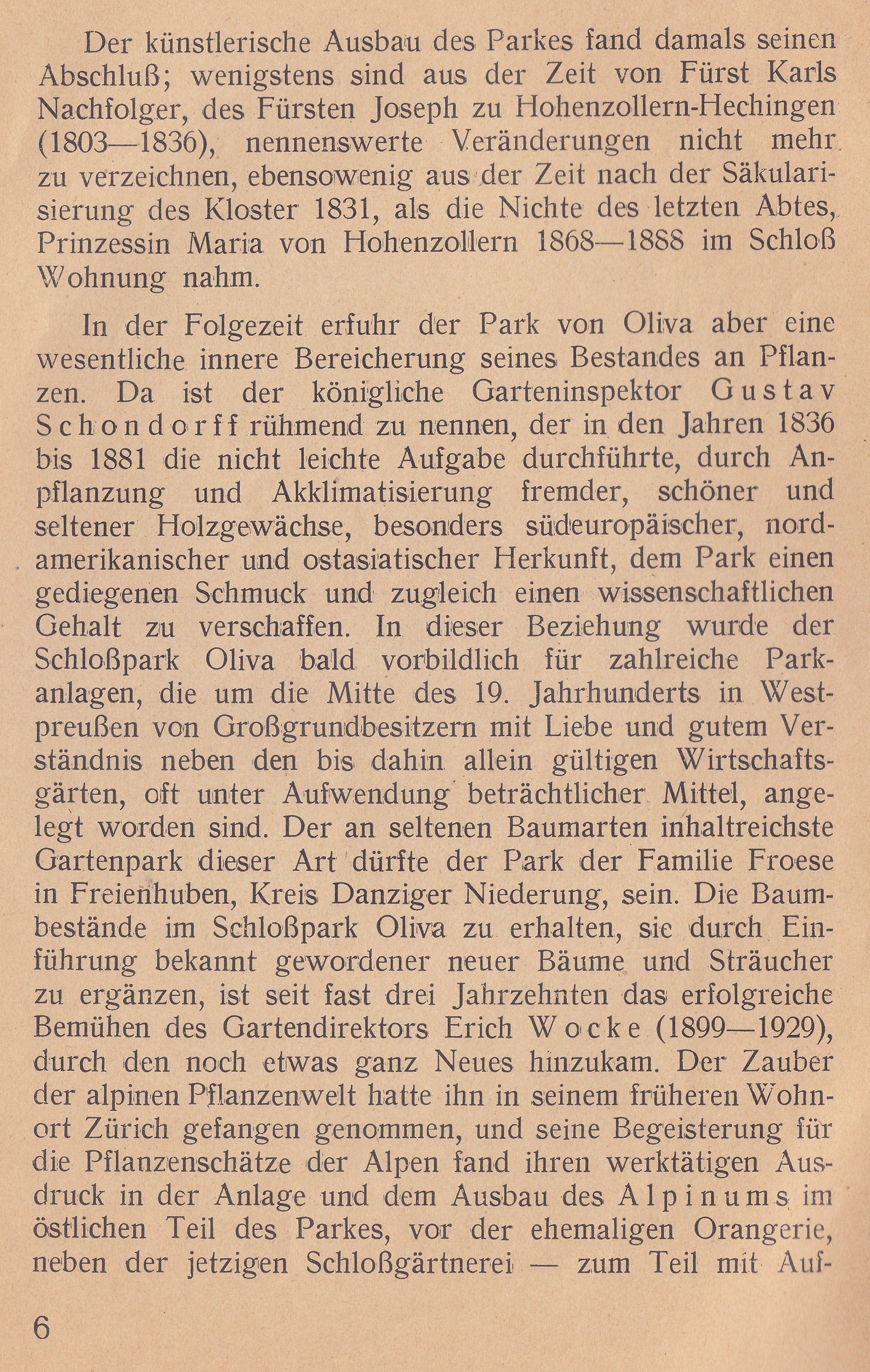 In der Folgezeit erfuhr der Park von Oliva aber eine wesentliche innere Bereicherung seines Bestandes an Pflan Da ist der königliche Garteninspektor Gustav Schondorff rühmend zu nennen, der in den Jahren 1836 bis 1881 die nicht leichte Aufgabe durchführte, durch Anpflanzung und Akklimatisierung fremder, schöner und seltener Holzgewächse, besonders südeuropäischer, nordamerikanischer und ostasiatischer Herkunft, dem Park einen gediegenen Schmuck und zugleich einen wissenschaftlichen Gehalt zu verschaffen. In dieser Beziehung wurde der Schloßpark Oliva bald vorbildlich für zahlreiche Parkanlagen, die um die Mitte des 19. Jahrhunderts in Westpreußen von Großgrundbesitzern mit Liebe und gutem Verständnis neben den bis dahin allein gültigen Wirtschaftsgärten, oft unter Aufwendung beträchtlicher Mittel, angelegt worden sind. Der an seltenen Baumarten inhaltreichste Gartenpark dieser Art dürfte der Park der Familie Froese in Freienhuben, Kreis Danziger Niederung, sein. Die Baumbestände im Schloßpark Oliva zu erhalten, sie durch Einführung bekannt gewordener neuer Bäume und Sträucher zu ergänzen, ist seit fast drei Jahrzehnten das erfolgreiche Bemühen des Gartendirektors Erich Wocke (1899-1929), durch den noch etwas ganz Neues hinzukam. Der Zauber der alpinen Pflanzenwelt hatte ihn in seinem früheren Wohnort Zürich gefangen genommen, und seine Begeisterung für die Pflanzenschätze der Alpen fand ihren werktätigen Ausdruck in der Anlage und dem Ausbau des Alpinums im östlichen Teil des Parkes, vor der ehemaligen Orangerie, neben der jetzigen Schloßgärtnerei zum Teil mit Aufwendung persönlicher Geldopfer. In unserm deutschen Osten findet dieser Alpenpflanzengarten im Park von Oliva seinesgleichen nicht; nur die Staatlichen Botanischen Gärten von Berlin-Dahlem und München besitzen Ähnlches von Wert.