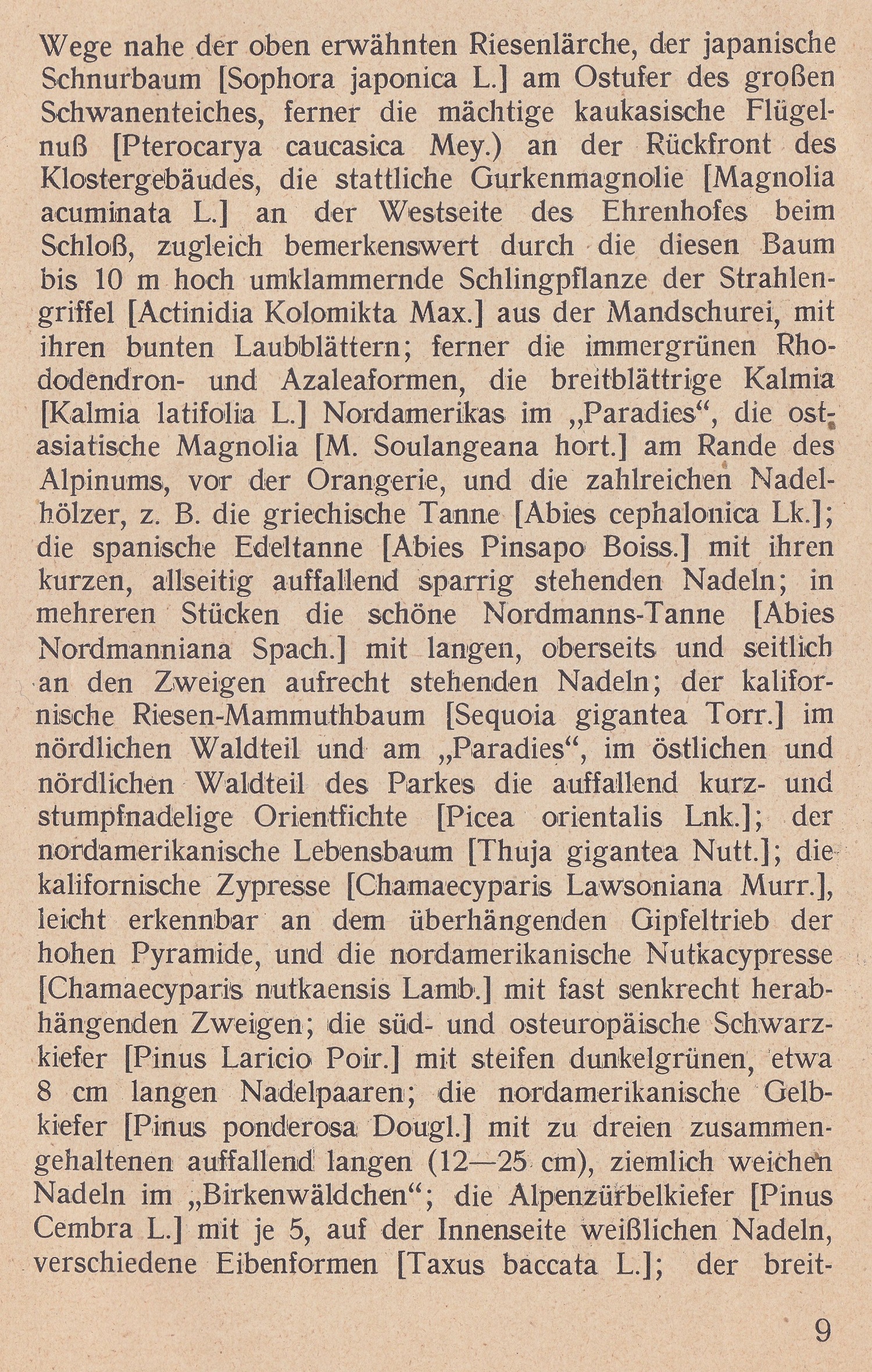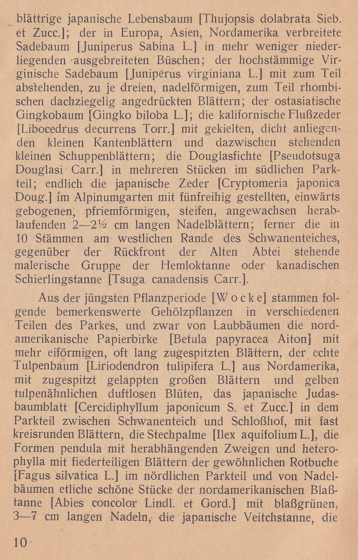 und Azaleaformen, die breitblättrige Kalmia [Kalmia latifolia L.] Nordamerikas im "Paradies", die ostasiatische Magnolia [M. Soulangeana hort.] am Rande des Alpinums, vor der Orangerie, und die zahlreichen Nadelhölzer, z. B. die griechische Tanne [Abies cephalonica Lk.]; die spanische Edeltanne [Abies Pinsapo Boiss.] mit ihren kurzen, allseitig auffallend sparrig stehenden Nadeln; in mehreren Stücken die schöne Nordmanns-Tanne [Abies Nordmanniana Spach.] mit langen, oberseits und seitlich an den Zweigen aufrecht stehenden Nadeln; der kalifornische Riesen-Mammuthbaum [Sequoia gigantea Torr.] im nördlichen Waldteil und am "Paradies", im östlichen und nördlichen Waldteil des Parkes die auffallend kurzund stumpfnadelige Orientfichte [Picea orientalis Lnk.]; der nordamerikanische Lebensbaum [Thuja gigantea Nutt.]; die kalifornische Zypresse [Chamaecyparis Lawsoniana Murr.], leicht erkennbar an dem überhängenden Gipfeltrieb der hohen Pyramide, und die nordamerikanische Nutkacypresse [Chamaecyparis nutkaensis Lamb.] mit fast senkrecht herabhängenden Zweigen; die süd- und osteuropäische Schwarzkiefer [Pinus Laricio Poir.] mit steifen dunkelgrünen, etwa 8 cm langen Nadelpaaren; die nordamerikanische Gelbkiefer [Pinus ponderosa Dougl.] mit zu dreien zusammengehaltenen auffallend langen (12-25 cm), ziemlich weichen Nadeln im "Birkenwäldchen"; die Alpenzürbelkiefer [Pinus Cembra L.] mit je 5, auf der Innenseite weißlichen Nadeln, verschiedene Eibenformen [Taxus baccata L.]; der breitblättrige japanische Lebensbaum [Thujopsis dolabrata Sieb. et Zucc.]; der in Europa, Asien, Nordamerika verbreitete Sadebaum [Juniperus Sabina L.] in mehr weniger niederliegenden ausgebreiteten Büschen; der hochstämmige Virginische Sadebaum [Juniperus virginiana L.] mit zum Teil abstehenden, zu je dreien, nadelförmigen, zum Teil rhombischen dachziegelig angedrückten Blättern; der ostasiatische Gingkobaum [Gingko biloba L.]; die kalifornische Flußzeder [Libocedrus decurrens Torr.] mit gekielten, dicht anliegenden kleinen Kantenblättern und dazwischen stehenden kleinen Schuppenblättern; die Douglasfichte [Pseudotsuga Douglasi Carr.] in mehreren Stücken im südlichen Parkteil; endlich die japanische Zeder [Cryptomeria japonica Doug.] im Alpinumgarten mit fünfreihig gestellten, einwärts gebogenen, pfriemförmigen, steifen, angewachsen herablaufenden 2-21/2 cm langen Nadelblättern; ferner die in 10 Stämmen am westlichen Rande des Schwanenteiches, gegenüber der Rückfront der Alten Abtei stehende malerische Gruppe der Hemloktanne oder kanadischen Schierlingstanne [Tsuga canadensis Carr.].