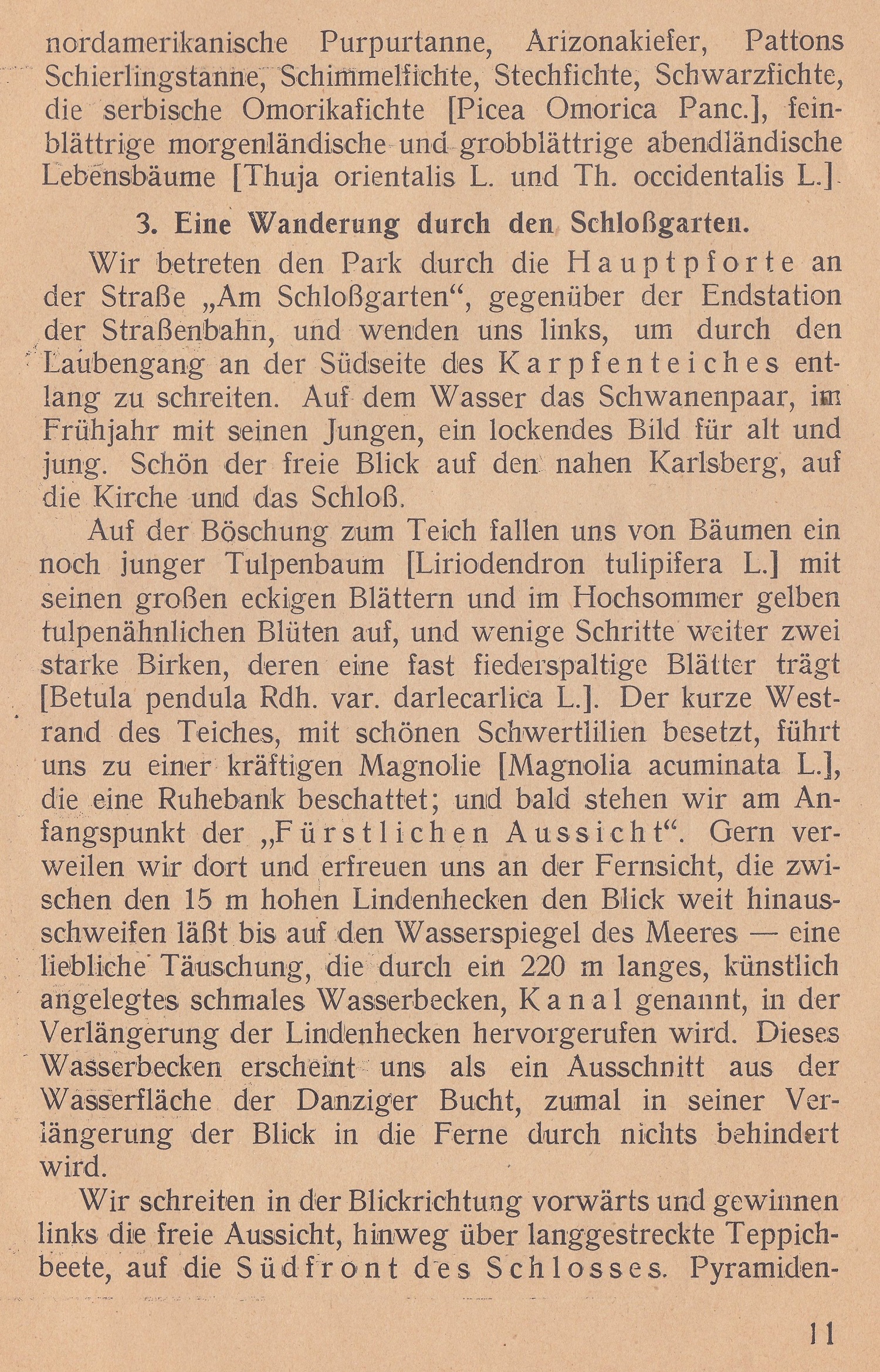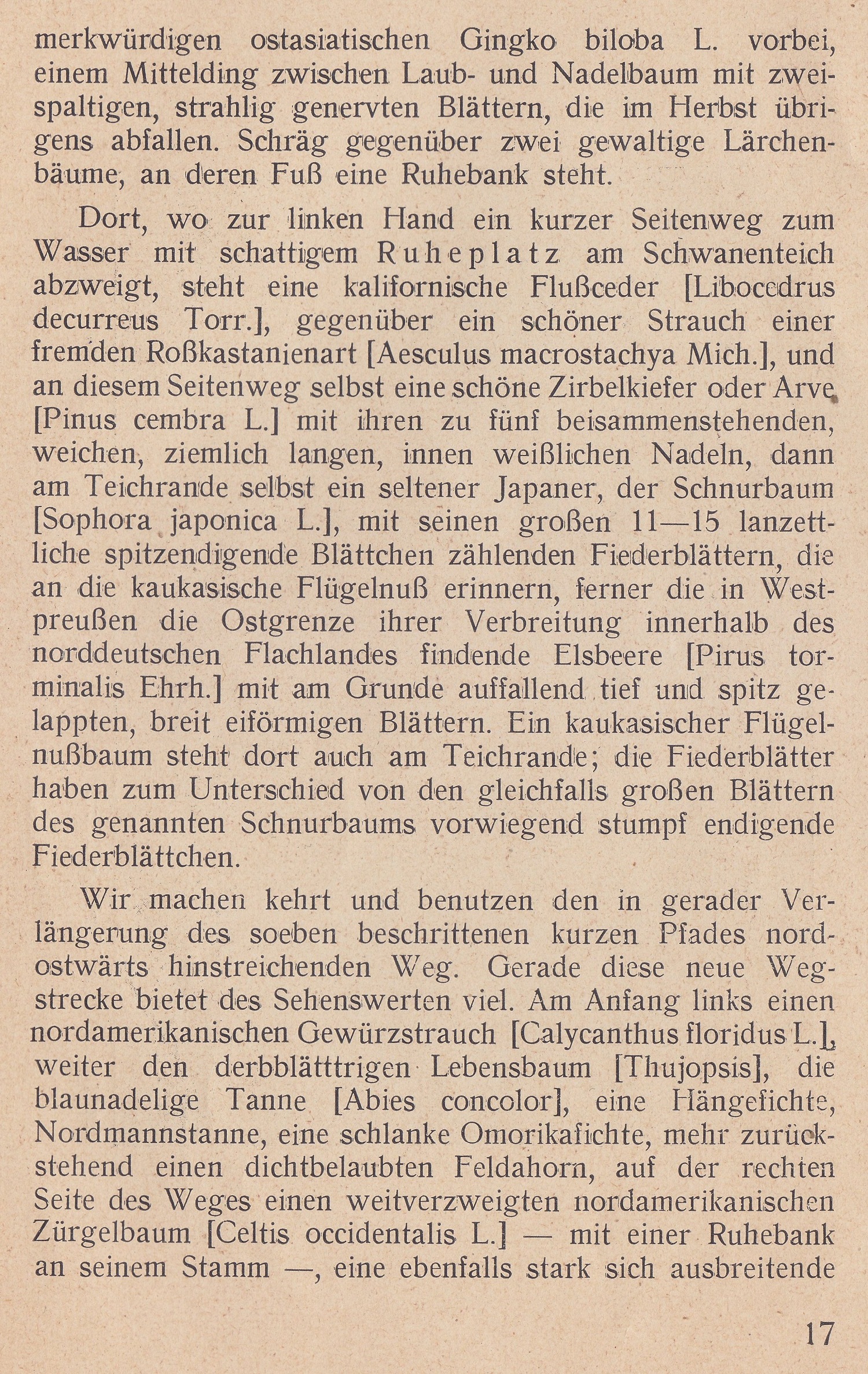 Dort, wo zur linken Hand ein kurzer Seitenweg zum Wasser mit schattigem Ruheplatz am Schwanenteich abzweigt, steht eine kalifornische Flußceder [Libocedrus decurreus Torr.], gegenüber ein schöner Strauch einer fremden Roßkastanienart [Aesculus macrostachya Mich.], und an diesem Seitenweg selbst eine schöne Zirbelkiefer oder Arve [Pinus cembra L.] mit ihren zu fünf beisammenstehenden, weichen, ziemlich langen, innen weißlichen Nadeln, dann am Teichrande selbst ein seltener Japaner, der Schnurbaum [Sophora japonica L.], mit seinen großen 11-15 lanzettliche spitzendigende Blättchen zählenden Fiederblättern, die an die kaukasische Flügelnuß erinnern, ferner die in Westpreußen die Ostgrenze ihrer Verbreitung innerhalb des norddeutschen Flachlandes findende Elsbeere [Pirus torminalis Ehrh.] mit am Grunde auffallend tief und spitz gelappten, breit eiförmigen Blättern. Ein kaukasischer Flügelnußbaum steht dort auch am Teichrande; die Fiederblätter haben zum Unterschied von den gleichfalls großen Blättern des genannten Schnurbaums vorwiegend stumpf endigende Fiederblättchen.