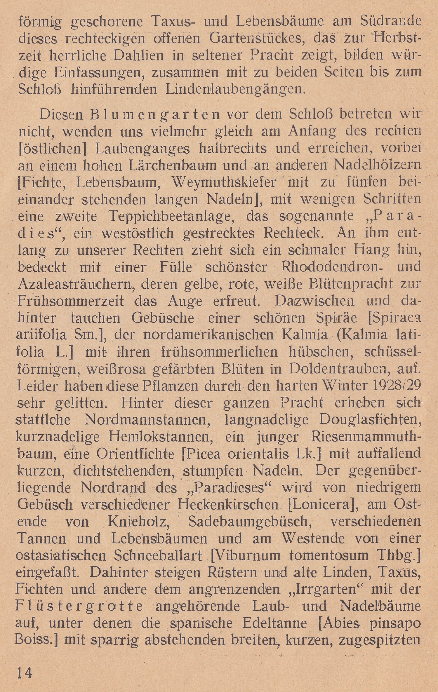 Diesen Blumengarten vor dem Schloß betreten wir nicht, wenden uns vielmehr gleich am Anfang des rechten [östlichen] Laubenganges halbrechts und erreichen, vorbei an einem hohen Lärchenbaum und an anderen Nadelhölzern [Fichte, Lebensbaum, Weymuthskiefer mit zu fünfen beieinander stehenden langen Nadeln], mit wenigen Schritten eine zweite Teppichbeetanlage, das sogenannte „Paradies", ein westöstlich gestrecktes Rechteck. An ihm entlang zu unserer Rechten zieht sich ein schmaler Hang hin, bedeckt mit einer Fülle schönster Rhododendron- und Azaleasträuchern, deren gelbe, rote, weiße Blütenpracht zur Frühsommerzeit das Auge erfreut. Dazwischen und dahinter tauchen Gebüsche einer schönen Spiräe [Spiraca ariifolia Sm.], der nordamerikanischen Kalmia (Kalmia latifolia L.] mit ihren frühsommerlichen hübschen, schüsselförmigen, weißrosa gefärbten Blüten in Doldentrauben, auf. Leider haben diese Pflanzen durch den harten Winter 1928/29 sehr gelitten. Hinter dieser ganzen Pracht erheben sich stattlche Nordmannstannen, langnadelige Douglasfichten, kurznadelige Hemlokstannen, ein junger Riesenmammuthbaum, eine Orientfichte [Picea orientalis Lk.] mit auffallend kurzen, dichtstehenden, stumpfen Nadeln. Der gegenüberliegende Nordrand des "Paradieses" wird von niedrigem Gebüsch verschiedener Heckenkirschen [Lonicera], am Ostende von Knieholz, Sadebaumgebüsch, verschiedenen Tannen und Lebensbäumen und am Westende von einer ostasiatischen Schneeballart [Viburnum tomentosum Thbg.] eingefaßt. Dahinter steigen Rüstern und alte Linden, Taxus, Fichten und andere dem angrenzenden "Irrgarten" mit der Flüstergrotte angehörende Laub- und Nadelbäume auf, unter denen die spanische Edeltanne [Abies pinsapo Boiss.] mit sparrig abstehenden breiten, kurzen, zugespitzten Nadeln am ehesten auffällt. Sie steht nahe dem östlichen zum Schlosse führenden Laubengange, hat leider durch den letzten harten Winter stark gelitten.
