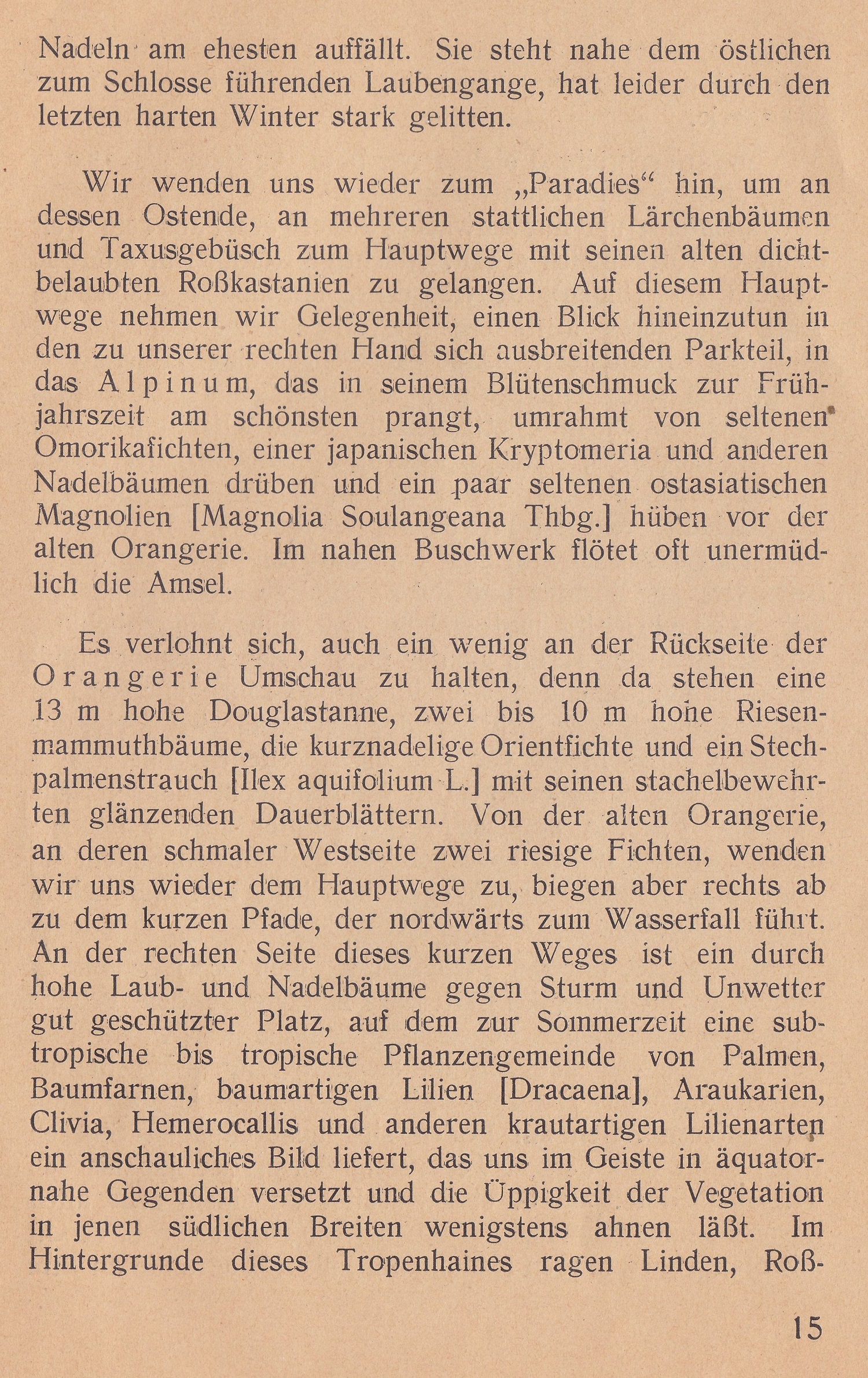 Wir wenden uns wieder zum "Paradies" hin, um an dessen Ostende, an mehreren stattlichen Lärchenbäumen und Taxusgebüsch zum Hauptwege mit seinen alten dichtbelaubten Roßkastanien zu gelangen. Auf diesem Hauptwege nehmen wir Gelegenheit, einen Blick hineinzutun in den zu unserer rechten Hand sich ausbreitenden Parkteil, in das Alpinum, das in seinem Blütenschmuck zur Frühjahrszeit am schönsten prangt, umrahmt von seltenen Omorikafichten, einer japanischen Kryptomeria und anderen Nadelbäumen drüben und ein paar seltenen ostasiatischen Magnolien [Magnolia Soulangeana Thbg.] hüben vor der alten Orangerie. Im nahen Buschwerk flötet oft unermüdlich die Amsel.