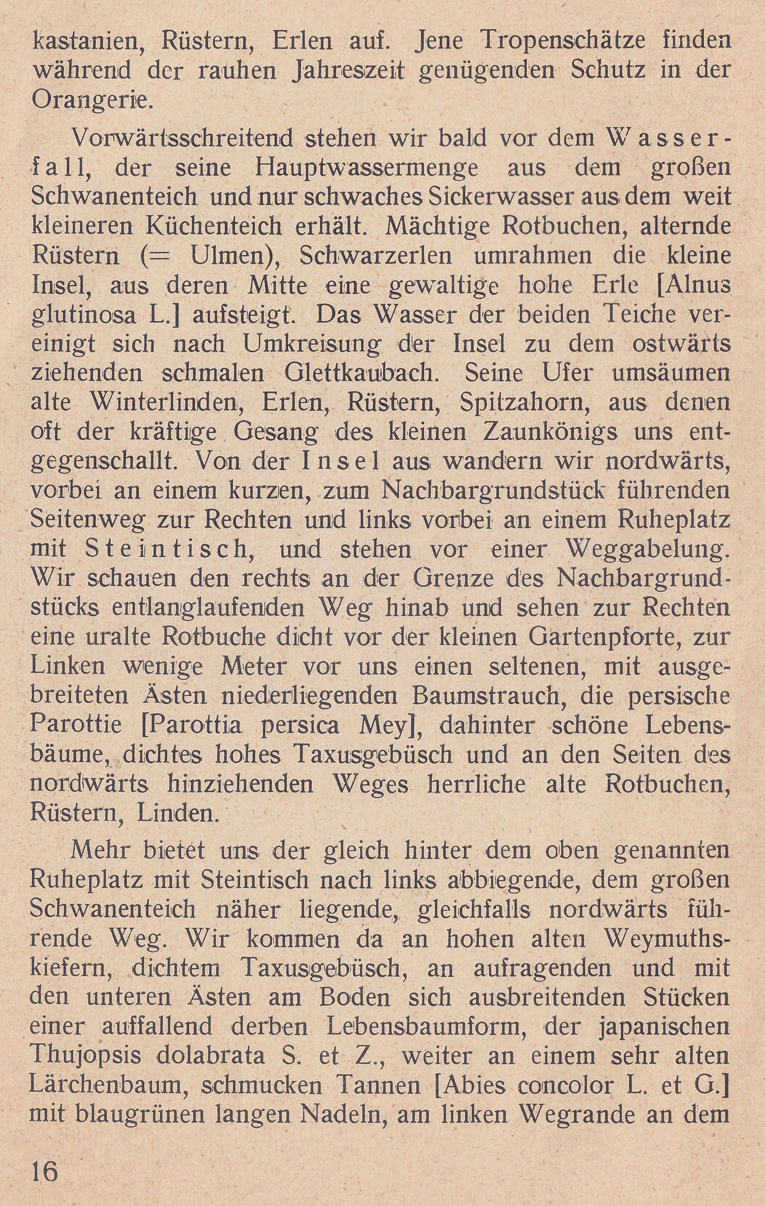 Vorwärtsschreitend stehen wir bald vor dem Wasserfall, der seine Hauptwassermenge aus dem großen Schwanenteich und nur schwaches Sickerwasser aus dem weit kleineren Küchenteich erhält. Mächtige Rotbuchen, alternde Rüstern (= Ulmen), Schwarzerlen umrahmen die kleine Insel, aus deren Mitte eine gewaltige hohe Erle [Alnus glutinosa L.] aufsteigt. Das Wasser der beiden Teiche vereinigt sich nach Umkreisung der Insel zu dem ostwärts ziehenden schmalen Glettkaubach. Seine Ufer umsäumen alte Winterlinden, Erlen, Rüstern, Spitzahorn, aus denen oft der kräftige Gesang des kleinen Zaunkönigs uns entgegenschallt. Von der Insel aus wandern wir nordwärts, vorbei an einem kurzen, zum Nachbargrundstück führenden Seitenweg zur Rechten und links vorbei an einem Ruheplatz mit Steintisch, und stehen vor einer Weggabelung. Wir schauen den rechts an der Grenze des Nachbargrundstücks entlanglaufenden Weg hinab und sehen zur Rechten eine uralte Rotbuche dicht vor der kleinen Gartenpforte, zur Linken wenige Meter vor uns einen seltenen, mit ausgebreiteten Ästen niederliegenden Baumstrauch, die persische Parottie [Parottia persica Mey], dahinter schöne Lebensbäume, dichtes hohes Taxusgebüsch und an den Seiten des nordwärts hinziehenden Weges herrliche alte Rotbuchen, Rüstern, Linden.