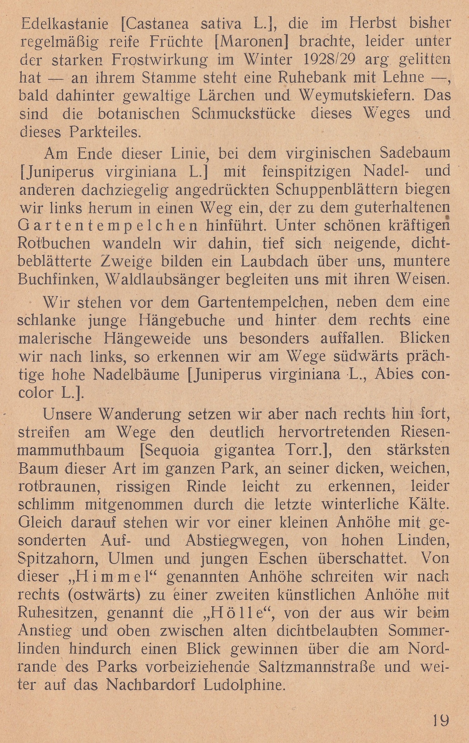 Unsere Wanderung setzen wir aber nach rechts hin fort, streifen am Wege den deutlich hervortretenden Riesenmammuthbaum [Sequoia gigantea Torr.], den stärksten Baum dieser Art im ganzen Park, an seiner dicken, weichen, rotbraunen, rissigen Rinde leicht zu erkennen, leider schlimm mitgenommen durch die letzte winterliche Kälte. Gleich darauf stehen wir vor einer kleinen Anhöhe mit gesonderten Auf- und Abstiegwegen, von hohen Linden, Spitzahorn, Ulmen und jungen Eschen überschattet. Von dieser"Himmel" genannten Anhöhe schreiten wir nach rechts (ostwärts) zu einer zweiten künstlichen Anhöhe mit Ruhesitzen, genannt die "Hölle", von der aus wir beim Anstieg und oben zwischen alten dichtbelaubten Sommerlinden hindurch einen Blick gewinnen über die am Nordrande des Parks vorbeiziehende Saltzmannstraße und weiter auf das Nachbardorf Ludolphine.
