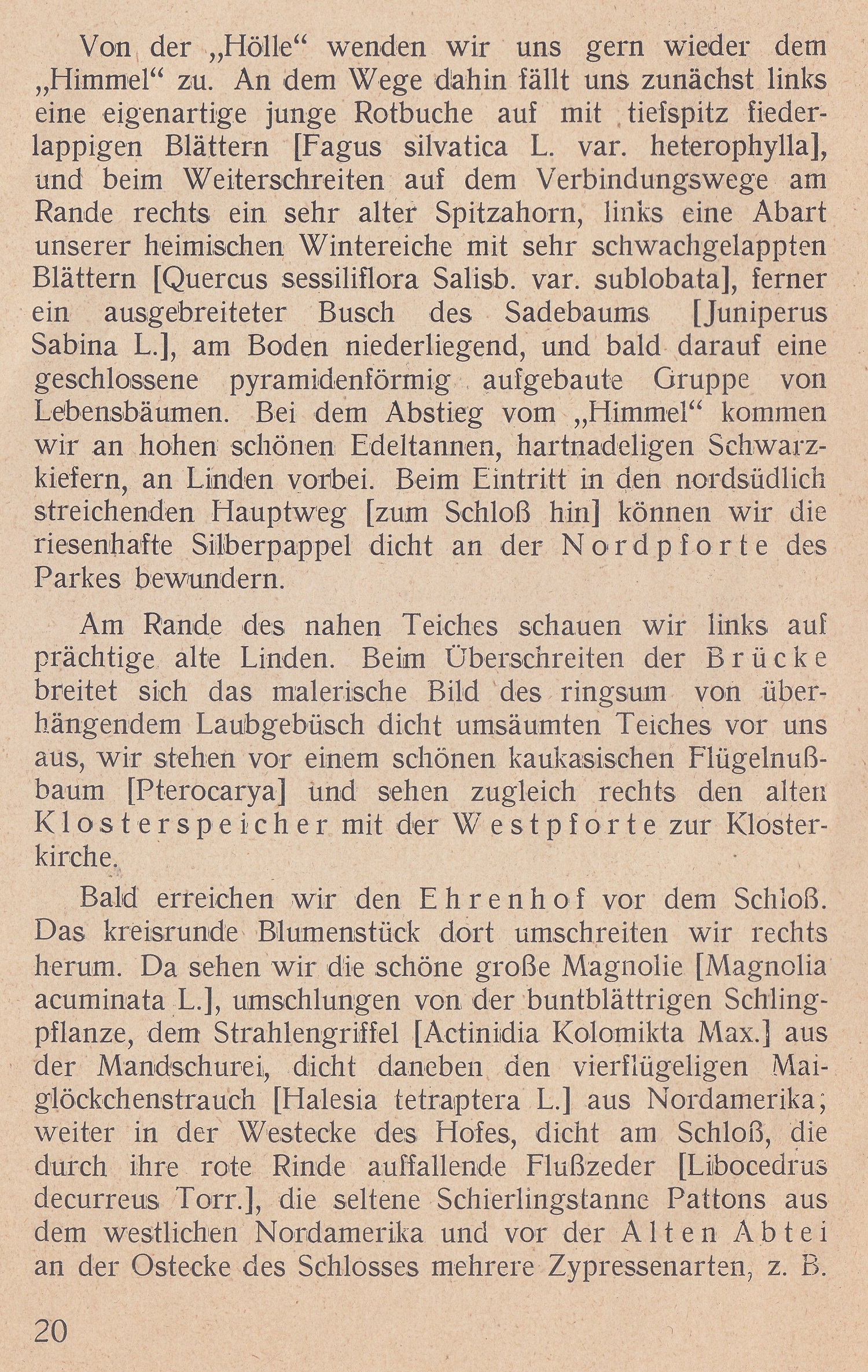 Von der "Hölle" wenden wir uns gern wieder dem "Himmel" zu. An dem Wege dahin fällt uns zunächst links eine eigenartige junge Rotbuche auf mit tiefspitz fiederlappigen Blättern [Fagus silvatica L. var. heterophylla], und beim Weiterschreiten auf dem Verbindungswege am Rande rechts ein sehr alter Spitzahorn, links eine Abart unserer heimischen Wintereiche mit sehr schwachgelappten Blättern [Quercus sessiliflora Salisb. var. sublobata], ferner ein ausgebreiteter Busch des Sadebaums [Juniperus Sabina L.], am Boden niederliegend, und bald darauf eine geschlossene pyramidenförmig aufgebaute Gruppe von Lebensbäumen. Bei dem Abstieg vom "Himmel" kommen wir an hohen schönen Edeltannen, hartnadeligen Schwarzkiefern, an Linden vorbei. Beim Eintritt in den nordsüdlich streichenden Hauptweg [zum Schloß hin] können wir die riesenhafte Silberpappel dicht an der Nordpforte des Parkes bewundern.