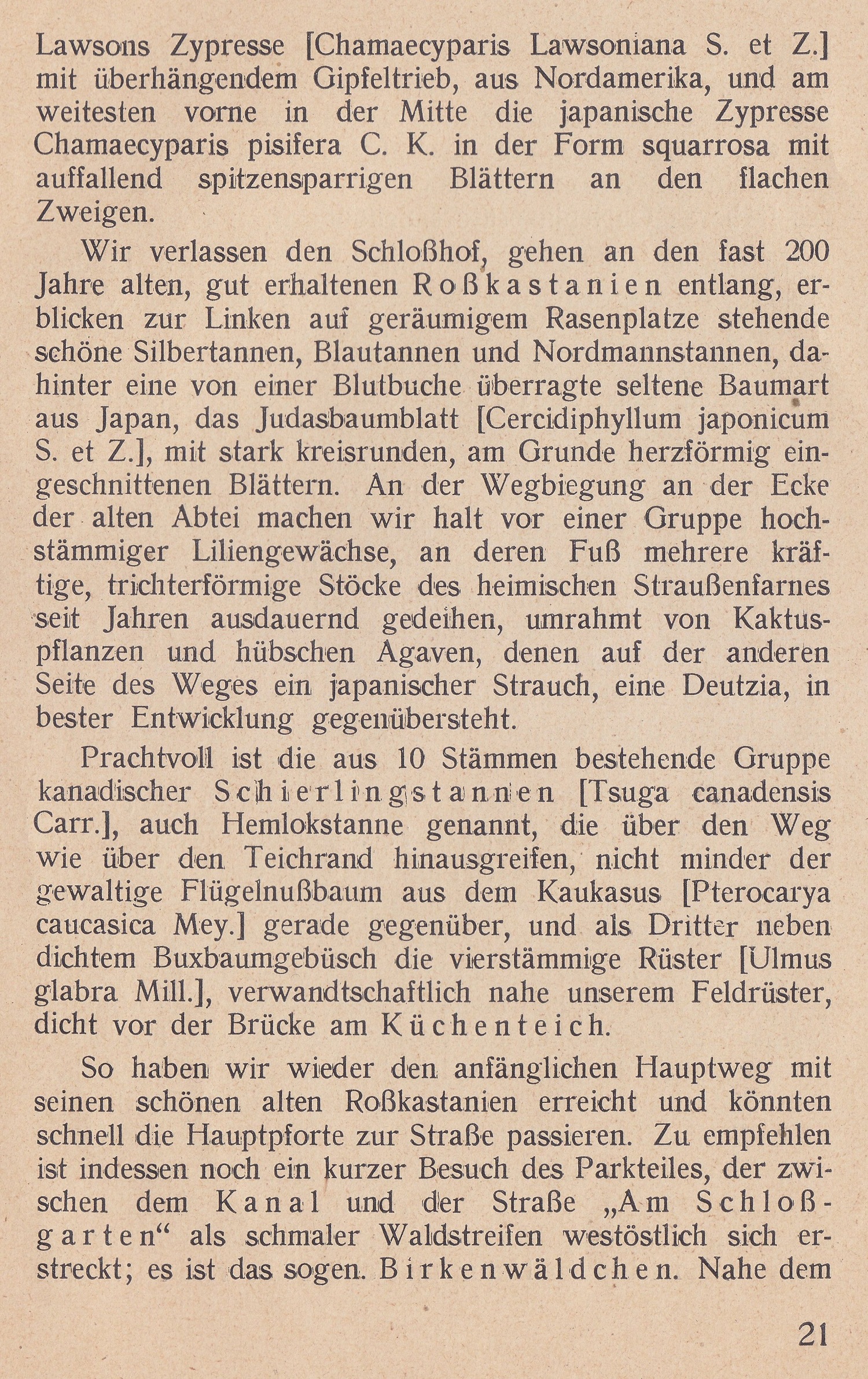 Wir verlassen den Schloßhof, gehen an den fast 200 Jahre alten, gut erhaltenen Roßkastanien entlang, erblicken zur Linken auf geräumigem Rasenplatze stehende schöne Silbertannen, Blautannen und Nordmannstannen, dahinter eine von einer Blutbuche überragte seltene Baumart aus Japan, das Judasbaumblatt [Cercidiphyllum japonicum S. et Z.], mit stark kreisrunden, am Grunde herzförmig eingeschnittenen Blättern. An der Wegbiegung an der Ecke der alten Abtei machen wir halt vor einer Gruppe hochstämmiger Liliengewächse, an deren Fuß mehrere kräftige, trichterförmige Stöcke des heimischen Straußenfarnes seit Jahren ausdauernd gedeihen, umrahmt von Kaktuspflanzen und hübschen Agaven, denen auf der anderen Seite des Weges ein japanischer Strauch, eine Deutzia, in bester Entwicklung gegenübersteht.