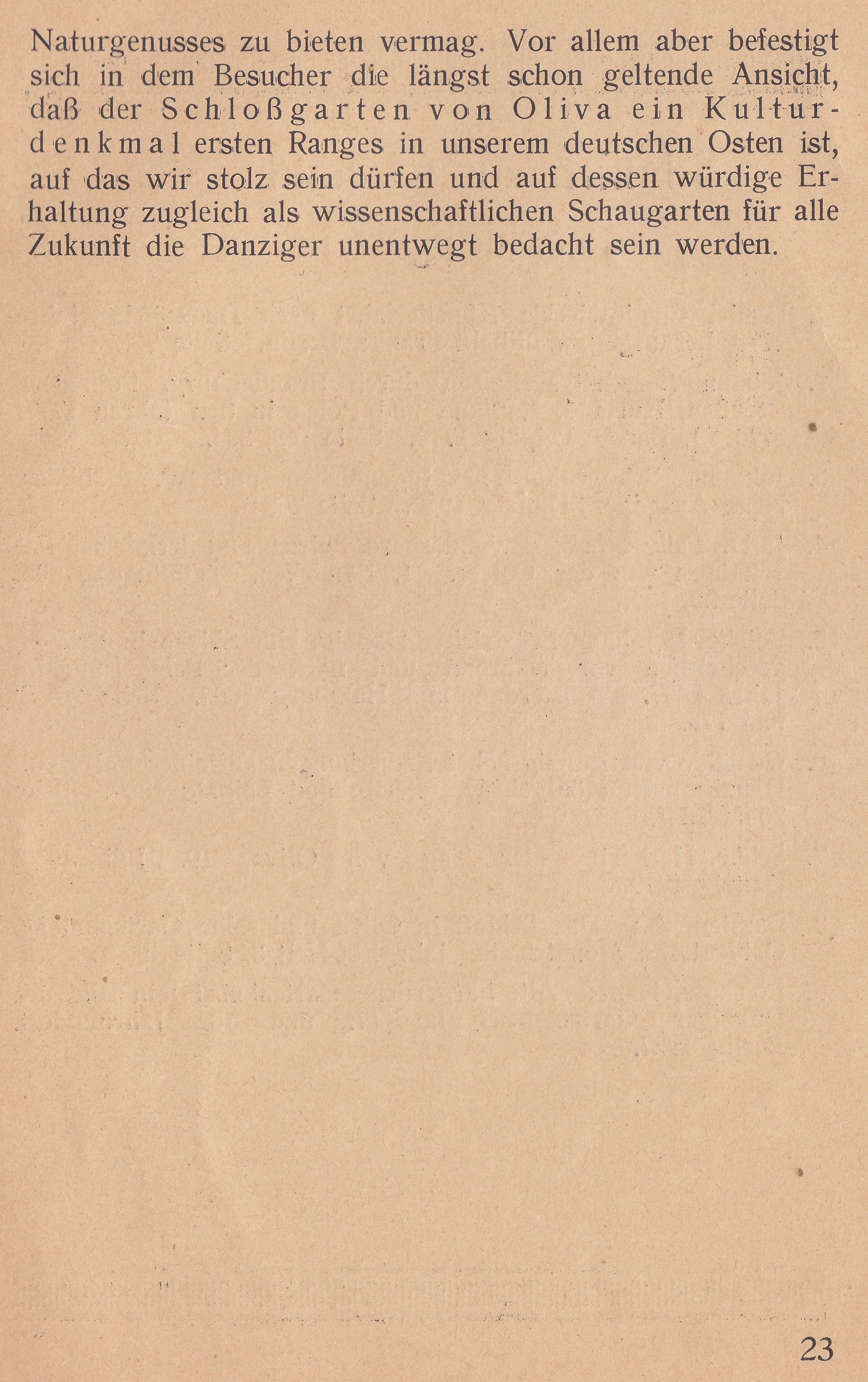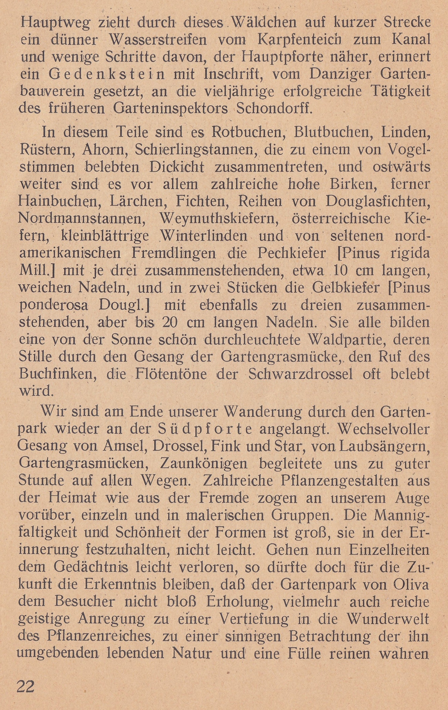 Wir sind am Ende unserer Wanderung durch den Gartenpark wieder an der Südpforte angelangt. Wechselvoller Gesang von Amsel, Drossel, Fink und Star, von Laubsängern, Gartengrasmücken, Zaunkönigen begleitete uns zu guter Stunde auf allen Wegen. Zahlreiche Pflanzengestalten aus der Heimat wie aus der Fremde zogen an unserem Auge vorüber, einzeln und in malerischen Gruppen. Die Mannigfaltigkeit und Schönheit der Formen ist groß, sie in der Erinnerung festzuhalten, nicht leicht. Gehen nun Einzelheiten dem Gedächtnis leicht verloren, so dürfte doch für die Zukunft die Erkenntnis bleiben, daß der Gartenpark von Oliva dem Besucher nicht bloß Erholung, vielmehr auch reiche geistige Anregung zu einer Vertiefung in die Wunderwelt des Pflanzenreiches, zu einer sinnigen Betrachtung der ihn umgebenden lebenden Natur und eine Fülle reinen wahren Naturgenusses zu bieten vermag. Vor allem aber befestigt sich in dem Besucher die längst schon geltende Ansicht, daß der Schloßgarten von Oliva ein Kulturdenkmal ersten Ranges in unserem deutschen Osten ist, auf das wir stolz sein dürfen und auf dessen würdige Erhaltung zugleich als wissenschaftlichen Schaugarten für alle Zukunft die Danziger unentwegt bedacht sein werden.