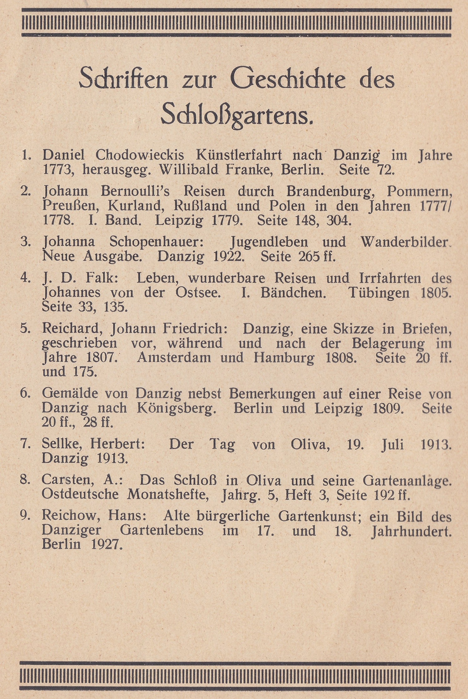 Ogród Zamkowy w Oliwie jest najstarszym tego typu ogrodem na terenie Wolnego Miasta Gdańska. Wraz z ogrodami na północnej i południowej fasadzie zamku, stanowi on wzór architektury ogrodowej z drugiej połowy XVIII wieku, imponujący w swoim efekcie, będąc zarówno ozdobą Oliwy, jak i atrakcją turystyczną w całych wschodnich Niemczech. Oliwa, z katedrą, zamkiem, obecnie Państwowym Muzeum Historii Gdańska, oraz rozległym parkiem, jest celem podróży dla licznych obcokrajowców, którzy rozumieją i rozumieją harmonijne współistnienie sztuki i natury. Cenimy ten park przy dawnym opactwie cysterskim jako pomnik szlachetnego rzemiosła z minionych czasów; rozkoszujemy się duchową przyjemnością, jaką oferuje dziś i pielęgnujemy go jako wzór godny naśladowania w przyszłych działaniach. Szczegółowy opis tego wspaniale zaaranżowanego i pięknie rozbudowanego parku w niniejszym tekście jest po prostu obowiązkiem wdzięczności wobec ludzi, którzy dokonali tak wybitnych rzeczy.