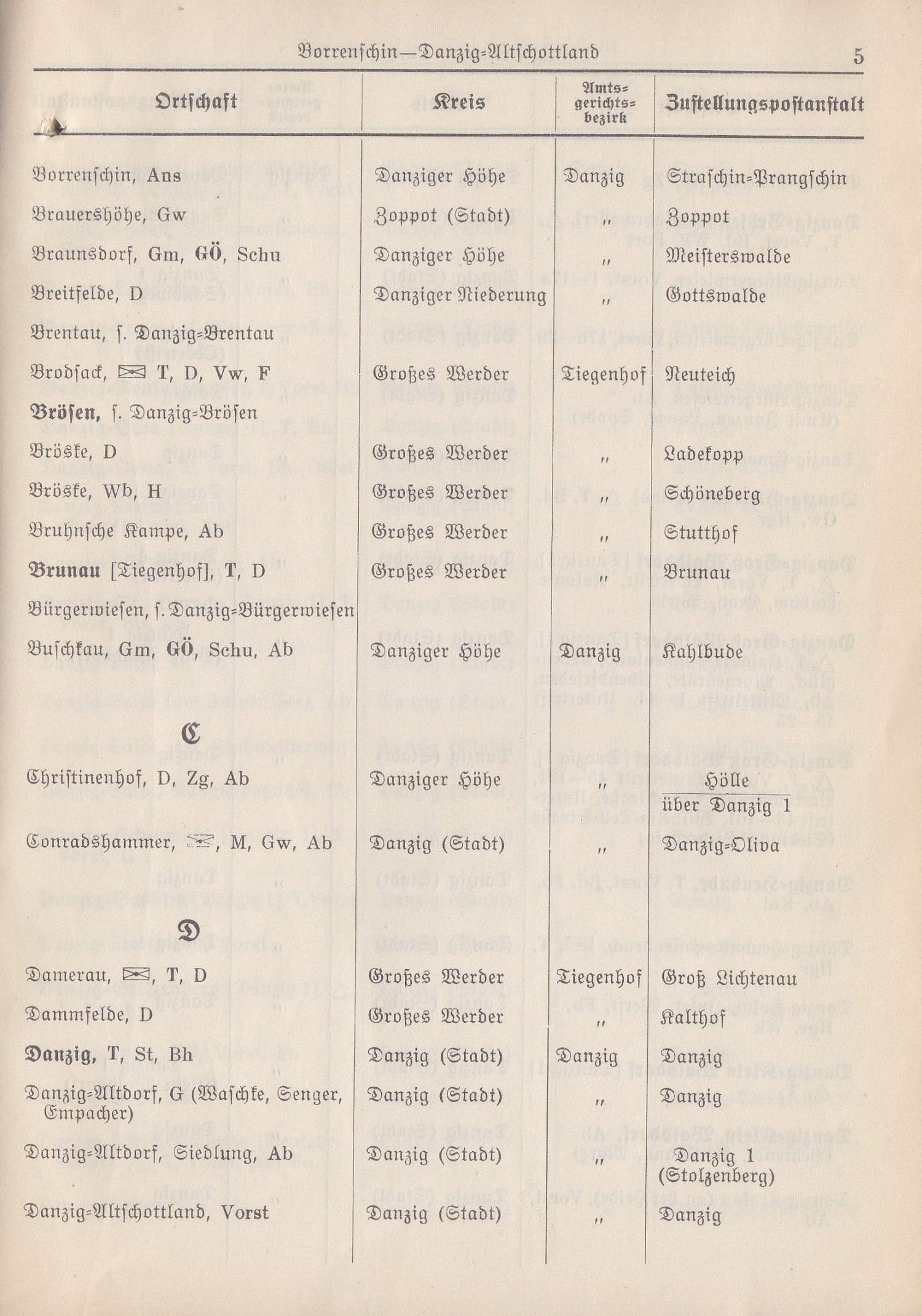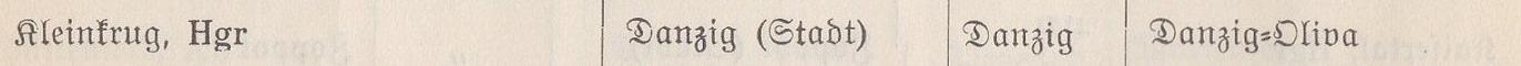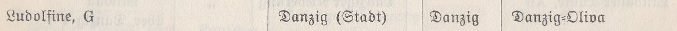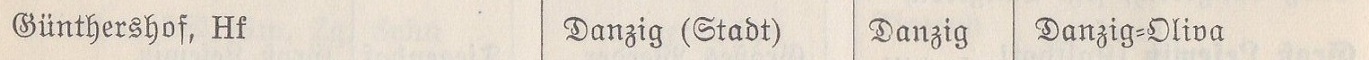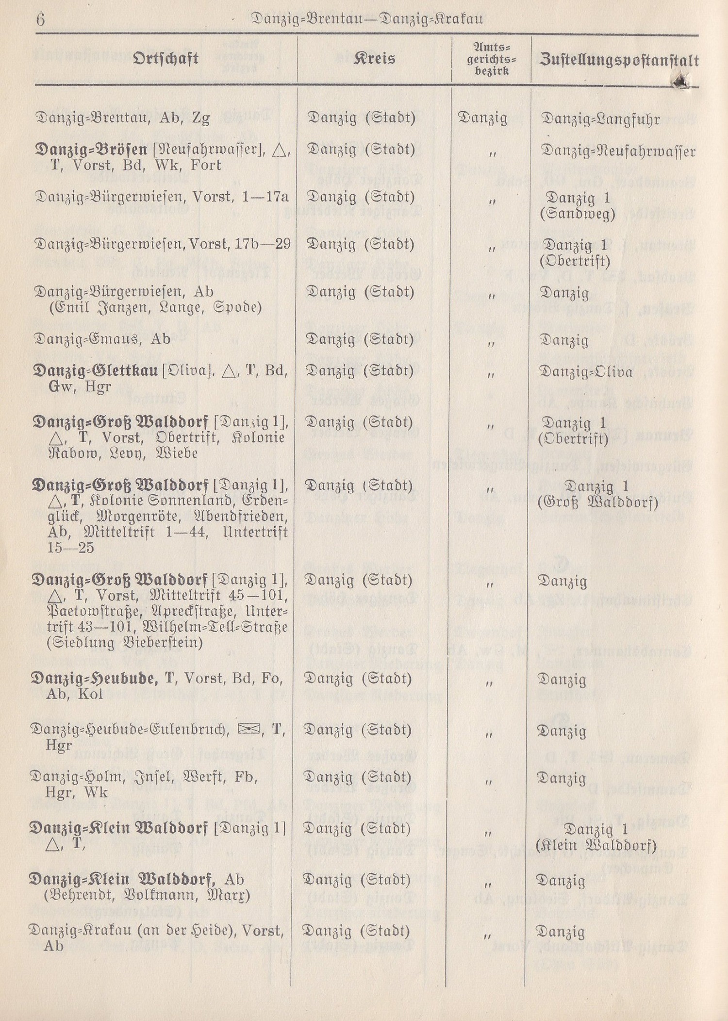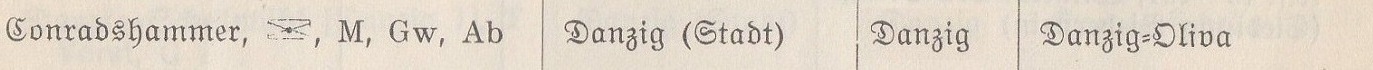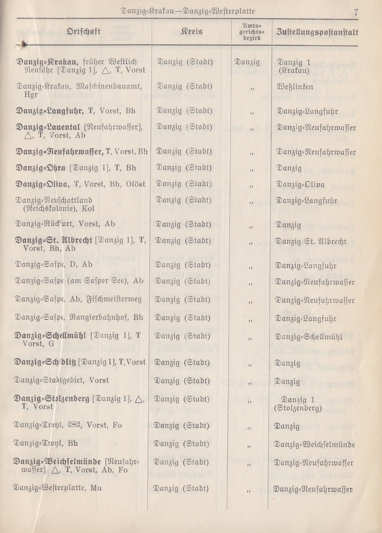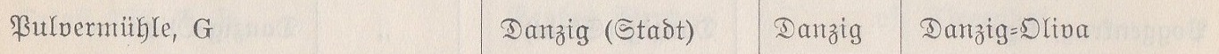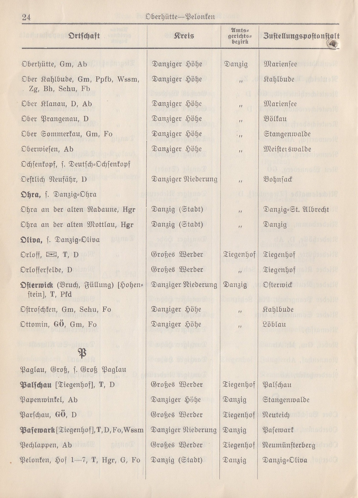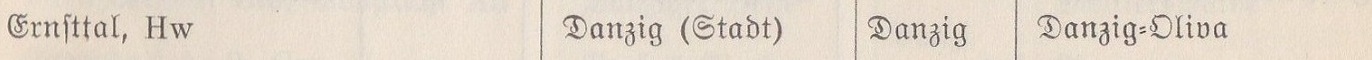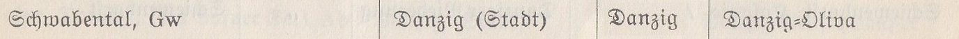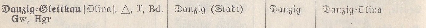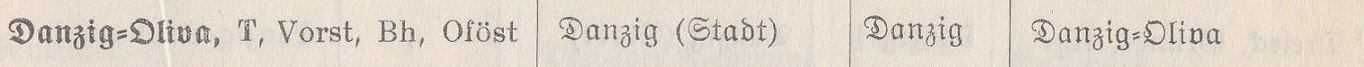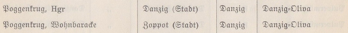 Verzeichnis sämtlicher Ortschaften im Gebeit der Freien Stadt Danzig › 1938 Spis wszystkich miejscowości na terenie Wolnego Miasta Gdańska Wydane do oficjalnego użytku urzędów pocztowych Zbiory Mirosłąwa Piskorskiego A, B, C, D, E, F, G, H, J, K, L, M, N, O, P, Q, R, S, T, U, V, W, Z. ![]() ![]() WYPIS OLIWA ![]() ![]() Str. 5: Conradshammer, Posthilfstelle, Mühle, Gastwirtschaft, Abbau, Ausbau (Pomorska 68) ![]() Str. 6: Danzig-Glettkau [Oliva], Poststelle, Telegraphenanstalt, Bad, Badevort, Gastwirtschaft, Haüfergruppe (Kapliczna) ![]() Str. 7: Danzig-Oliva, Telegraphenanstalt, Vorstadt, Bahnhof, Oberförsterei (Rybińskiego 8) ![]() Str. 9: Ernsttal, Hammerwerk (Bytowska 1, Bytowska 1b) ![]() Str. 9: Freudenthal, Forsthaus, Försterei, Gastwirtschaft (Bytowska 5) ![]() Str. 9: Frischwasser, Abbau, Ausbau (Kościerska) ![]() Str. 12: Günthershof, Hof, Hofstelle (Pomorska 98) ![]() Str. 15: Kehrwieder, Abbau, Ausbau (Zawroty) ![]() Str. 16: Kleinkrug, Haüsergruppe (Grunwaldzka) ![]() Str. 20: Ludolfine, Gut, Gehöft (Czyżewskiego 29) ![]() Str. 24: Pelonken, Hof 1-7, Telegraphenanstalt, Haüsergruppe, Gut, Gehöft, Forsthaus, Försterei (Polanki) ![]() Str. 25: Poggenkrug, Haüsergruppe, Wohnbaracke (Gospody) ![]() Str. 26: Pulvermühle, Gut, Gehöft (Kościerska 12) ![]() Str. 27: Renneberg, Telegraphenanstalt, Forsthaus, Försterei, Haüsergruppe (Spacerowa 1-4) ![]() Str. 30: Schwabental, Gastwirtschaft (Bytowska 4) ![]() Str. 32: Strauchmühle, Gastwirtschaft (Karwieńska 3) ![]() Str. 32: Tiefenthal, Abbau, Ausbau (Kwietna /14-20/)