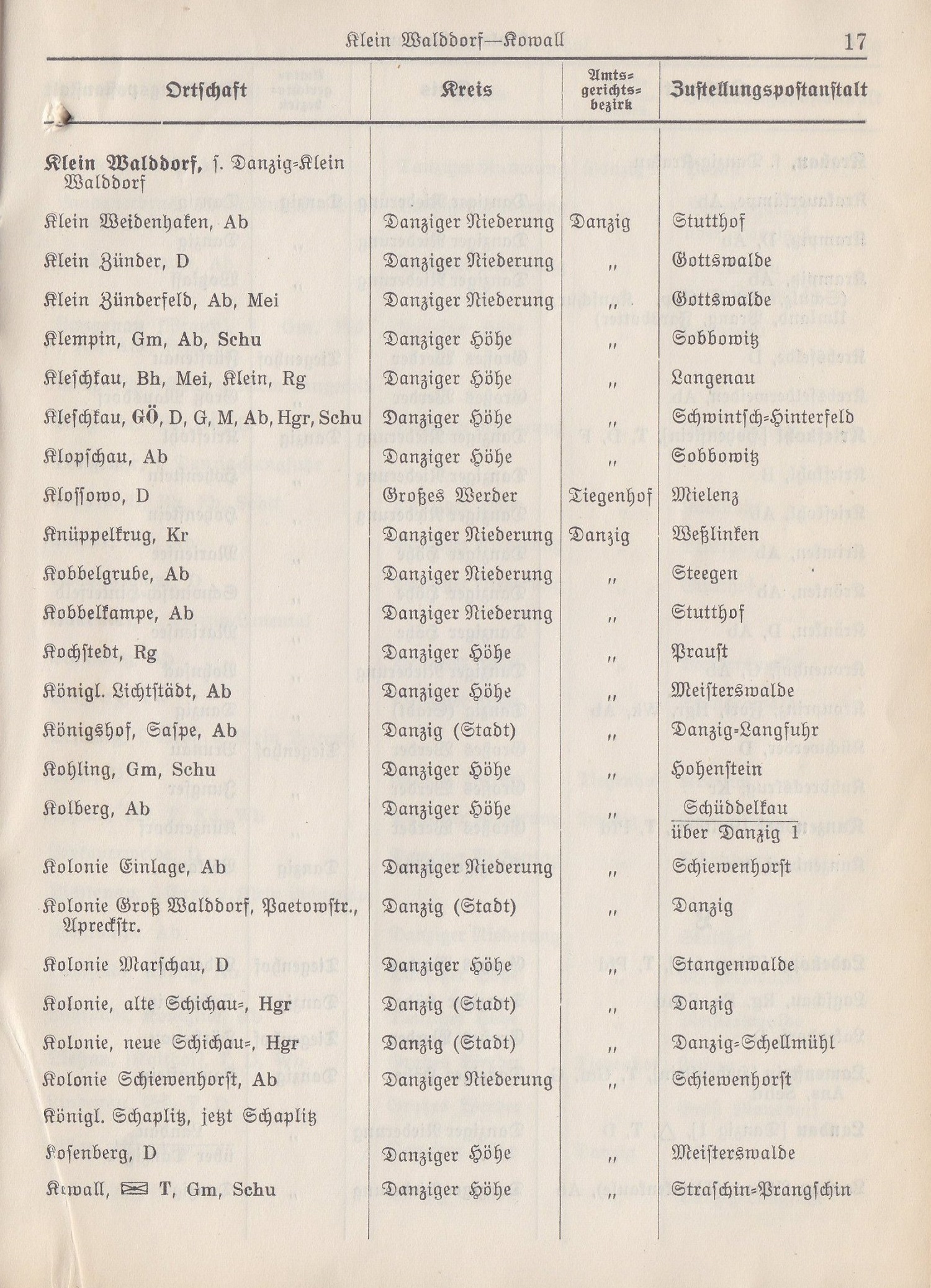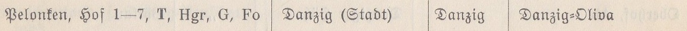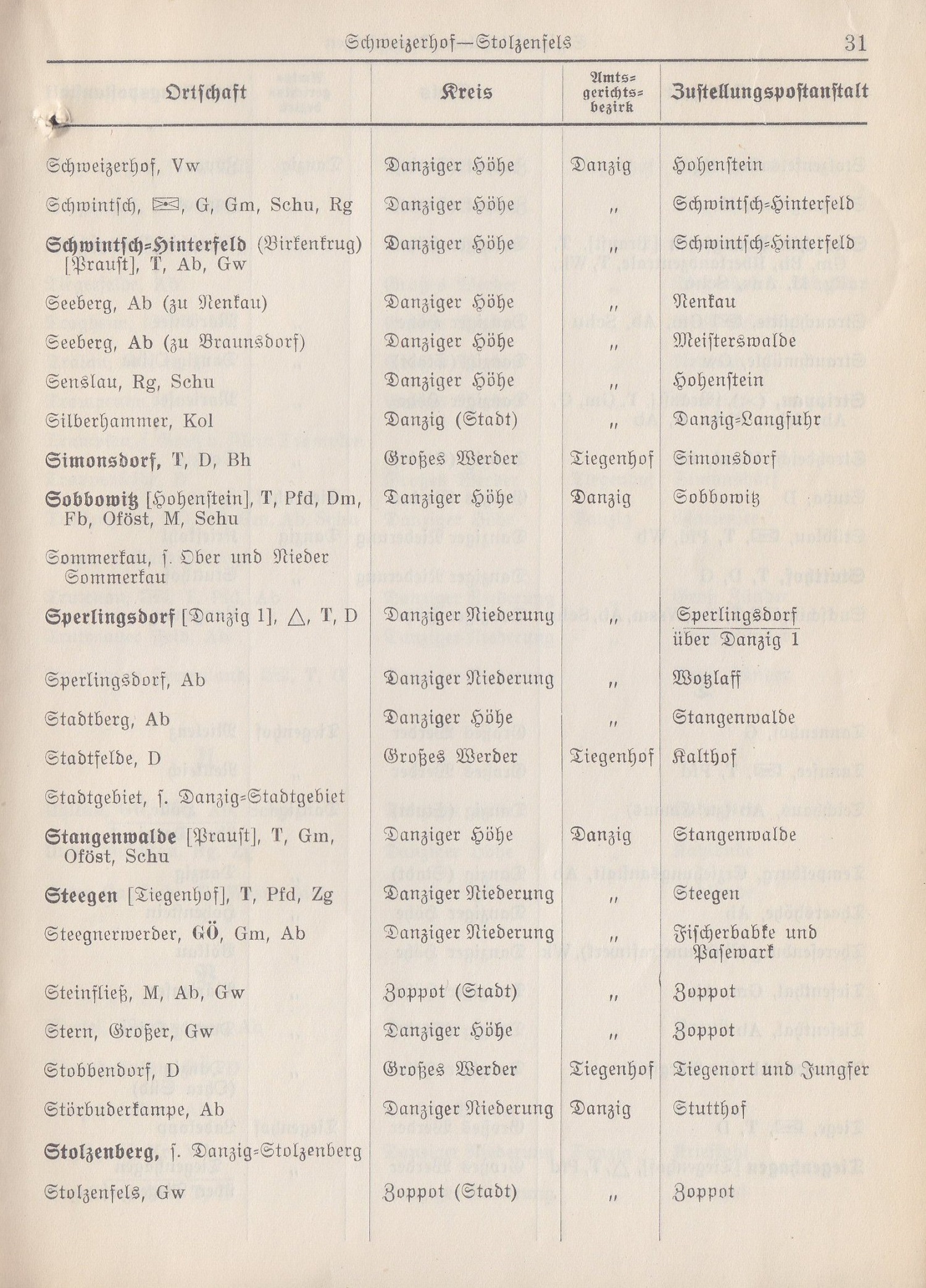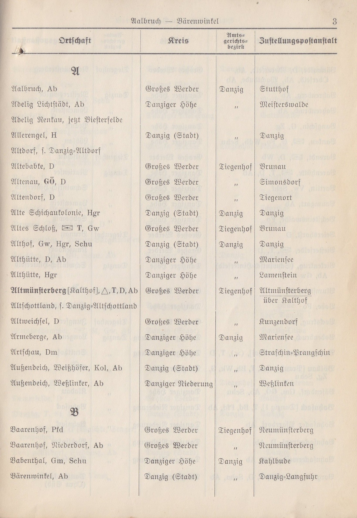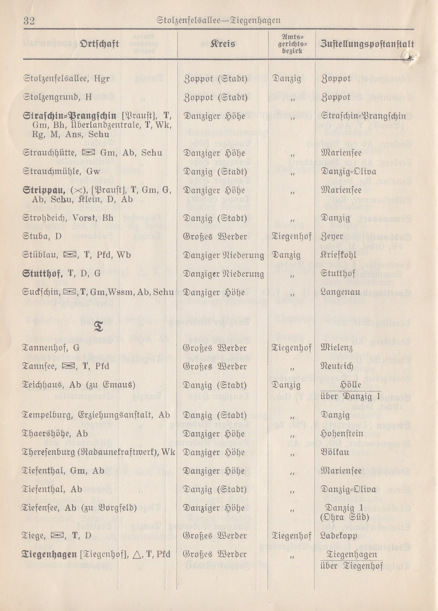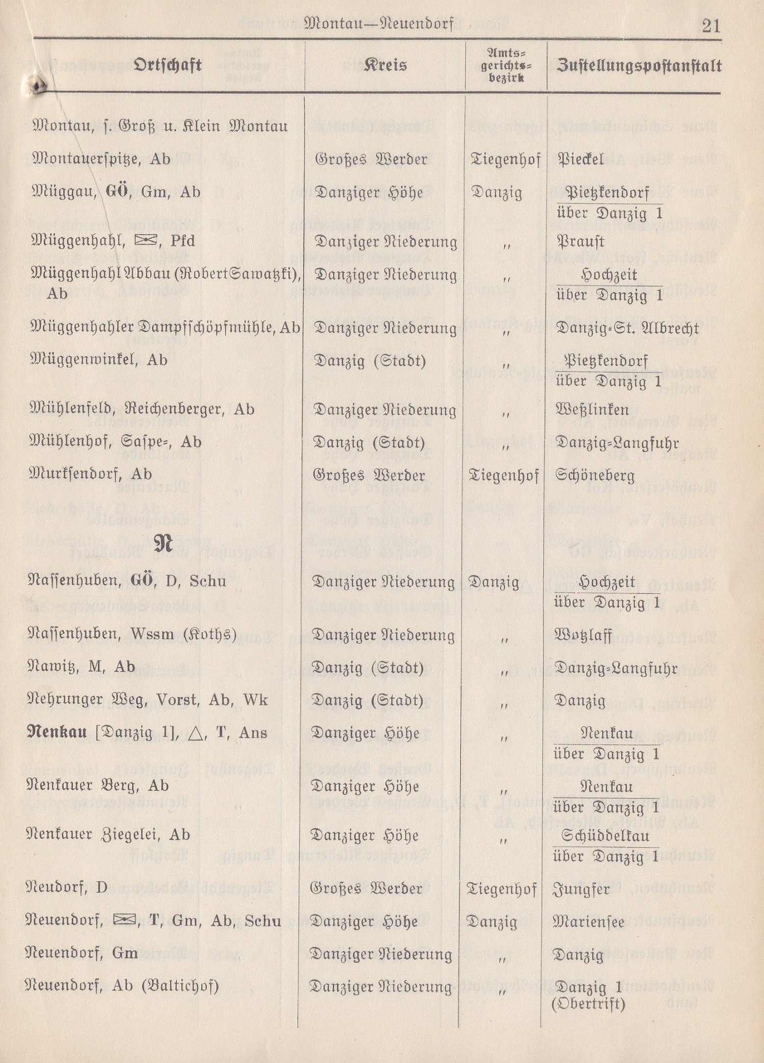 Verzeichnis sämtlicher Ortschaften im Gebeit der Freien Stadt Danzig › 1938 Spis wszystkich miejscowości na terenie Wolnego Miasta Gdańska Wydane do oficjalnego użytku urzędów pocztowych Zbiory Mirosłąwa Piskorskiego A, B, C, D, E, F, G, H, J, K, L, M, N, O, P, Q, R, S, T, U, V, W, Z. ![]() ![]() WYPIS OLIWA ![]() ![]() Str. 5: Conradshammer, Posthilfstelle, Mühle, Gastwirtschaft, Abbau, Ausbau (Pomorska 68) ![]() Str. 6: Danzig-Glettkau [Oliva], Poststelle, Telegraphenanstalt, Bad, Badevort, Gastwirtschaft, Haüfergruppe (Kapliczna) ![]() Str. 7: Danzig-Oliva, Telegraphenanstalt, Vorstadt, Bahnhof, Oberförsterei (Rybińskiego 8) ![]() Str. 9: Ernsttal, Hammerwerk (Bytowska 1, Bytowska 1b) ![]() Str. 9: Freudenthal, Forsthaus, Försterei, Gastwirtschaft (Bytowska 5) ![]() Str. 9: Frischwasser, Abbau, Ausbau (Kościerska) ![]() Str. 12: Günthershof, Hof, Hofstelle (Pomorska 98) ![]() Str. 15: Kehrwieder, Abbau, Ausbau (Zawroty) ![]() Str. 16: Kleinkrug, Haüsergruppe (Grunwaldzka) ![]() Str. 20: Ludolfine, Gut, Gehöft (Czyżewskiego 29) ![]() Str. 24: Pelonken, Hof 1-7, Telegraphenanstalt, Haüsergruppe, Gut, Gehöft, Forsthaus, Försterei (Polanki) ![]() Str. 25: Poggenkrug, Haüsergruppe, Wohnbaracke (Gospody) ![]() Str. 26: Pulvermühle, Gut, Gehöft (Kościerska 12) ![]() Str. 27: Renneberg, Telegraphenanstalt, Forsthaus, Försterei, Haüsergruppe (Spacerowa 1-4) ![]() Str. 30: Schwabental, Gastwirtschaft (Bytowska 4) ![]() Str. 32: Strauchmühle, Gastwirtschaft (Karwieńska 3) ![]() Str. 32: Tiefenthal, Abbau, Ausbau (Kwietna /14-20/)