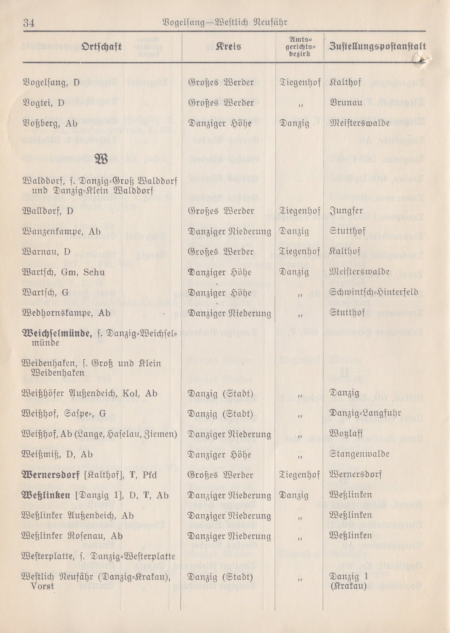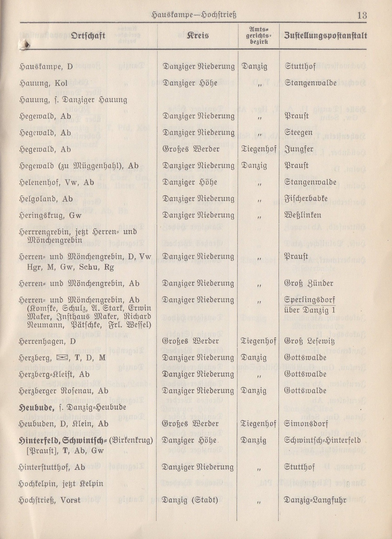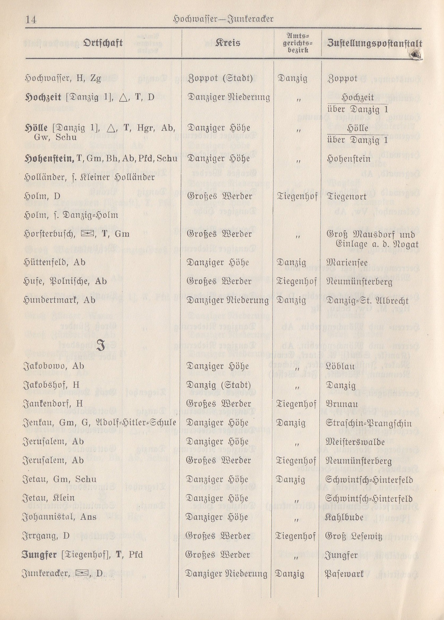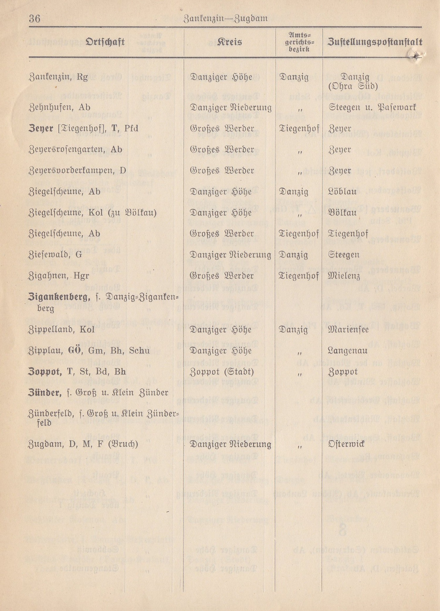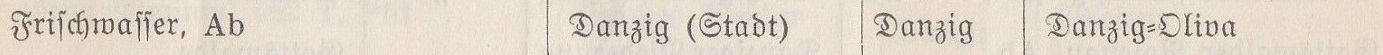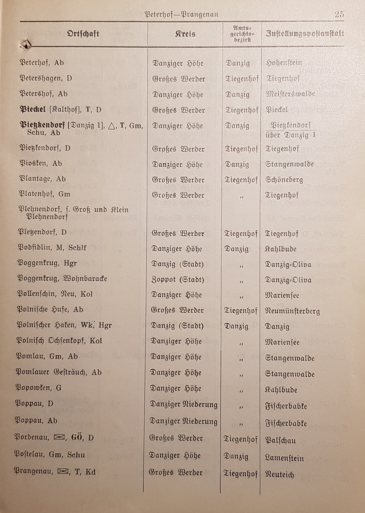 Verzeichnis sämtlicher Ortschaften im Gebeit der Freien Stadt Danzig › 1938 Spis wszystkich miejscowości na terenie Wolnego Miasta Gdańska Wydane do oficjalnego użytku urzędów pocztowych Zbiory Mirosłąwa Piskorskiego A, B, C, D, E, F, G, H, J, K, L, M, N, O, P, Q, R, S, T, U, V, W, Z. ![]() ![]() WYPIS OLIWA ![]() ![]() Str. 5: Conradshammer, Posthilfstelle, Mühle, Gastwirtschaft, Abbau, Ausbau (Pomorska 68) ![]() Str. 6: Danzig-Glettkau [Oliva], Poststelle, Telegraphenanstalt, Bad, Badevort, Gastwirtschaft, Haüfergruppe (Kapliczna) ![]() Str. 7: Danzig-Oliva, Telegraphenanstalt, Vorstadt, Bahnhof, Oberförsterei (Rybińskiego 8) ![]() Str. 9: Ernsttal, Hammerwerk (Bytowska 1, Bytowska 1b) ![]() Str. 9: Freudenthal, Forsthaus, Försterei, Gastwirtschaft (Bytowska 5) ![]() Str. 9: Frischwasser, Abbau, Ausbau (Kościerska) ![]() Str. 12: Günthershof, Hof, Hofstelle (Pomorska 98) ![]() Str. 15: Kehrwieder, Abbau, Ausbau (Zawroty) ![]() Str. 16: Kleinkrug, Haüsergruppe (Grunwaldzka) ![]() Str. 20: Ludolfine, Gut, Gehöft (Czyżewskiego 29) ![]() Str. 24: Pelonken, Hof 1-7, Telegraphenanstalt, Haüsergruppe, Gut, Gehöft, Forsthaus, Försterei (Polanki) ![]() Str. 25: Poggenkrug, Haüsergruppe, Wohnbaracke (Gospody) ![]() Str. 26: Pulvermühle, Gut, Gehöft (Kościerska 12) ![]() Str. 27: Renneberg, Telegraphenanstalt, Forsthaus, Försterei, Haüsergruppe (Spacerowa 1-4) ![]() Str. 30: Schwabental, Gastwirtschaft (Bytowska 4) ![]() Str. 32: Strauchmühle, Gastwirtschaft (Karwieńska 3) ![]() Str. 32: Tiefenthal, Abbau, Ausbau (Kwietna /14-20/)