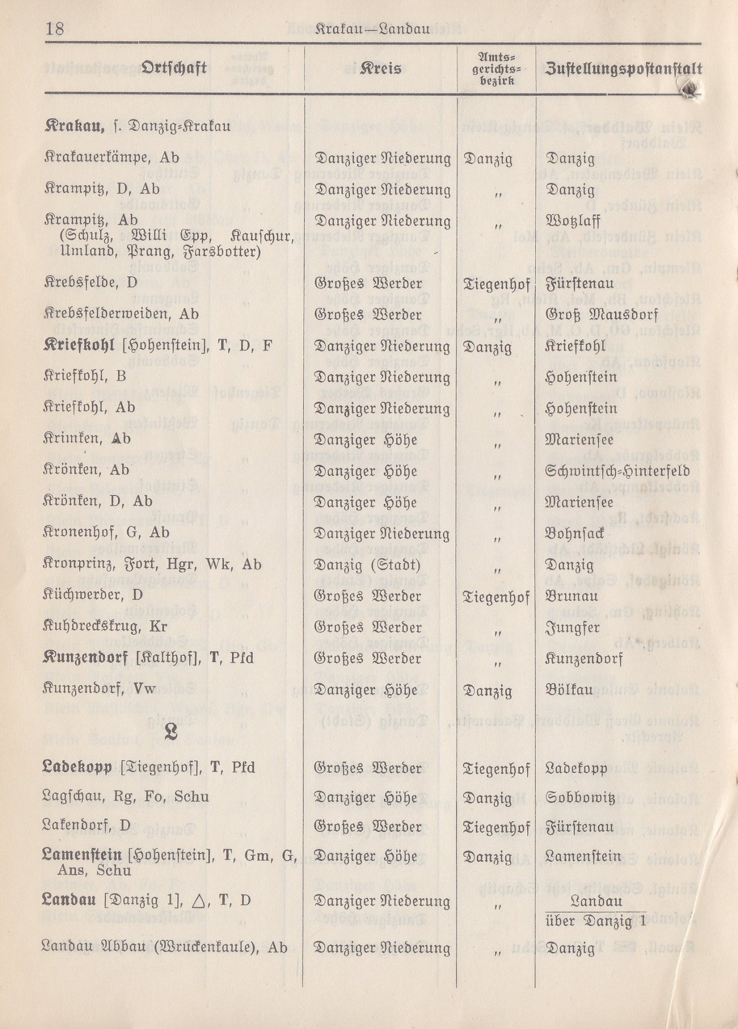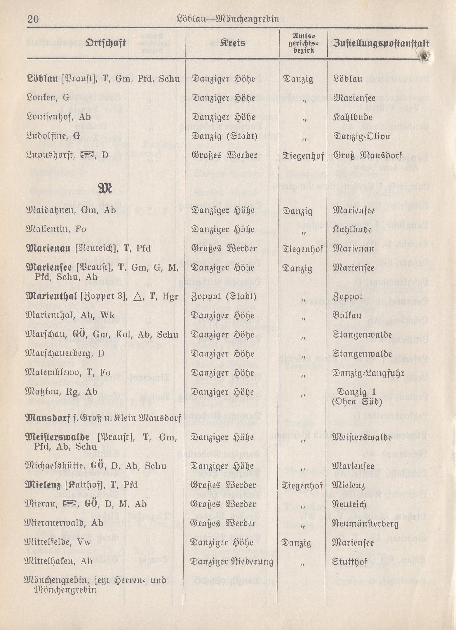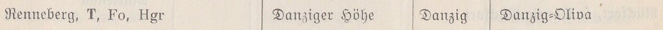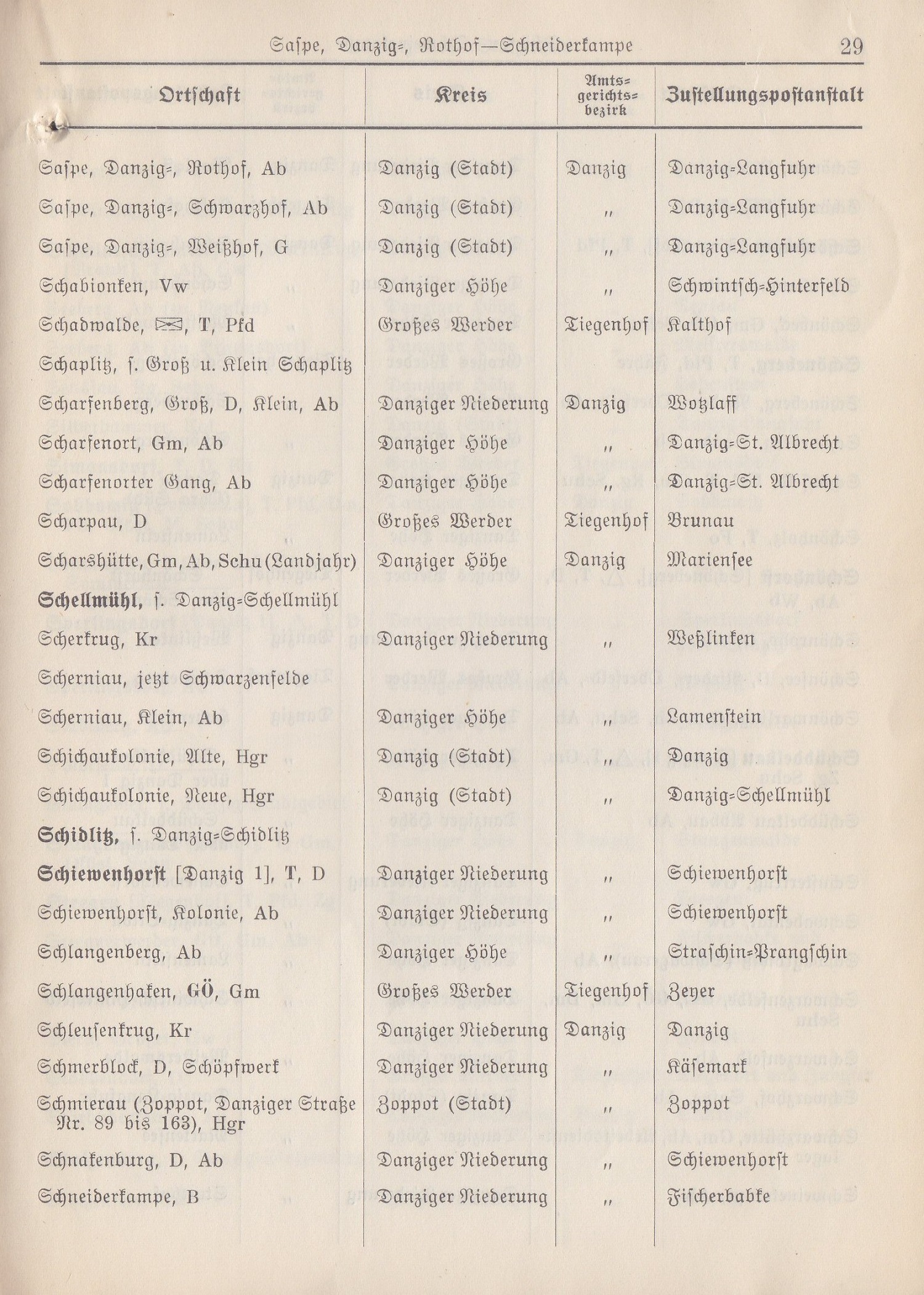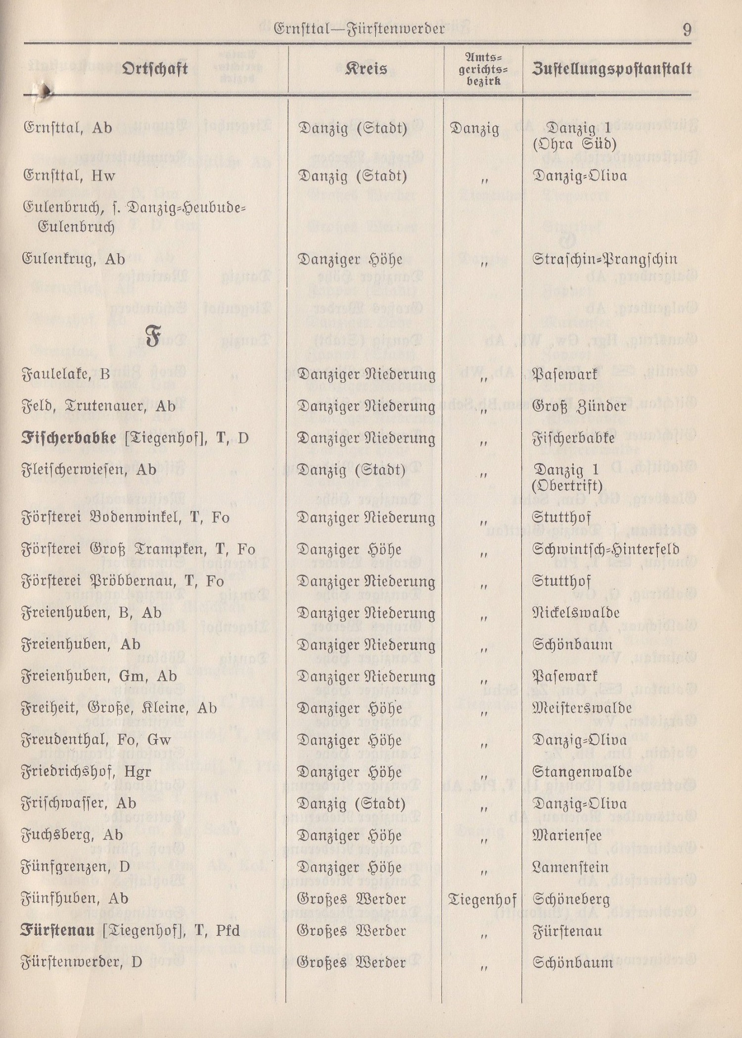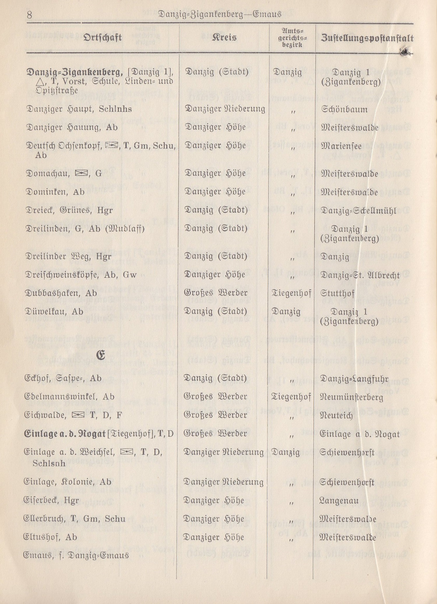 Verzeichnis sämtlicher Ortschaften im Gebeit der Freien Stadt Danzig › 1938 Spis wszystkich miejscowości na terenie Wolnego Miasta Gdańska Wydane do oficjalnego użytku urzędów pocztowych Zbiory Mirosłąwa Piskorskiego A, B, C, D, E, F, G, H, J, K, L, M, N, O, P, Q, R, S, T, U, V, W, Z. ![]() ![]() WYPIS OLIWA ![]() ![]() Str. 5: Conradshammer, Posthilfstelle, Mühle, Gastwirtschaft, Abbau, Ausbau (Pomorska 68) ![]() Str. 6: Danzig-Glettkau [Oliva], Poststelle, Telegraphenanstalt, Bad, Badevort, Gastwirtschaft, Haüfergruppe (Kapliczna) ![]() Str. 7: Danzig-Oliva, Telegraphenanstalt, Vorstadt, Bahnhof, Oberförsterei (Rybińskiego 8) ![]() Str. 9: Ernsttal, Hammerwerk (Bytowska 1, Bytowska 1b) ![]() Str. 9: Freudenthal, Forsthaus, Försterei, Gastwirtschaft (Bytowska 5) ![]() Str. 9: Frischwasser, Abbau, Ausbau (Kościerska) ![]() Str. 12: Günthershof, Hof, Hofstelle (Pomorska 98) ![]() Str. 15: Kehrwieder, Abbau, Ausbau (Zawroty) ![]() Str. 16: Kleinkrug, Haüsergruppe (Grunwaldzka) ![]() Str. 20: Ludolfine, Gut, Gehöft (Czyżewskiego 29) ![]() Str. 24: Pelonken, Hof 1-7, Telegraphenanstalt, Haüsergruppe, Gut, Gehöft, Forsthaus, Försterei (Polanki) ![]() Str. 25: Poggenkrug, Haüsergruppe, Wohnbaracke (Gospody) ![]() Str. 26: Pulvermühle, Gut, Gehöft (Kościerska 12) ![]() Str. 27: Renneberg, Telegraphenanstalt, Forsthaus, Försterei, Haüsergruppe (Spacerowa 1-4) ![]() Str. 30: Schwabental, Gastwirtschaft (Bytowska 4) ![]() Str. 32: Strauchmühle, Gastwirtschaft (Karwieńska 3) ![]() Str. 32: Tiefenthal, Abbau, Ausbau (Kwietna /14-20/)