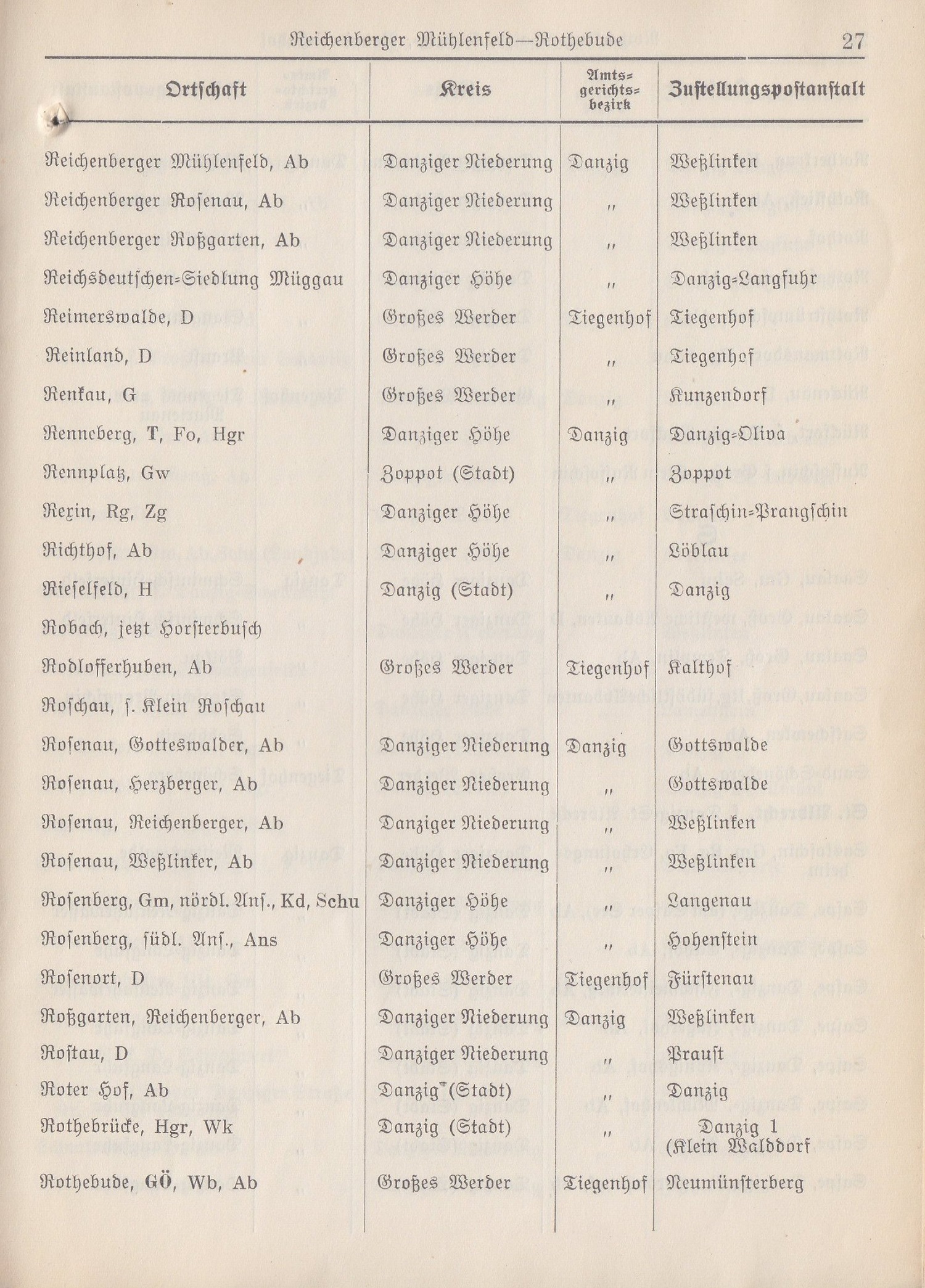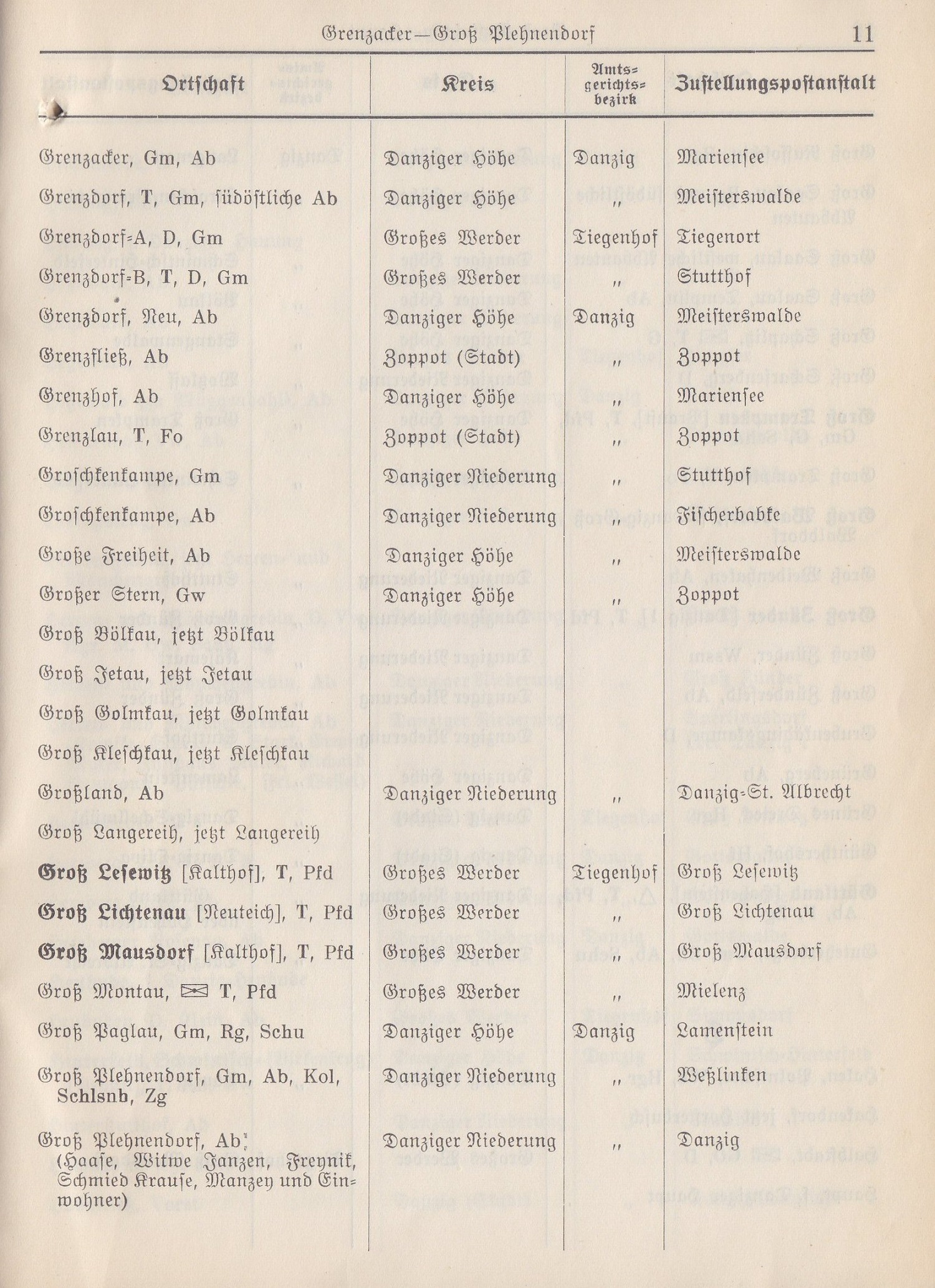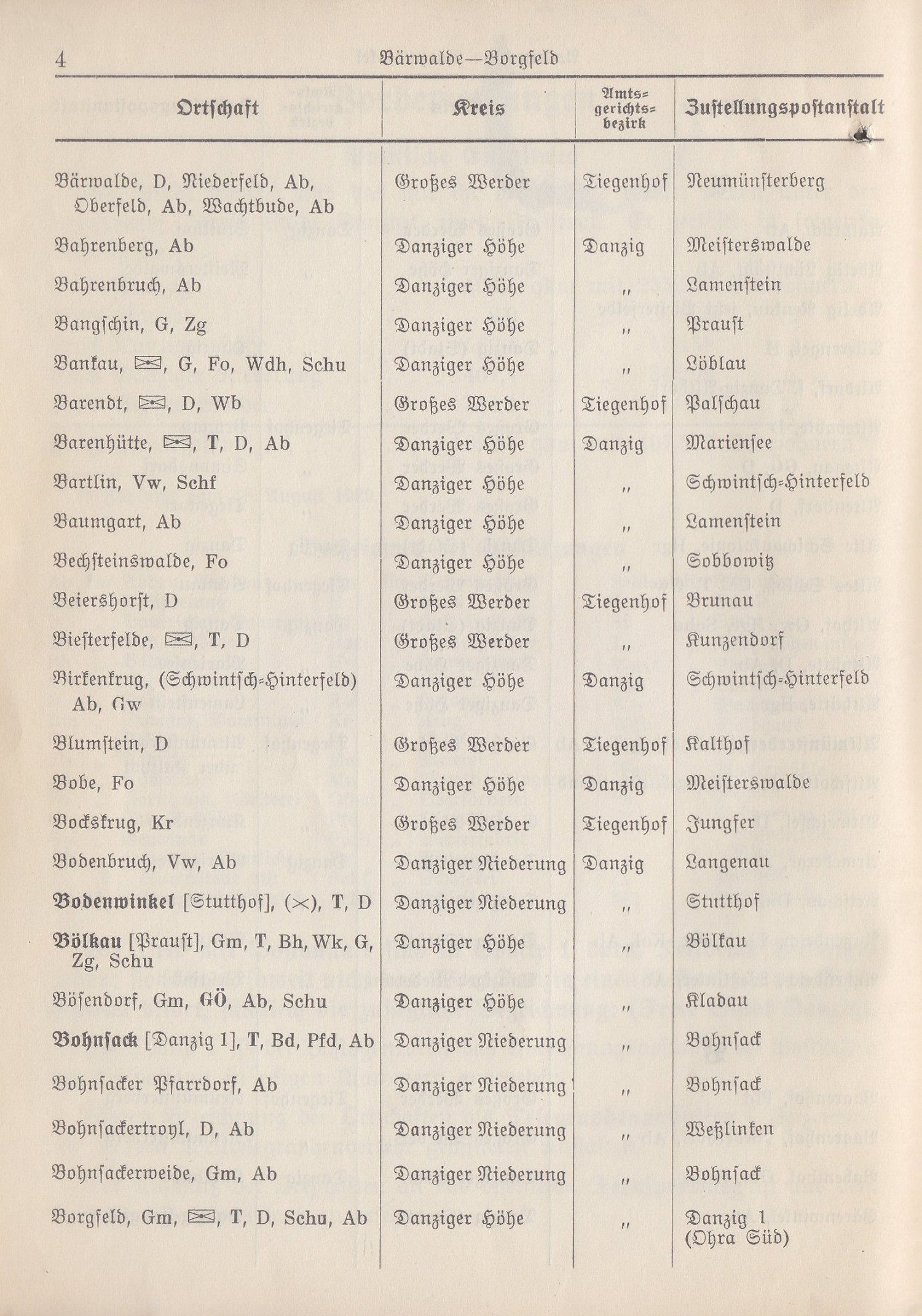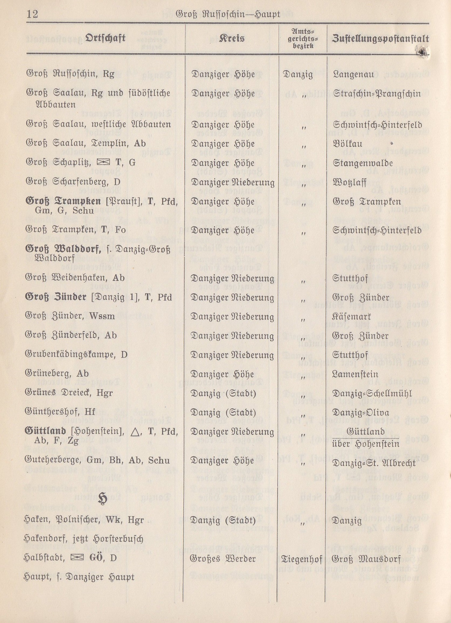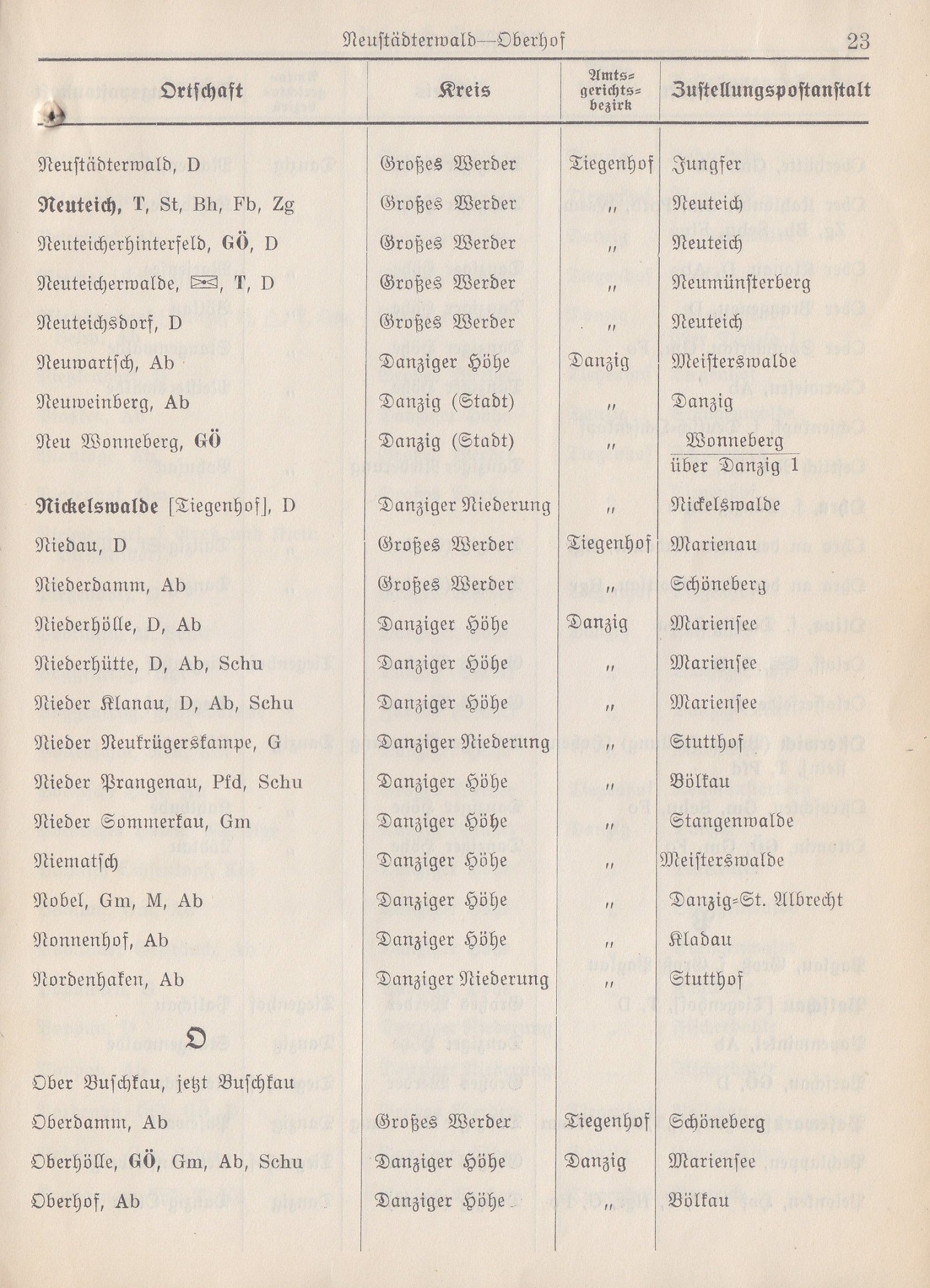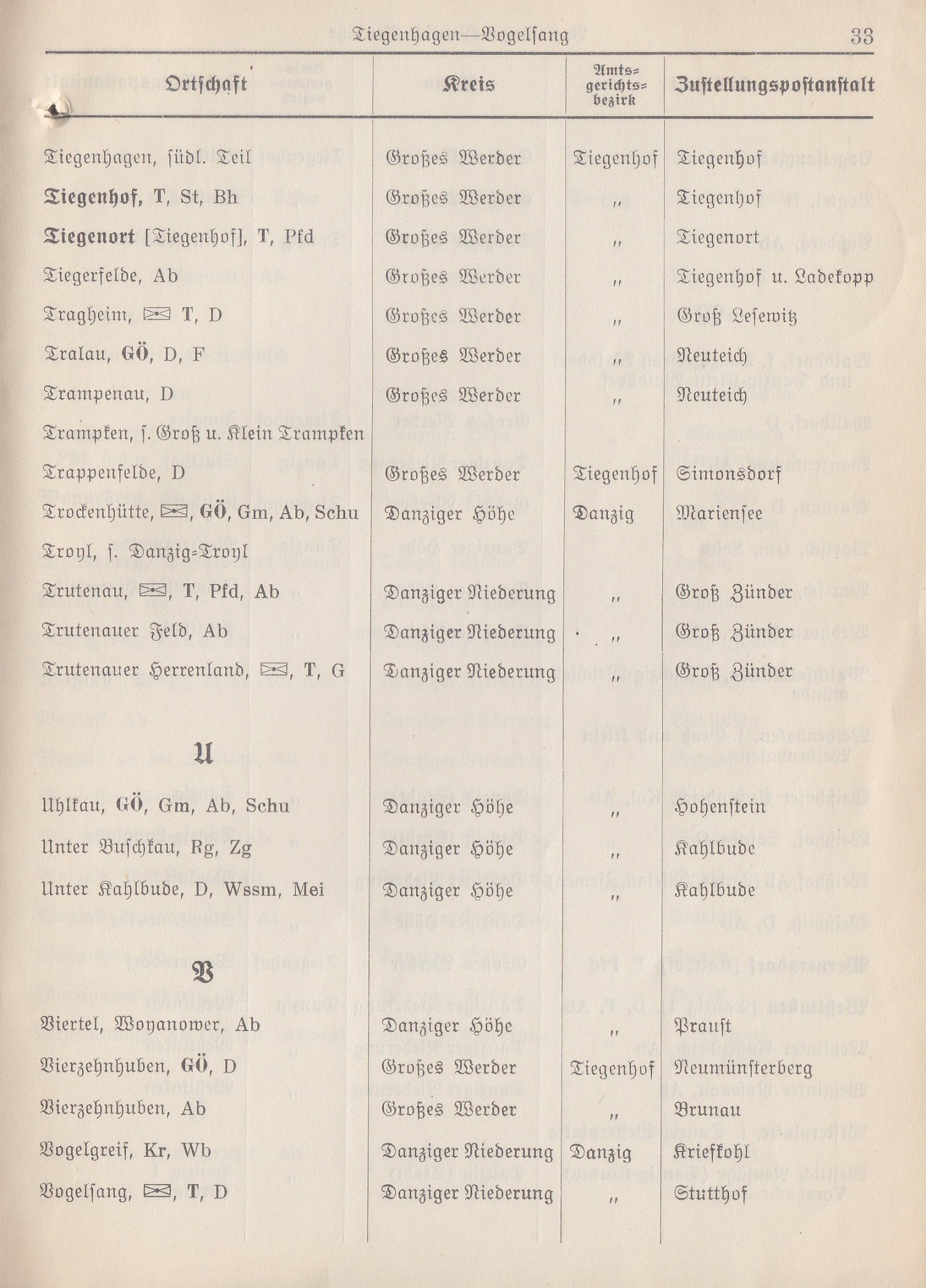 Verzeichnis sämtlicher Ortschaften im Gebeit der Freien Stadt Danzig › 1938 Spis wszystkich miejscowości na terenie Wolnego Miasta Gdańska Wydane do oficjalnego użytku urzędów pocztowych Zbiory Mirosłąwa Piskorskiego A, B, C, D, E, F, G, H, J, K, L, M, N, O, P, Q, R, S, T, U, V, W, Z. ![]() ![]() WYPIS OLIWA ![]() ![]() Str. 5: Conradshammer, Posthilfstelle, Mühle, Gastwirtschaft, Abbau, Ausbau (Pomorska 68) ![]() Str. 6: Danzig-Glettkau [Oliva], Poststelle, Telegraphenanstalt, Bad, Badevort, Gastwirtschaft, Haüfergruppe (Kapliczna) ![]() Str. 7: Danzig-Oliva, Telegraphenanstalt, Vorstadt, Bahnhof, Oberförsterei (Rybińskiego 8) ![]() Str. 9: Ernsttal, Hammerwerk (Bytowska 1, Bytowska 1b) ![]() Str. 9: Freudenthal, Forsthaus, Försterei, Gastwirtschaft (Bytowska 5) ![]() Str. 9: Frischwasser, Abbau, Ausbau (Kościerska) ![]() Str. 12: Günthershof, Hof, Hofstelle (Pomorska 98) ![]() Str. 15: Kehrwieder, Abbau, Ausbau (Zawroty) ![]() Str. 16: Kleinkrug, Haüsergruppe (Grunwaldzka) ![]() Str. 20: Ludolfine, Gut, Gehöft (Czyżewskiego 29) ![]() Str. 24: Pelonken, Hof 1-7, Telegraphenanstalt, Haüsergruppe, Gut, Gehöft, Forsthaus, Försterei (Polanki) ![]() Str. 25: Poggenkrug, Haüsergruppe, Wohnbaracke (Gospody) ![]() Str. 26: Pulvermühle, Gut, Gehöft (Kościerska 12) ![]() Str. 27: Renneberg, Telegraphenanstalt, Forsthaus, Försterei, Haüsergruppe (Spacerowa 1-4) ![]() Str. 30: Schwabental, Gastwirtschaft (Bytowska 4) ![]() Str. 32: Strauchmühle, Gastwirtschaft (Karwieńska 3) ![]() Str. 32: Tiefenthal, Abbau, Ausbau (Kwietna /14-20/)
