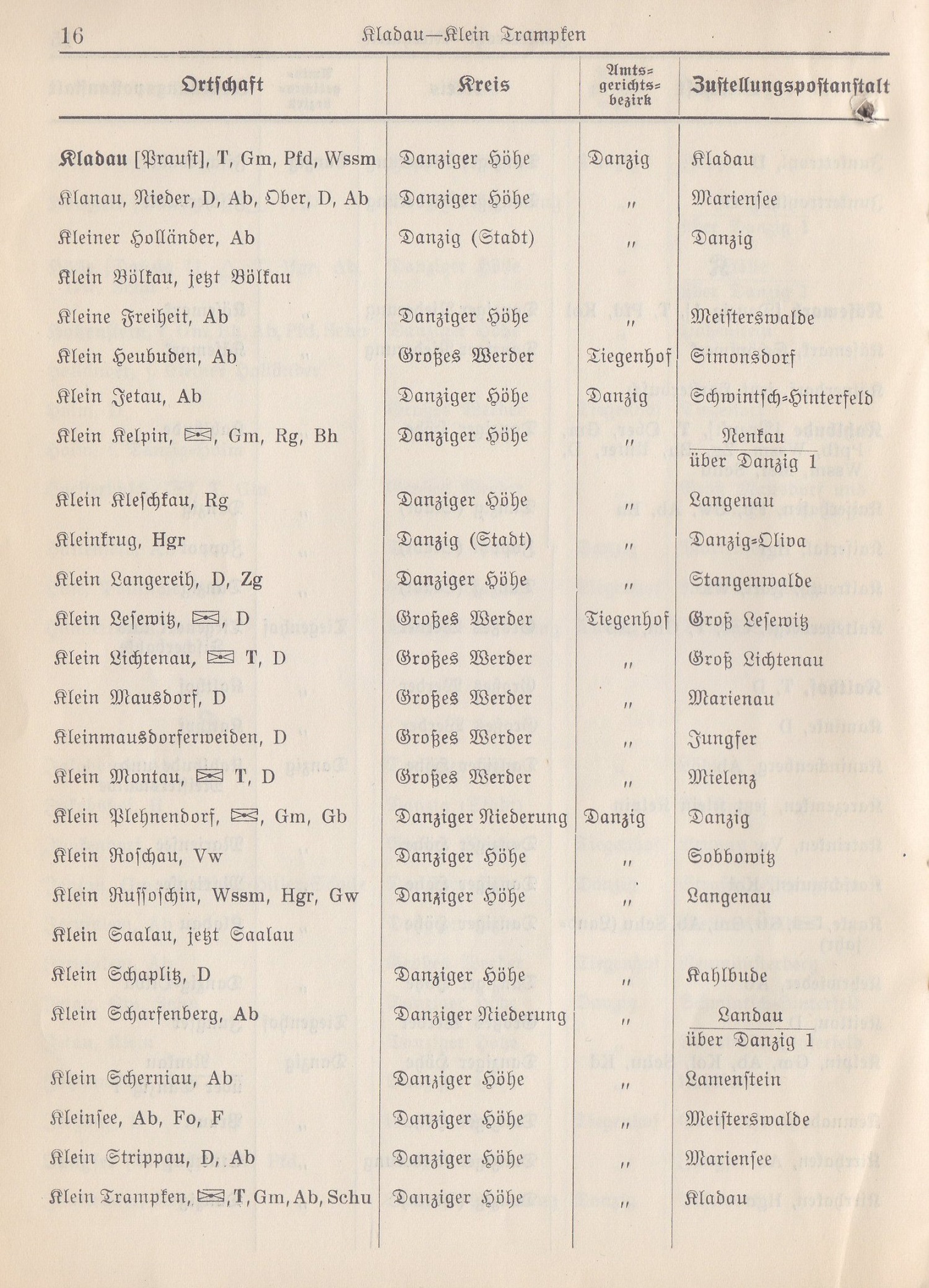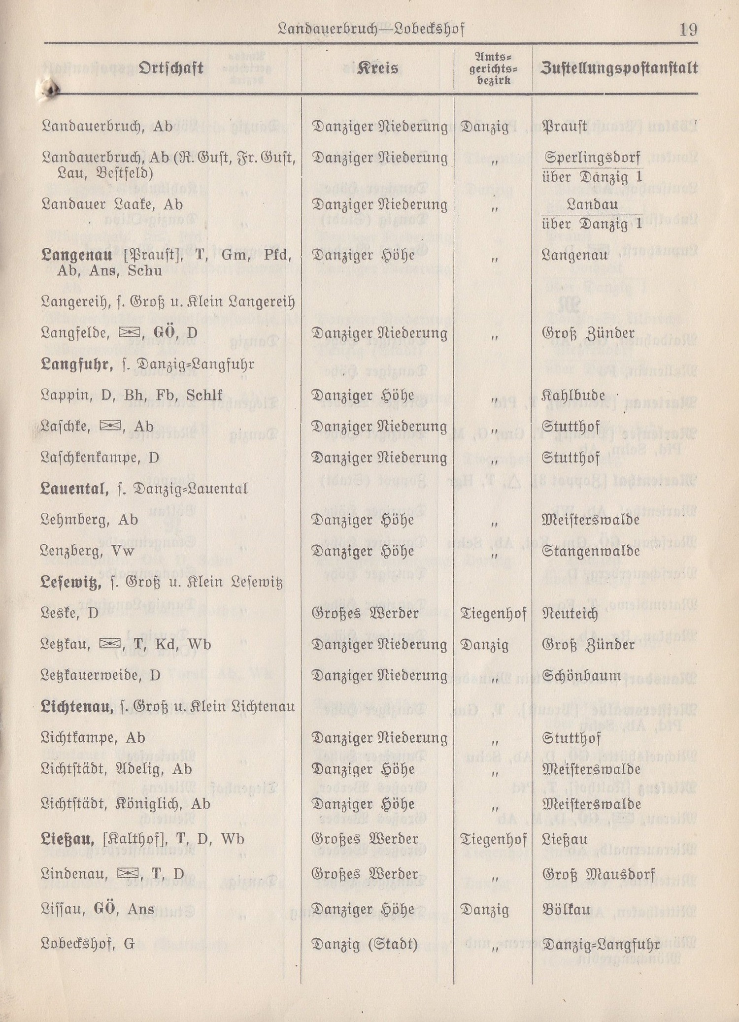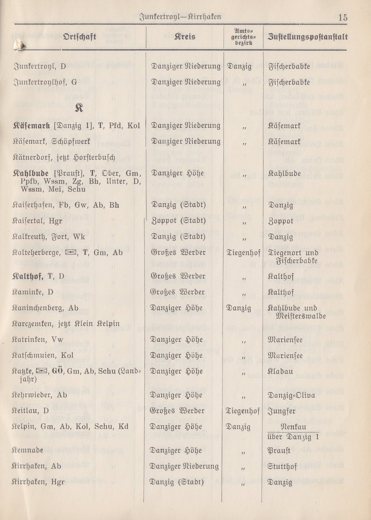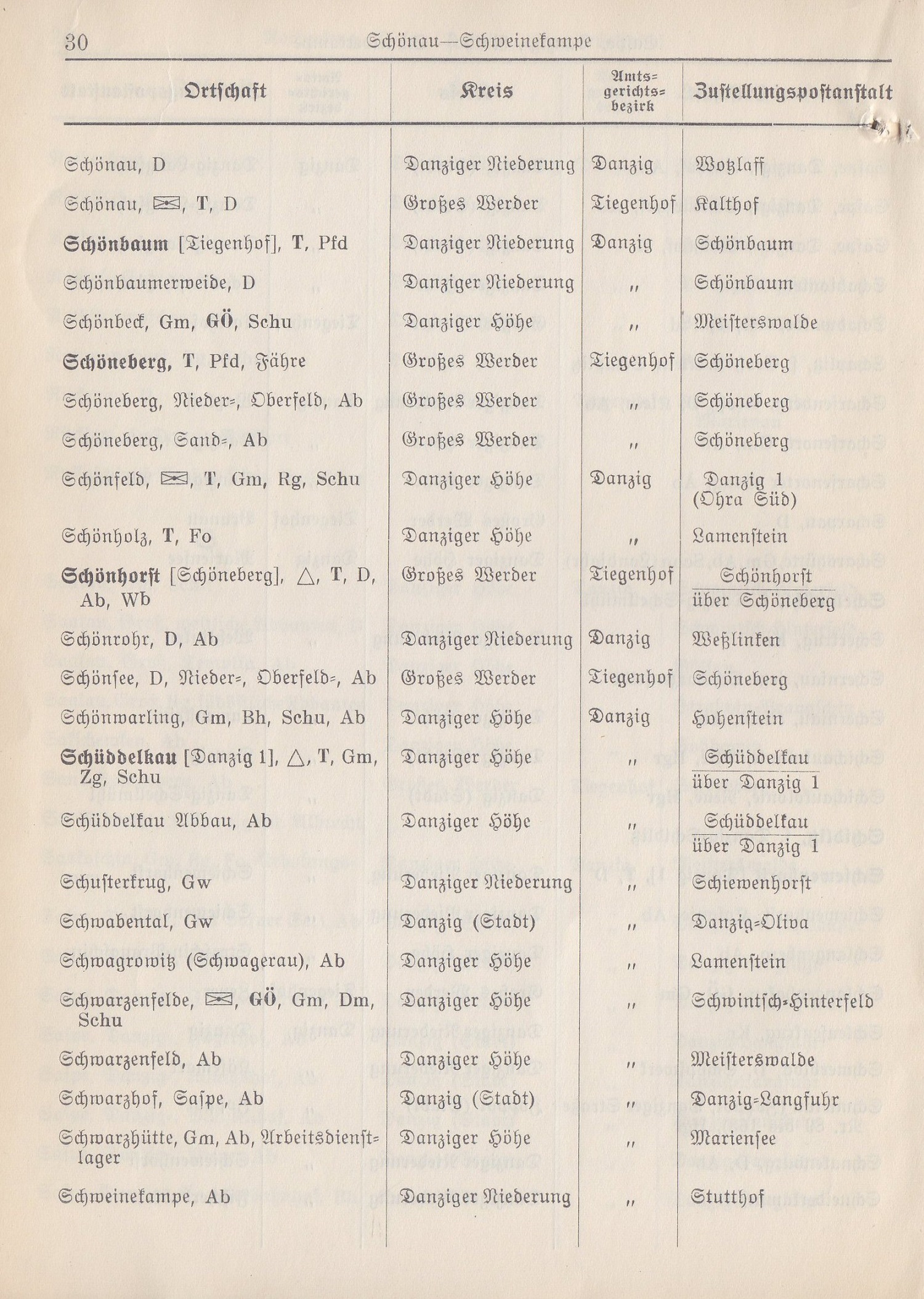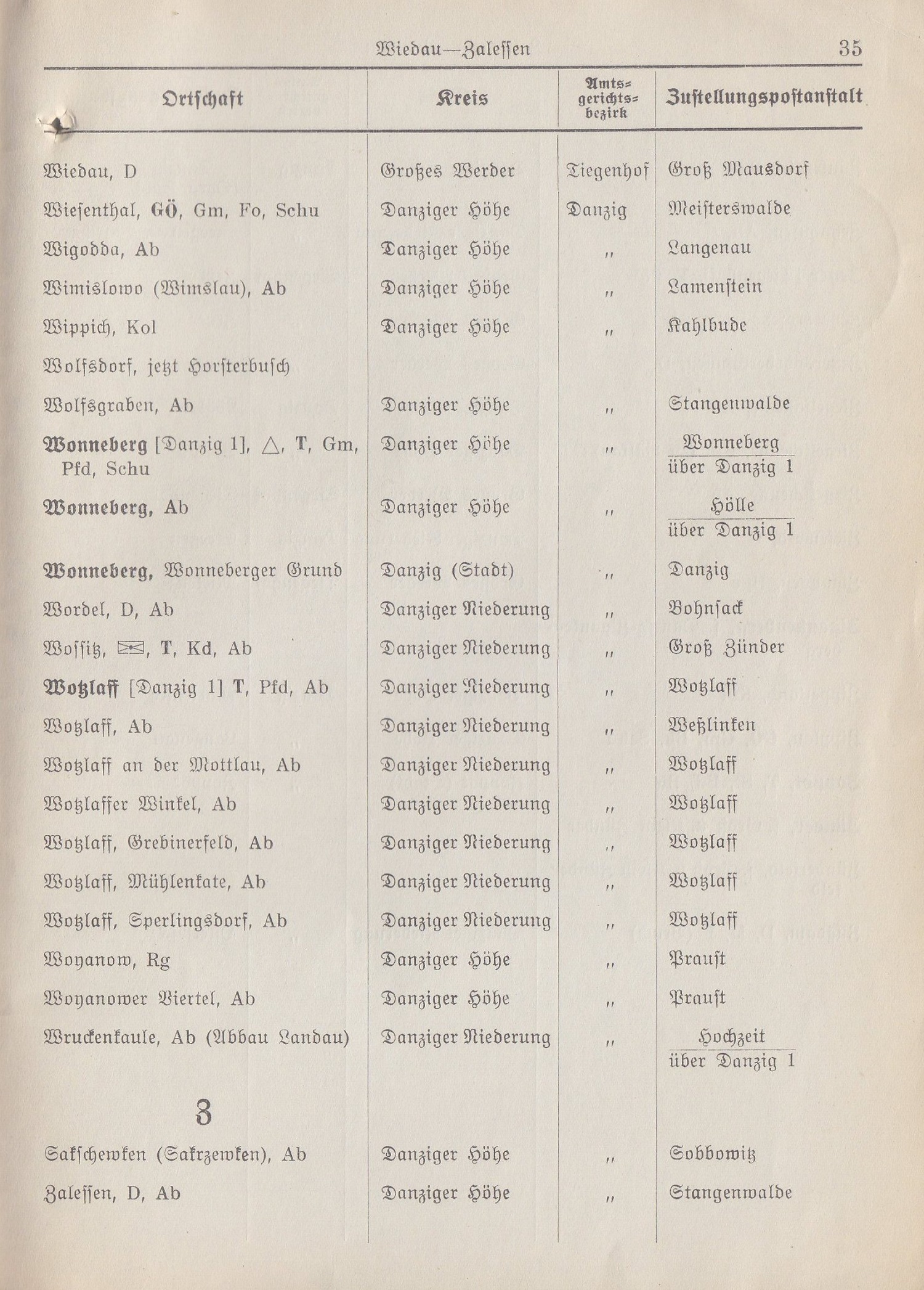 Verzeichnis sämtlicher Ortschaften im Gebeit der Freien Stadt Danzig › 1938 Spis wszystkich miejscowości na terenie Wolnego Miasta Gdańska Wydane do oficjalnego użytku urzędów pocztowych Zbiory Mirosłąwa Piskorskiego A, B, C, D, E, F, G, H, J, K, L, M, N, O, P, Q, R, S, T, U, V, W, Z. ![]() ![]() WYPIS OLIWA ![]() ![]() Str. 5: Conradshammer, Posthilfstelle, Mühle, Gastwirtschaft, Abbau, Ausbau (Pomorska 68) ![]() Str. 6: Danzig-Glettkau [Oliva], Poststelle, Telegraphenanstalt, Bad, Badevort, Gastwirtschaft, Haüfergruppe (Kapliczna) ![]() Str. 7: Danzig-Oliva, Telegraphenanstalt, Vorstadt, Bahnhof, Oberförsterei (Rybińskiego 8) ![]() Str. 9: Ernsttal, Hammerwerk (Bytowska 1, Bytowska 1b) ![]() Str. 9: Freudenthal, Forsthaus, Försterei, Gastwirtschaft (Bytowska 5) ![]() Str. 9: Frischwasser, Abbau, Ausbau (Kościerska) ![]() Str. 12: Günthershof, Hof, Hofstelle (Pomorska 98) ![]() Str. 15: Kehrwieder, Abbau, Ausbau (Zawroty) ![]() Str. 16: Kleinkrug, Haüsergruppe (Grunwaldzka) ![]() Str. 20: Ludolfine, Gut, Gehöft (Czyżewskiego 29) ![]() Str. 24: Pelonken, Hof 1-7, Telegraphenanstalt, Haüsergruppe, Gut, Gehöft, Forsthaus, Försterei (Polanki) ![]() Str. 25: Poggenkrug, Haüsergruppe, Wohnbaracke (Gospody) ![]() Str. 26: Pulvermühle, Gut, Gehöft (Kościerska 12) ![]() Str. 27: Renneberg, Telegraphenanstalt, Forsthaus, Försterei, Haüsergruppe (Spacerowa 1-4) ![]() Str. 30: Schwabental, Gastwirtschaft (Bytowska 4) ![]() Str. 32: Strauchmühle, Gastwirtschaft (Karwieńska 3) ![]() Str. 32: Tiefenthal, Abbau, Ausbau (Kwietna /14-20/)