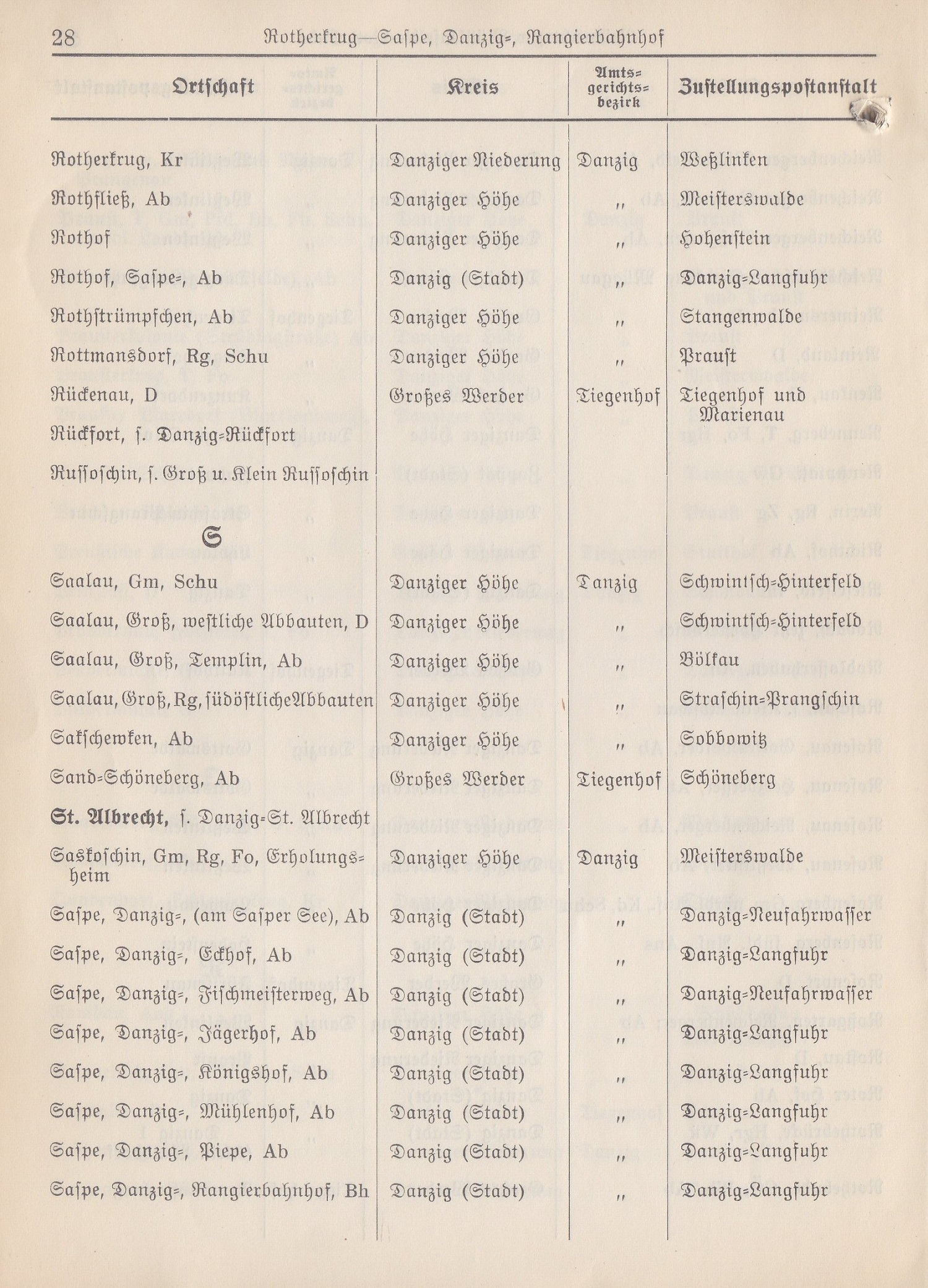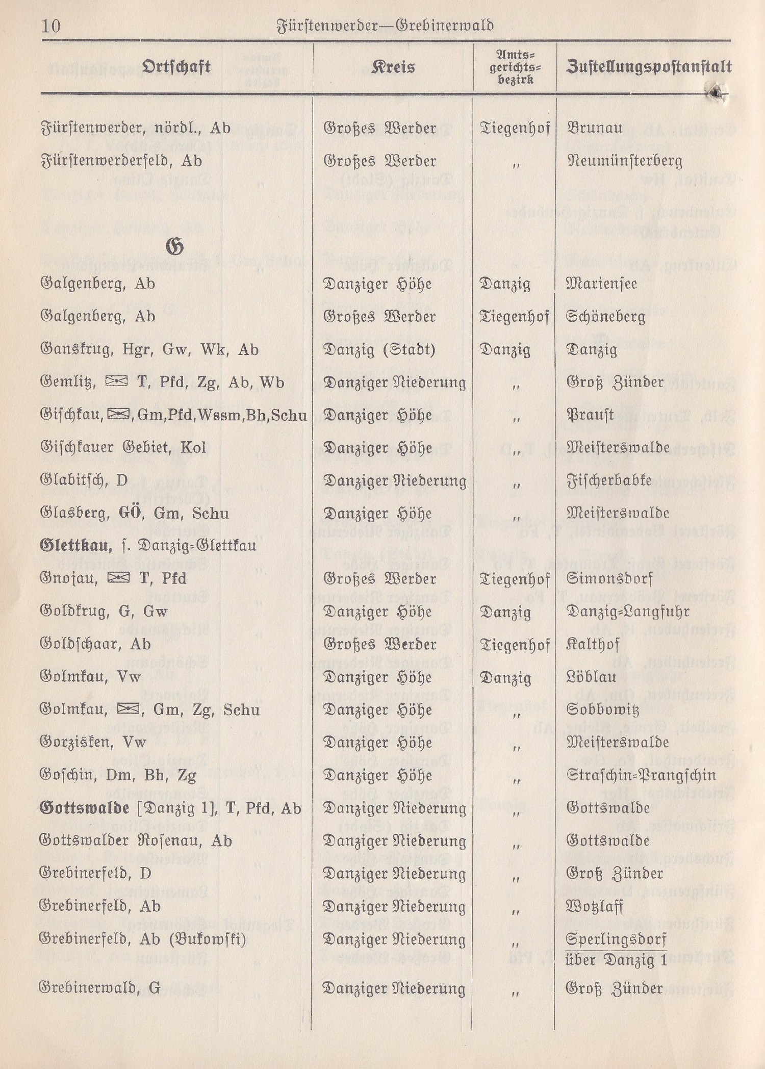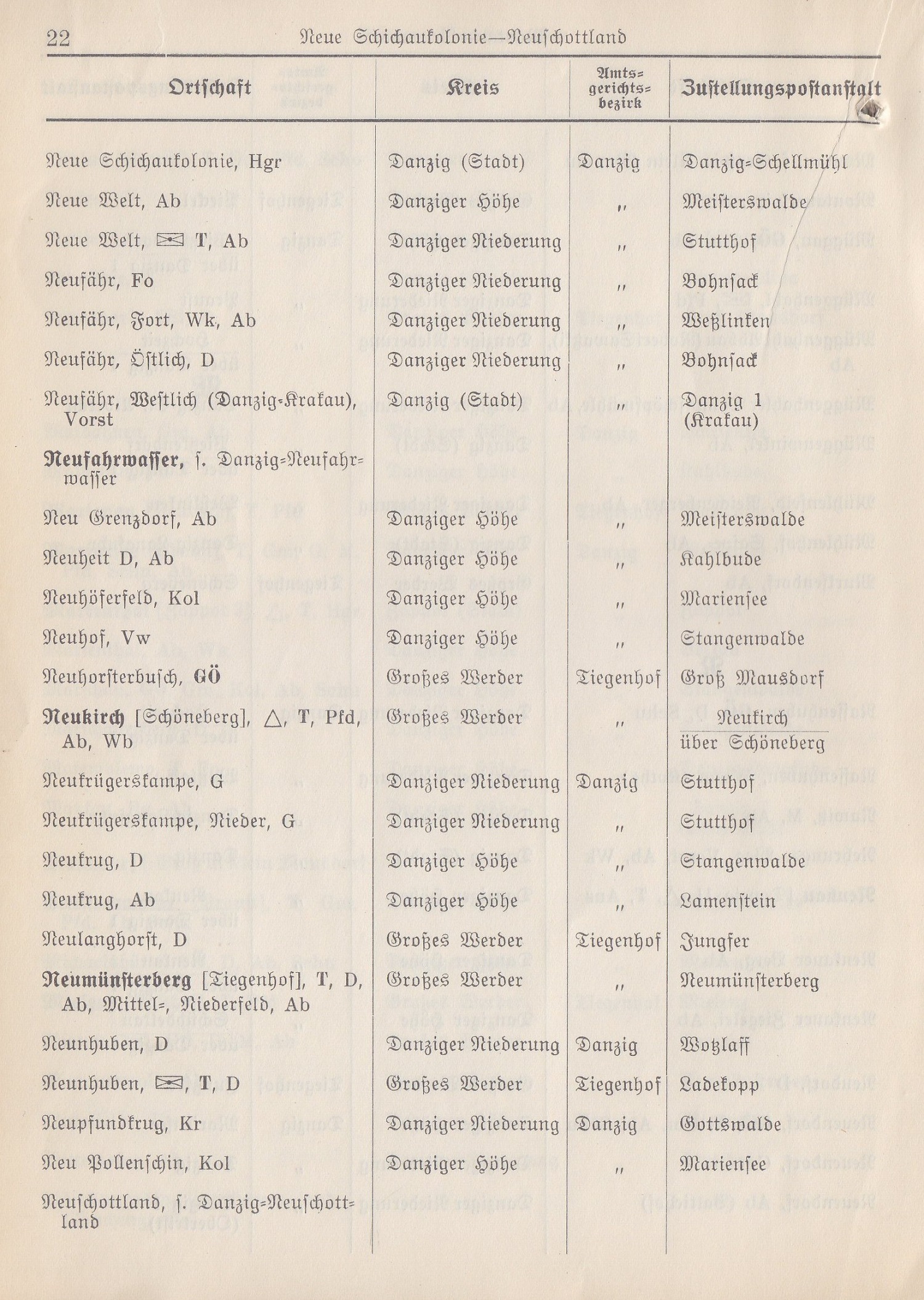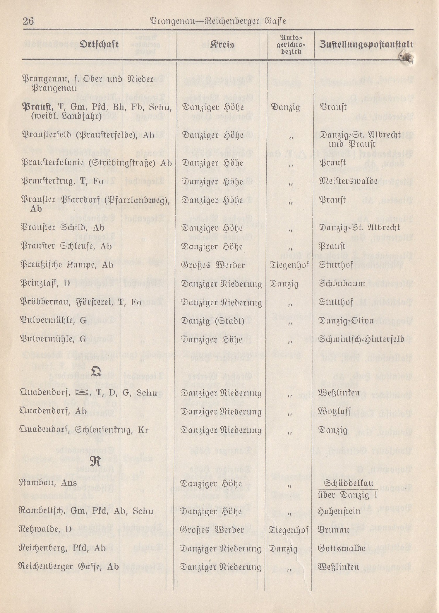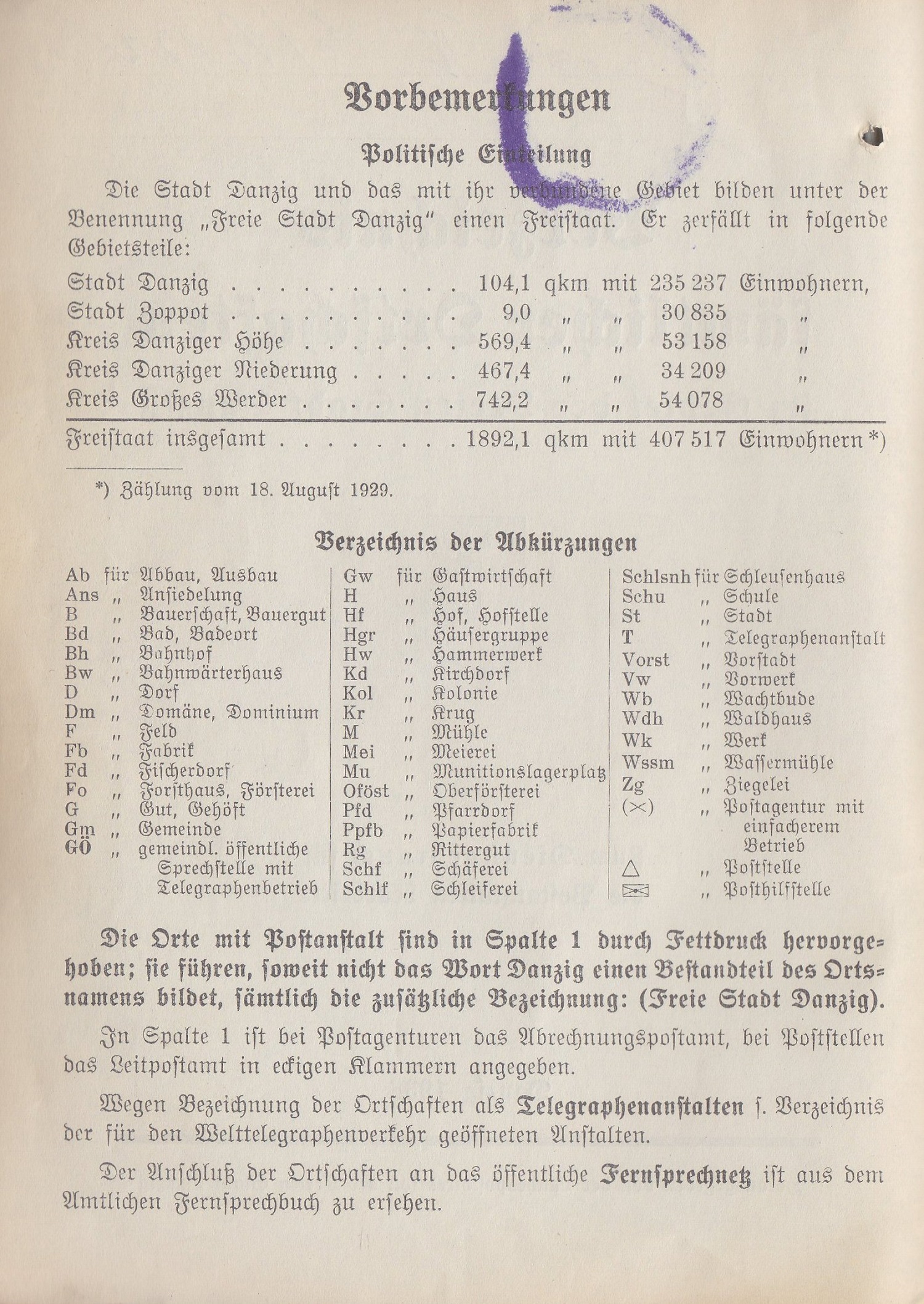 Verzeichnis sämtlicher Ortschaften im Gebeit der Freien Stadt Danzig › 1938 Spis wszystkich miejscowości na terenie Wolnego Miasta Gdańska Wydane do oficjalnego użytku urzędów pocztowych Zbiory Mirosłąwa Piskorskiego A, B, C, D, E, F, G, H, J, K, L, M, N, O, P, Q, R, S, T, U, V, W, Z. ![]() ![]() WYPIS OLIWA ![]() ![]() Str. 5: Conradshammer, Posthilfstelle, Mühle, Gastwirtschaft, Abbau, Ausbau (Pomorska 68) ![]() Str. 6: Danzig-Glettkau [Oliva], Poststelle, Telegraphenanstalt, Bad, Badevort, Gastwirtschaft, Haüfergruppe (Kapliczna) ![]() Str. 7: Danzig-Oliva, Telegraphenanstalt, Vorstadt, Bahnhof, Oberförsterei (Rybińskiego 8) ![]() Str. 9: Ernsttal, Hammerwerk (Bytowska 1, Bytowska 1b) ![]() Str. 9: Freudenthal, Forsthaus, Försterei, Gastwirtschaft (Bytowska 5) ![]() Str. 9: Frischwasser, Abbau, Ausbau (Kościerska) ![]() Str. 12: Günthershof, Hof, Hofstelle (Pomorska 98) ![]() Str. 15: Kehrwieder, Abbau, Ausbau (Zawroty) ![]() Str. 16: Kleinkrug, Haüsergruppe (Grunwaldzka) ![]() Str. 20: Ludolfine, Gut, Gehöft (Czyżewskiego 29) ![]() Str. 24: Pelonken, Hof 1-7, Telegraphenanstalt, Haüsergruppe, Gut, Gehöft, Forsthaus, Försterei (Polanki) ![]() Str. 25: Poggenkrug, Haüsergruppe, Wohnbaracke (Gospody) ![]() Str. 26: Pulvermühle, Gut, Gehöft (Kościerska 12) ![]() Str. 27: Renneberg, Telegraphenanstalt, Forsthaus, Försterei, Haüsergruppe (Spacerowa 1-4) ![]() Str. 30: Schwabental, Gastwirtschaft (Bytowska 4) ![]() Str. 32: Strauchmühle, Gastwirtschaft (Karwieńska 3) ![]() Str. 32: Tiefenthal, Abbau, Ausbau (Kwietna /14-20/)
