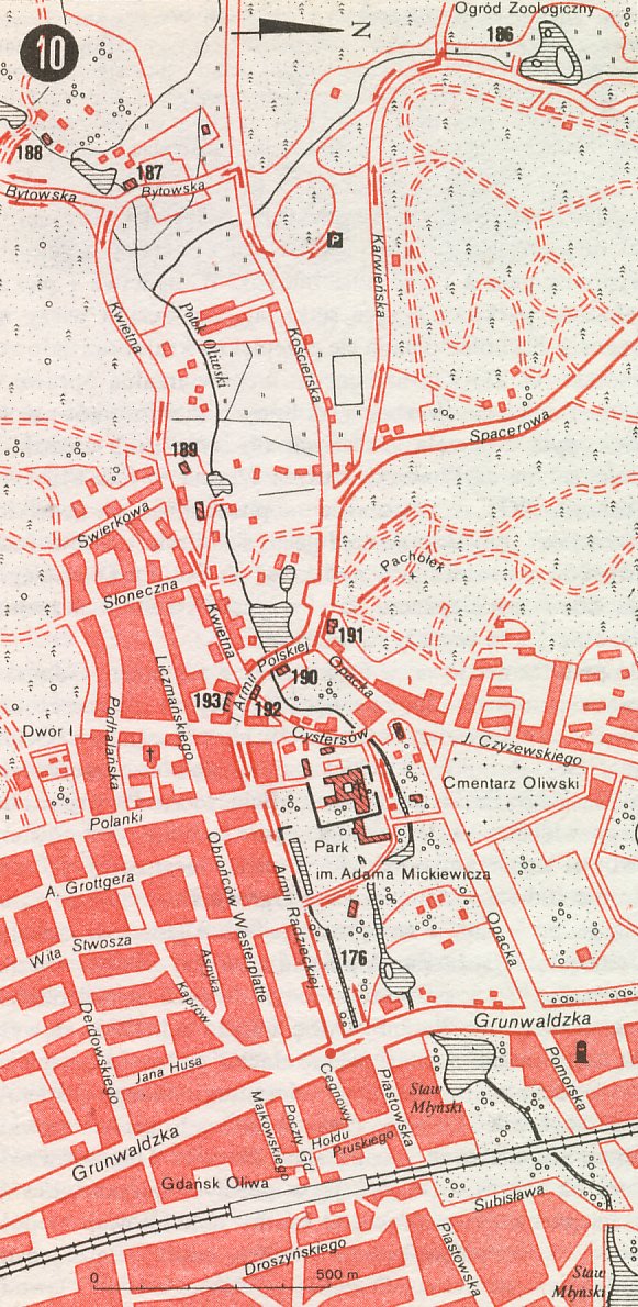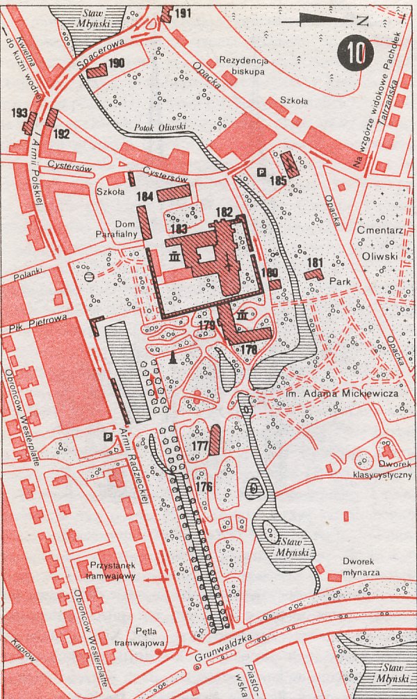 (184) z XV w., której piętro nadbudowano w XVIII w. Spalona w 1945 r. i odbudowana ok. 1960 r. jest od tego czasu siedzibą Kurii Biskupiej. Ul. Cystersów prowadzi w lewo, po XIII-wiecznej tamie młyna klasztornego w kierunku głównej bramy opactwa (poznamy ją pod koniec wędrówki po trasie 10), a w prawo do ul. Opackiej, ku której się udajemy. Po drodze przechodzimy przez mostek nad Potokiem Oliwskim, mijamy parking a po lewej trzy domy z XIX w., być może z zespołu położonego tutaj folwarku klasztornego. Na wysokości pn. krańca parkingu stała Brama św. Jakuba (gospodarcza opactwa). W pobliżu niej wzniesiono ok. 1300 r. kościół parafialny św. Jakuba