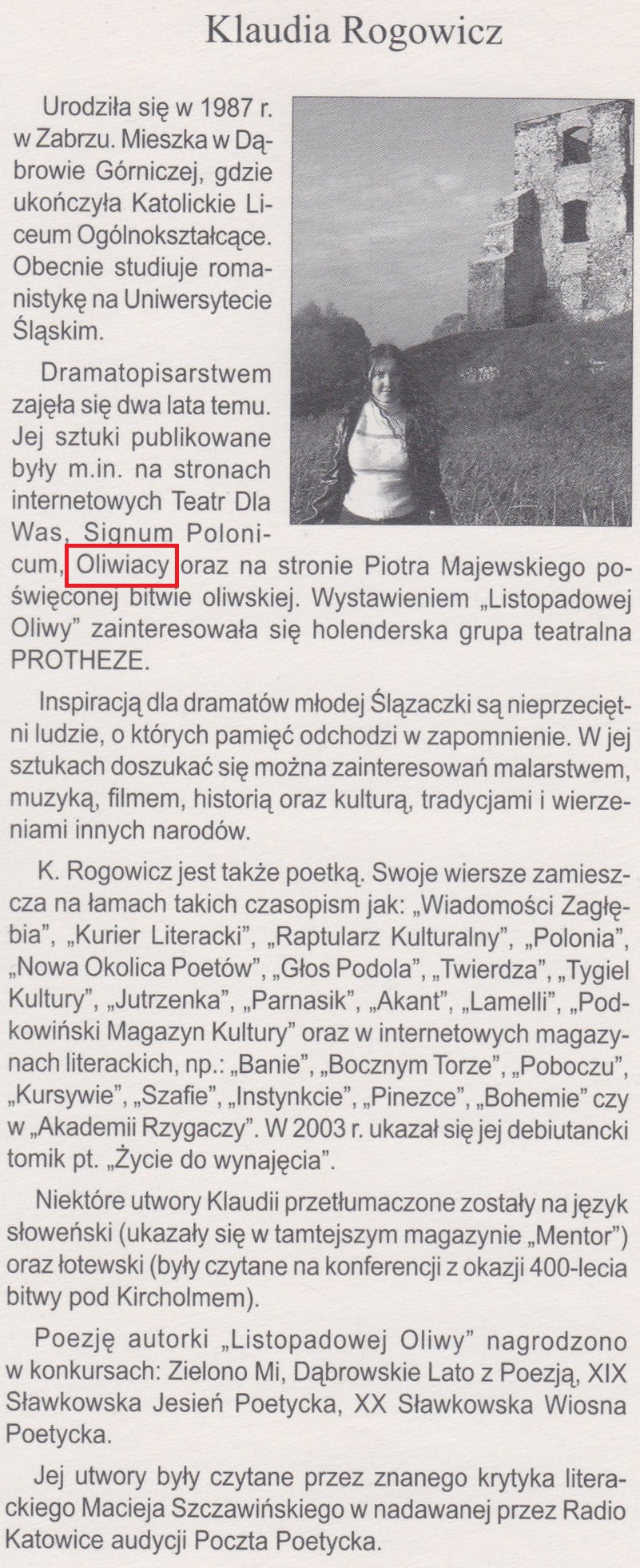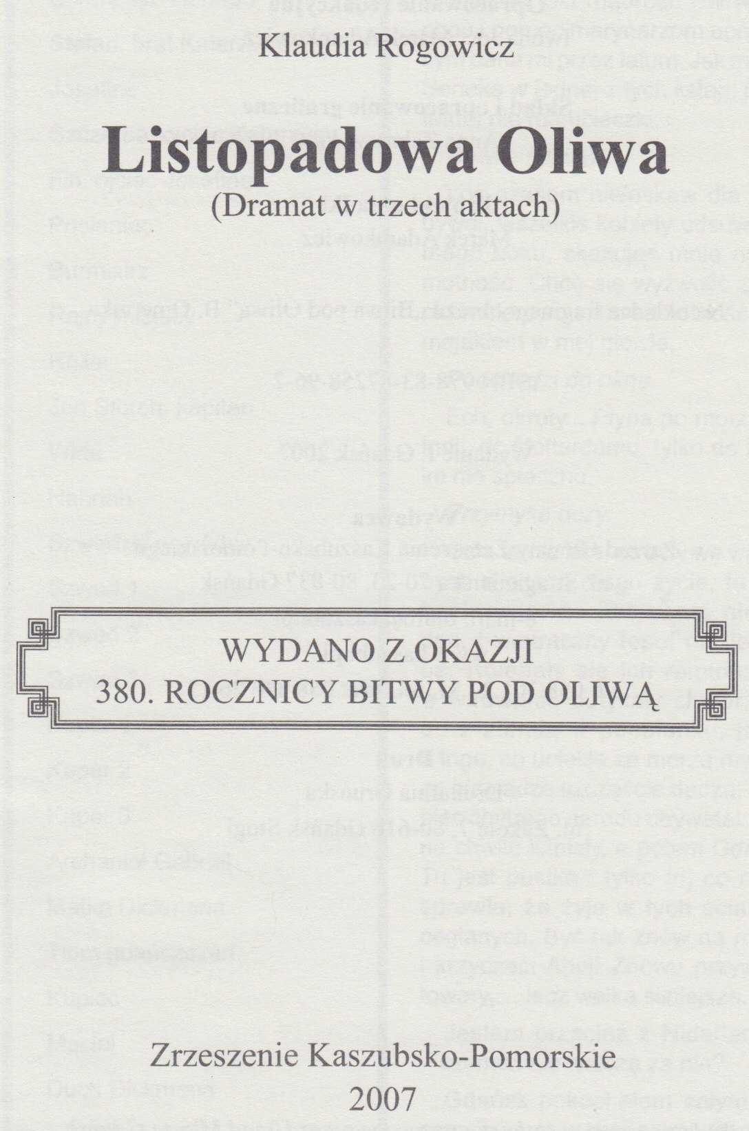 Gdy się narodzi, o ten, co w jej łonie poczęty, Twe imię będzie mieć przybrane, gdy los inaczej zapragnie, bo Bóg już się wypłakał nad Twym męstwem, imię jej będzie Aušra, pierwotne brzmienie litewskiej puszczy i męstwa spod Oliwy progów, tak, choć to Wisłoujście, to Oliwą je nazwę, bo tam żem tą ziemię ujrzał pierwej, by teraz tu, u mistrza swego, żyć.