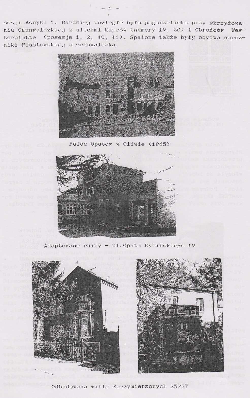sesji Asnyka 1. Bardziej rozległe było pogorzelisko przy skrzyżowaniu Grunwaldzkiej z ulicami Kaprów (numery 19, 20) i Obrońców Westerplatte (posesje 1, 2, 40, 41). Spalone także były obydwa narożniki Piastowskiej z Grunwaldzką.
