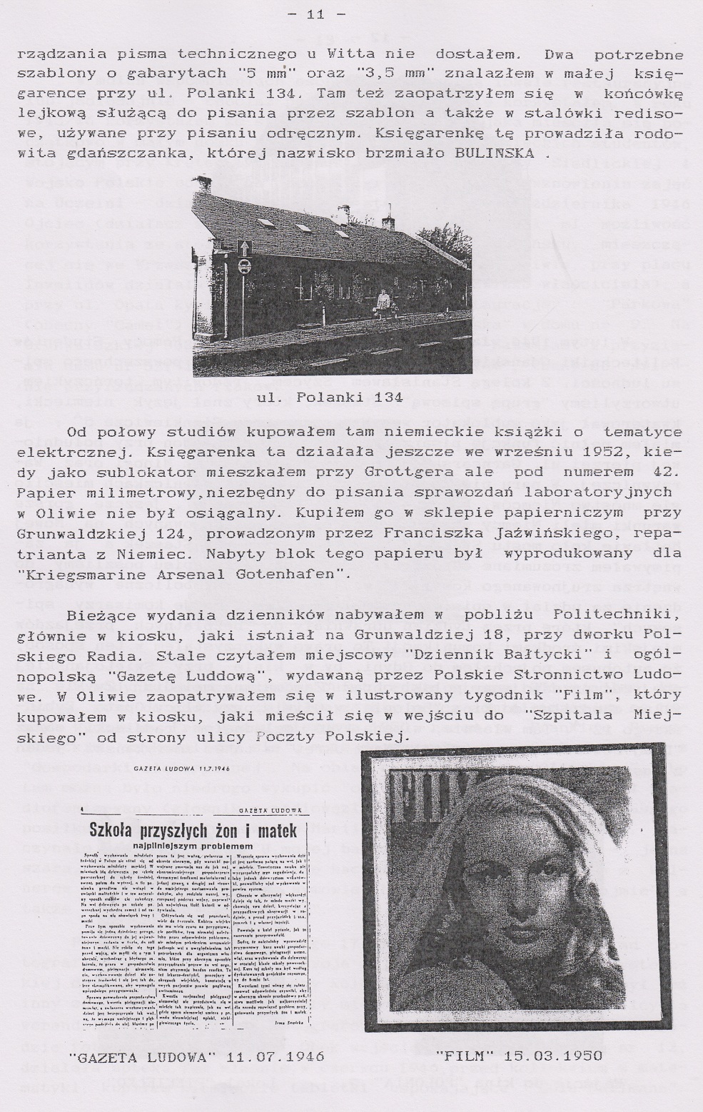 Bieżące wydania dzienników nabywałem w pobliżu Politechniki, głównie kiosku, jaki istniał na Grunwaldzkiej 18, przy dworku Polskiego Radia. Stale czytałem miejscowy "Dziennik Bałtycki" i ogólnopolską "Gazetę Ludową", wydawaną przez Polskie Stronnictwo Ludowe. W Oliwie zaopatrywałem się w ilustrowany tygodnik "Film", który kupowałem w kiosku, jaki mieścił się w wejściu do "Szpitala Miejskiego" od strony ulicy Poczty Polskiej.