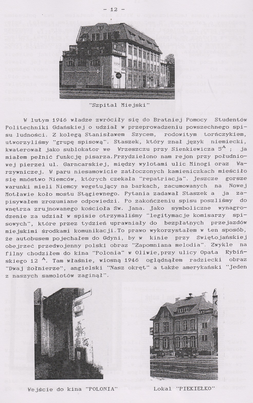 W lutym 1946 władze zwróciły się do Bratniej Pomocy Studentów Politechniki Gdańskiej o udział w przeprowadzeniu powszechnego spisu ludności. Z kolegą Stanisławem Szycem, rodowitym toruńczykiem, utworzyliśmy "grupę spisową". Staszek, który znał język niemiecki, kwaterował jako sublokator we Wrzeszczu przy Sienkiewicza 59; ja miałem pełnić funkcję pisarza. Przydzielono nam rejon przy południowej pierzei ul. Garncarskiej, między wylotami ulic Minogi oraz Warzywniczej. W paru niesamowicie zatłoczonych kamieniczkach mieściło się mnóstwo Niemców, których czekała "repatriacja". Jeszcze gorsze warunki mieli Niemcy Wegetujący na barkach, zacumowanych na Nowej Motławie koło mostu Stągiewnego. Pytania zadawał Staszek a ja zapisywałem zrozumiane odpowiedzi. Po zakończeniu spisu poszliśmy do wnętrza zrujnowanego kościoła Św. Jana. Jako symboliczne wynagrodzenie za udział w spisie otrzymaliśmy "legitymacje komisarzy spisowych", które przez tydzień uprawniały do bezpłatnych przejazdów miejskimi środkami komunikacji.