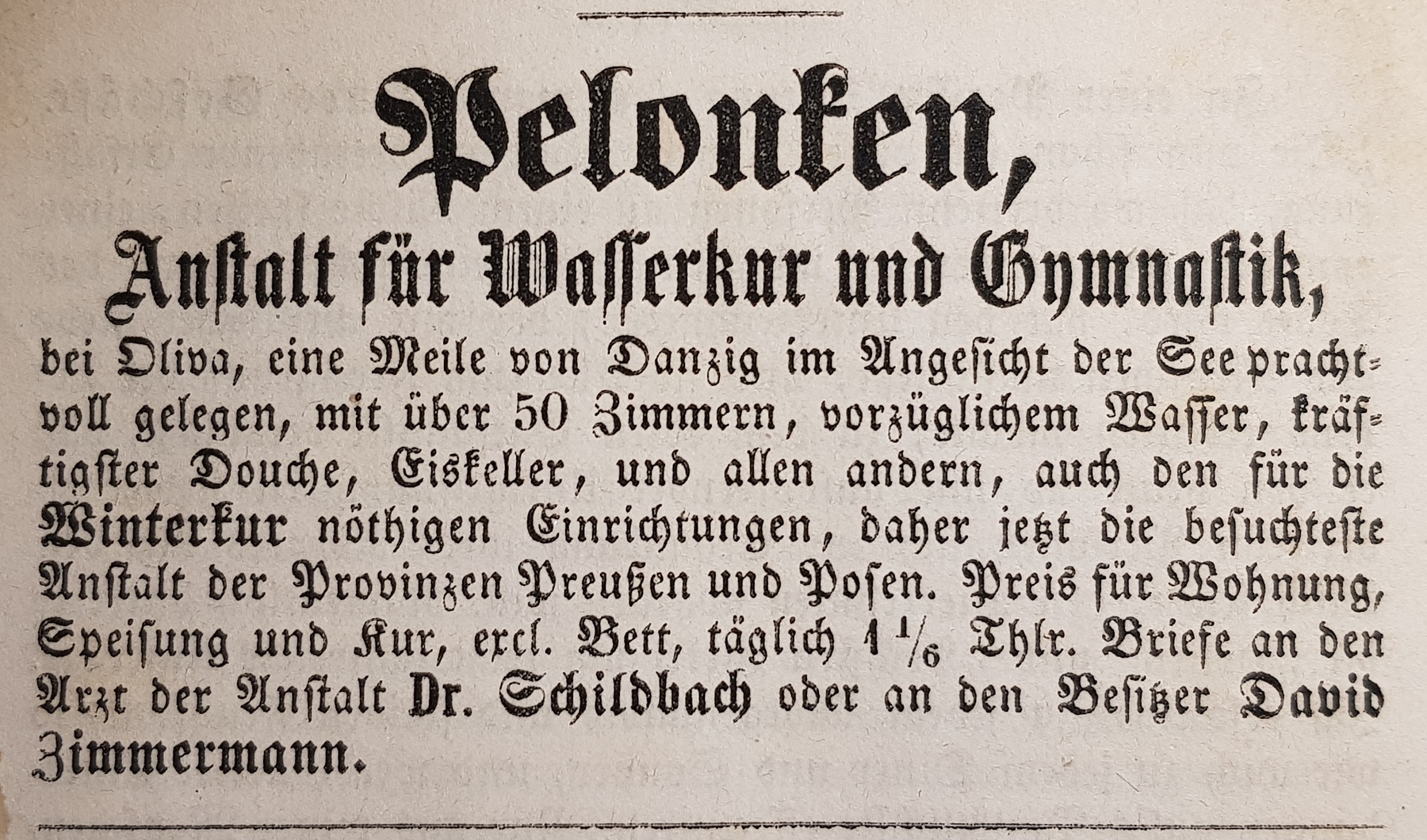 Niedaleko Oliwy, milę od Gdańska, nad brzegiem morza, jest wspaniale położony zakład wód leczniczych , z ponad 50 pokojami, doskonałą wodą, najsilniejszym prysznicem, piwnicą lodową i wszystkimi innymi udogodnieniami, w tym urządzeniami niezbędnymi do zimowej kuracji , dlatego teraz jest to najczęściej odwiedzana placówka w prowincjach Prus i Poznania. Cena za mieszkanie, wyżywienie i leczenie, bez łóżka, dziennie 1 i 1/6 talara. Listy do lekarza placówki dr. Schildbacha lub do właściciela Davida Zimmermana.