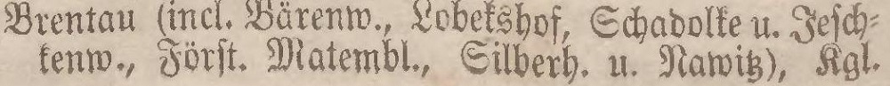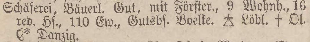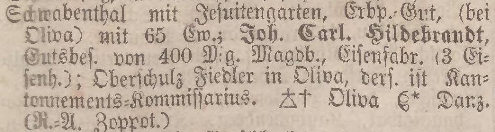 Schwabenthal mit Jesuitengarten, Erbp.-Gut, (bei Oliva) mit 65 Ew.; Joh. Carl. Hildebrandt, Gutsbes. von 400 Mig. Magdb., Eisenfabr. (3 Eisenh.); Oberschulz Fiedler in Oliva, ders. ist Kantonnements-Kommissarius. Evang. Kirche, kathol. Kirche Oliva, Post-Erpedition Danzig (Rientamt Zoppot).