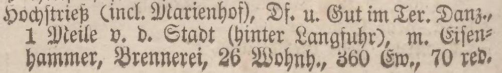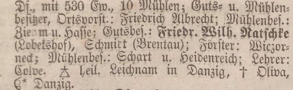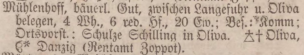 Mühlenhoff, bäuerl. Gut, zwischen Langefuhr u. Oliva belegen, 4 Wh., 6 red. Hf., 20 Ew.; Bef.: Komm; Ortsvorst.: Schulze Schilling in Oliva. Evang. Kirche, kathol. Kirche Oliva, Post-Erpedition Danzig. (Rientamt Zoppot).
