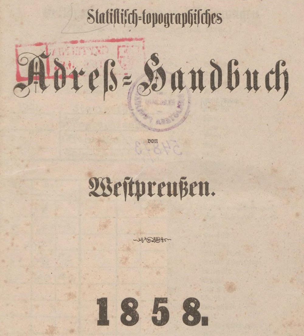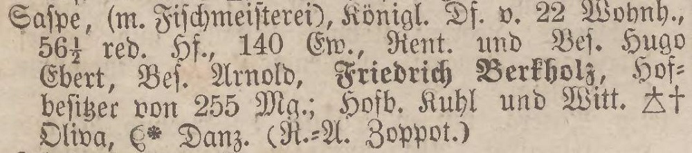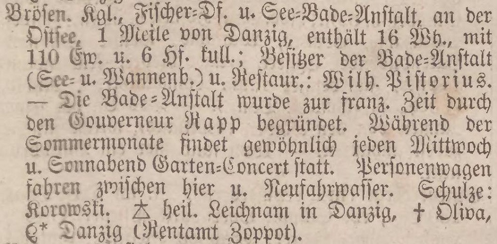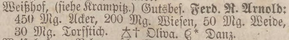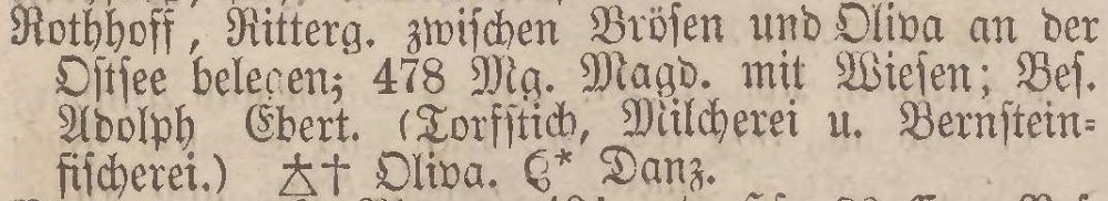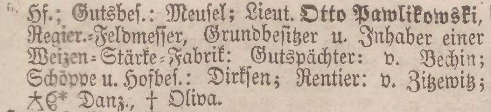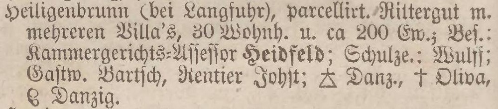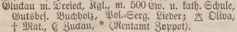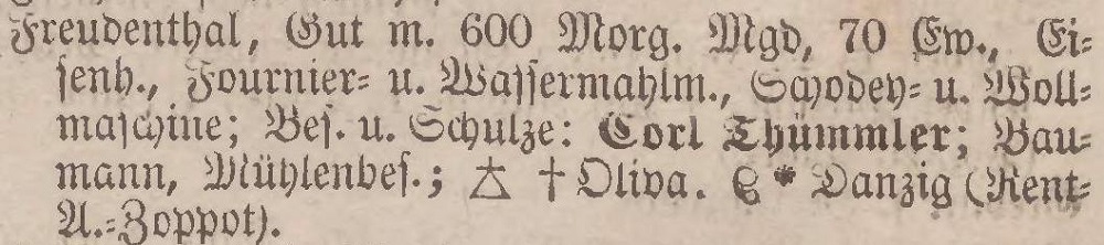 Freudenthal, Gut m. 600 Morg. Mgd, 70 Em., Eisenb., Fournier u. Wassermahim., Schodey u. Wollmaschine; Bes. u. Schulze: Carl Thümmler; Baumann, Mühlenbes.; Evang. Kirche, kathol. Kirche Oliva, Post-Erpedition Danzig (Rientamt Zoppot).