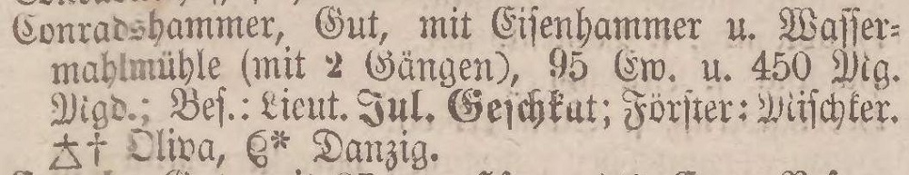 Conradshammer, Gut, mit Eisenhammer u. Wassermahlmühle (mit 2 Gängen), 95 Ew. u. 450 Aig. Aigd.; Bes.: Lieut. Jul. Geschkat; Förster: Asischker. Evang. Kirche, kathol. Kirche Oliva, Post-Erpedition Danzing.