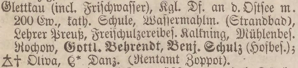 Glettkau (incl. Frischwasser), Kgl. Df. an d. Ostsee m. 200 Ew., tath. Schule, Wassermahlm. (Strandbad), Lehrer Preuß, Freischulzereibes. Kaltning, Mühlenbes. Rochow, Gottl. Behrendt, Benj. Schulz (Hofbes.); Evang. Kirche, kathol. Kirche Oliva, Post-Erpedition Danzig. (Rientamt Zoppot).