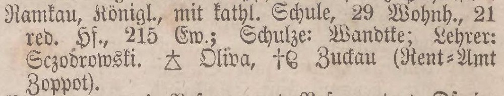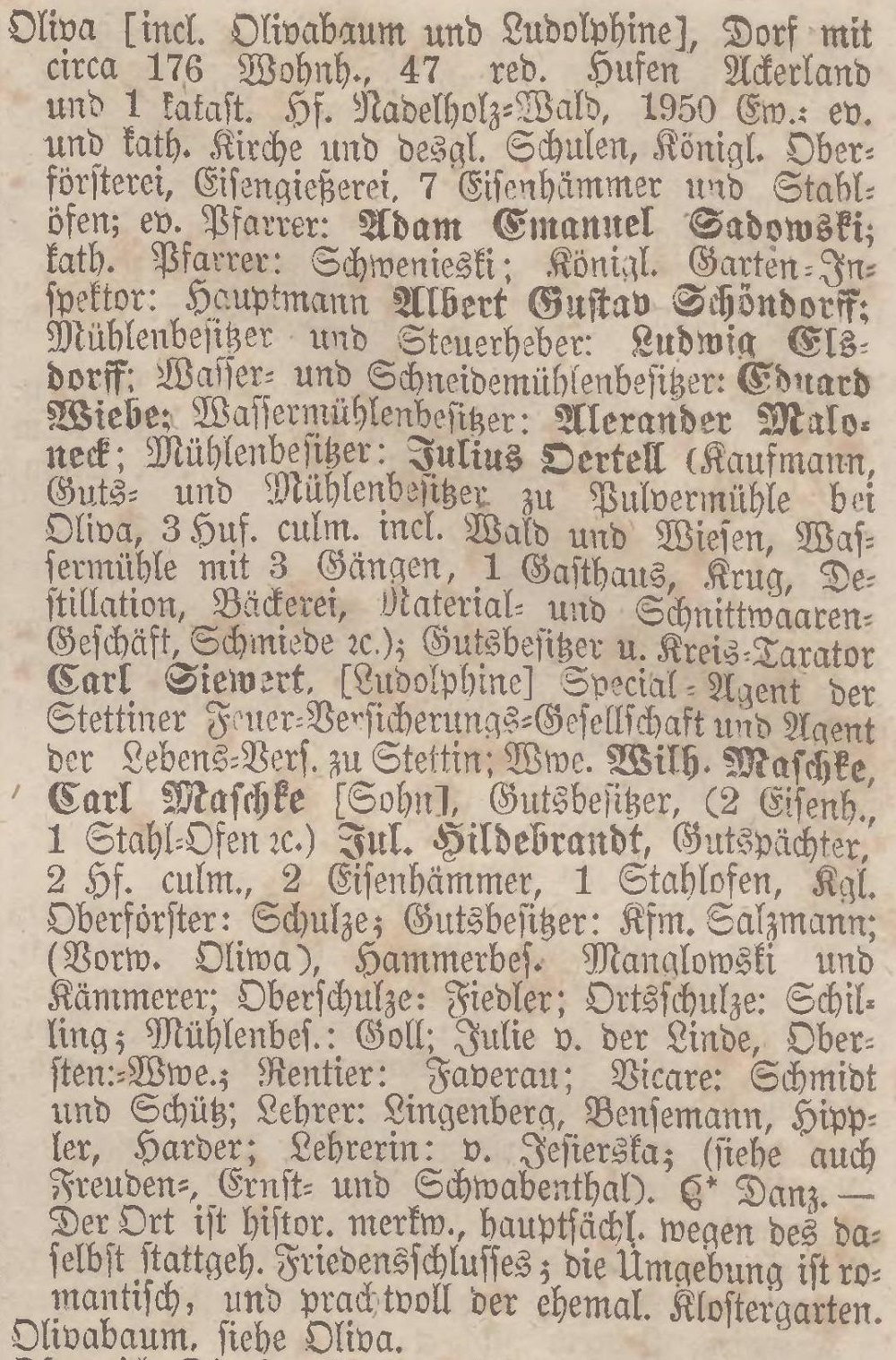 Oliva [incl. Olivabaum und Ludolphine], Dorf mit circa 176 Wohnh., 47 red. Hufen Ackerland und 1 katast. Hf. Nadelholz-Wald, 1950 Ew.: ev. und kath. Kirche und desal. Schulen, Königl. Oberförsterei, Eisengießerei. 7 Eisenhämmer und Stahlöfen; ev. Pfarrer: Adam Emanuel Sadowski; kath. Pfarrer: Schweniesti; Königl. Garten-Inspektor: Hauptmann Albert Gustav Schöndorff; Müblenbesizer und Steuerbeber: Ludwig Elsdorff; Wasser und Schneidemühlenbesizer: Eduard Wiebe; Wassermühlenbesizer: Alerander Maloneck; Mühlenbesizer: Julius Dertell (Kaufmann, Guts und Mühlenbesizer zu Pulvermühle bei Oliva, 3 Huf. culm. incl. Wald und Wiesen, Wasfermühle mit 3 Gängen, 1 Gasthaus, Krug, Destillation, Bäckerei, Material und Schnittwaaren Geschäft, Schmiede Amt.); Gutsbesitzer u. Kreis-Tarator Carl Siewert. [Lubolphine] Special Agent der Stettiner Feuer-Versicherungs-Gesellschaft und Agent der Lebens-Vers. zu Stettin; Wwe. Wilh. Maschke, Carl Maschke [Sohn], Gutsbesizer, (2 Eisenh., 1 Stahl-Ofen Amt.) Jul. Hildebrandt, Gutspächter, 2 Hf. culm., 2 Eisenbämmer, 1 Stahlofen, Kgl. Oberförster: Schulze; Gutsbesizer: Kfm. Salzmann; (Vorm. Oliwa), Hammerbes. Manglowski und Kämmerer; Oberschulze: Fiedler; Ortsschulze: Schilling; Mühlenbes.: Goll; Julie v. der Linde, Obersten: Wwe.; Rentier: Faverau; Vicare: Schmidt und Schüt; Lehrer: Lingenberg, Bensemann, Hippler; Harder; Lehrerin: v. Jesierska; (siehe auch Freuden, Ernst und Schwabenthal). Post-Erpedition Danzig. - Der Ort ist histor. merkw., hauptsächl. wegen des da selbst stattgeh. Friedensschlusses; die Umgebung ist romantisch, und prachtvoll der ehemal. Klostergarten.